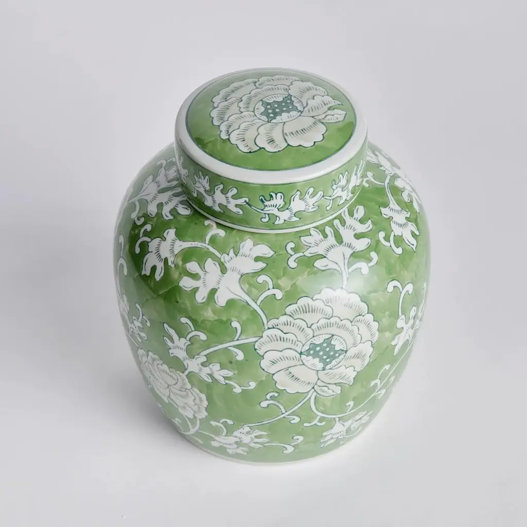 In a shades of earthy and fresh greens with beautiful floral details, this lidded Lotus jar is a serene and harmonizing accent piece. A welcome addition, adding stability and calm to the well-appointed bookshelf, mantel or entry console.