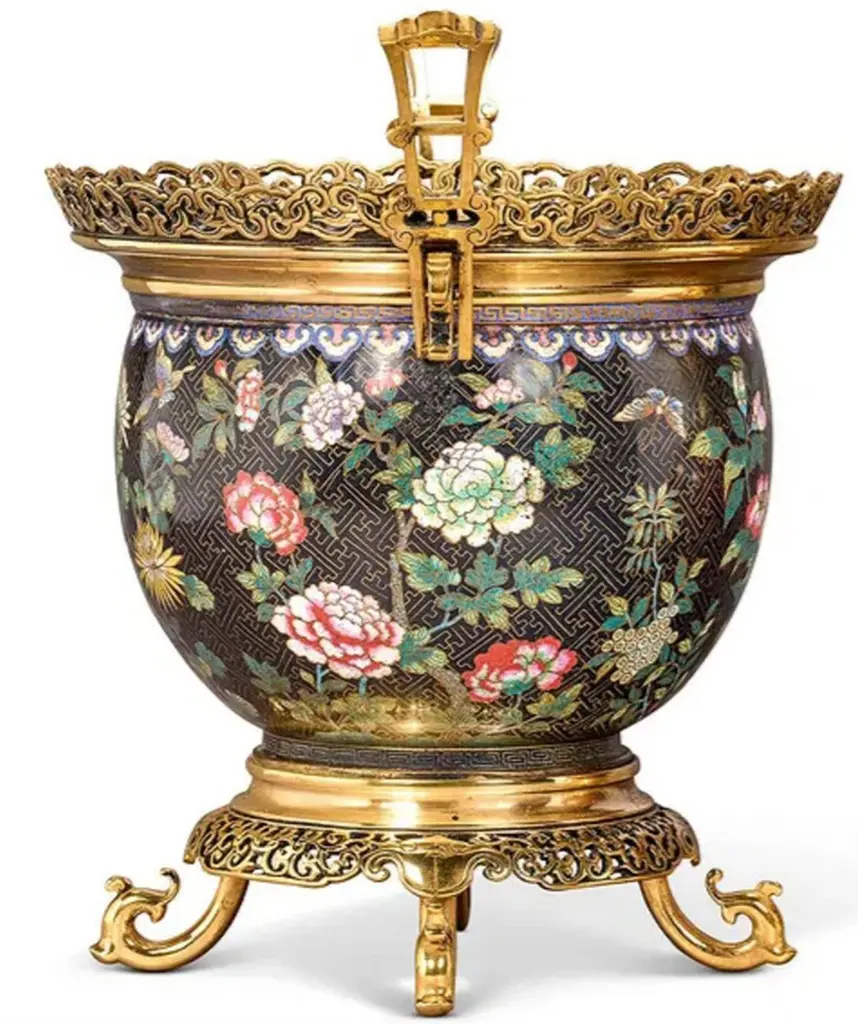 A dual-handled jardinière with black cloisonne ornamented with flowers, butterflies and foliage.Origin: France, Paris Date: Last quarter of the 19th Century Stamped F. BARBEDIENNE at the foot 11.25 in. (20.5 cm.) high, 13 3/8 in. (34 cm.) wide .