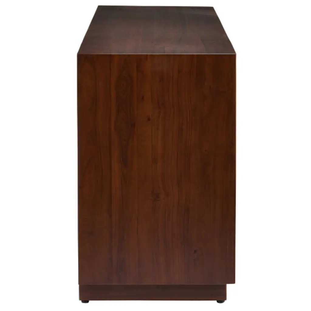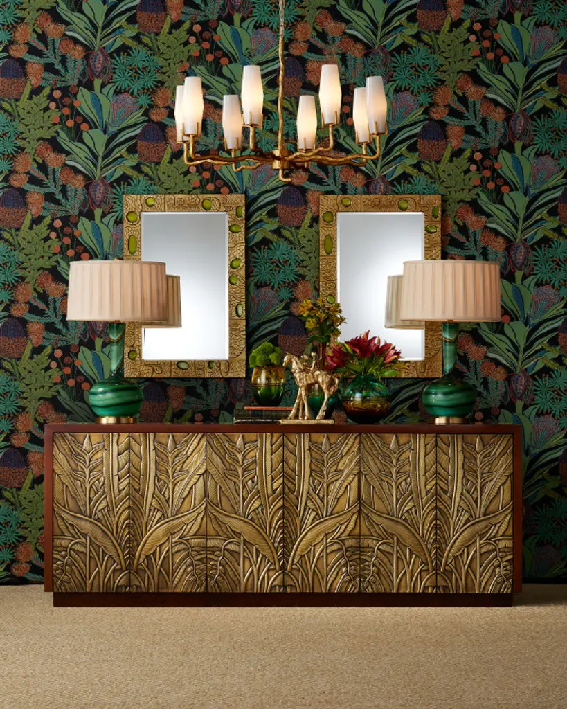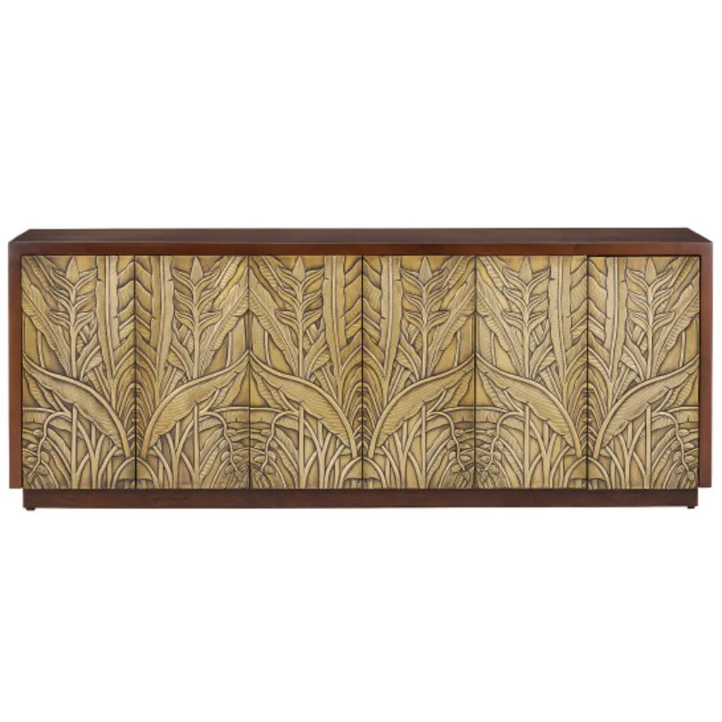 The Jardin Credenza is a masterful blend of artistry and sustainability, crafted in the tradition of repoussage. Its striking façade features intricate leafy motifs in metal that complement the warmth of the wood. With its refined craftsmanship and timeless appeal, the Jardin Credenza serves as both a functional storage piece and an elegant focal point.