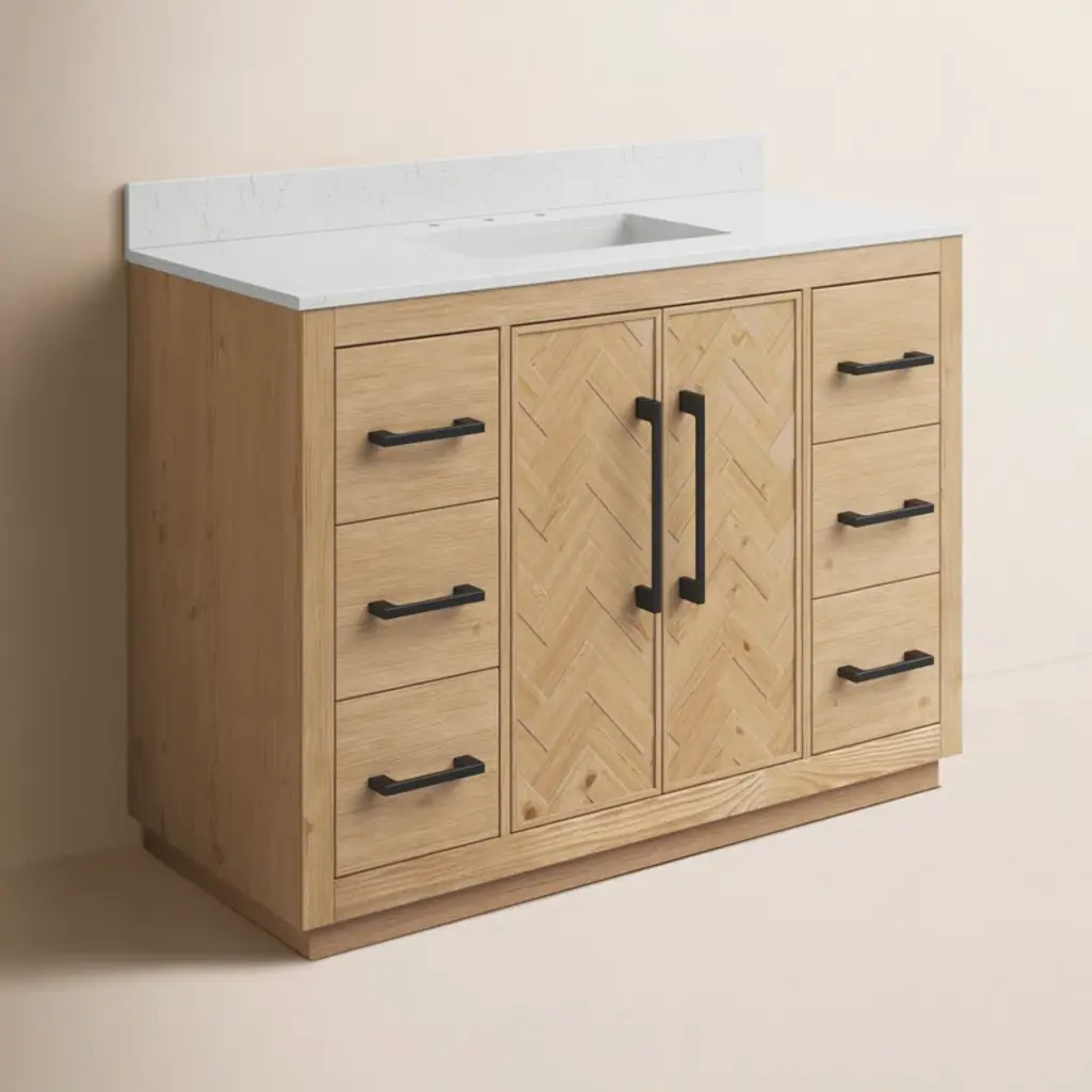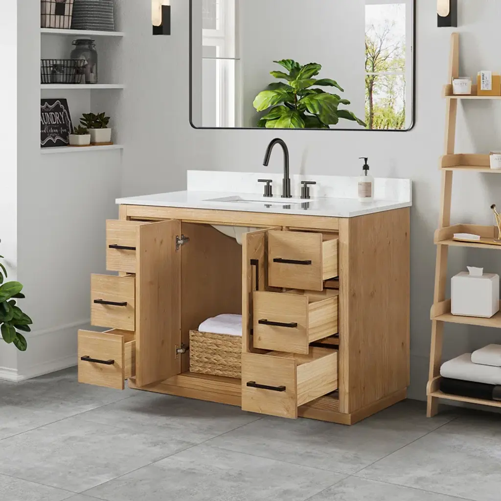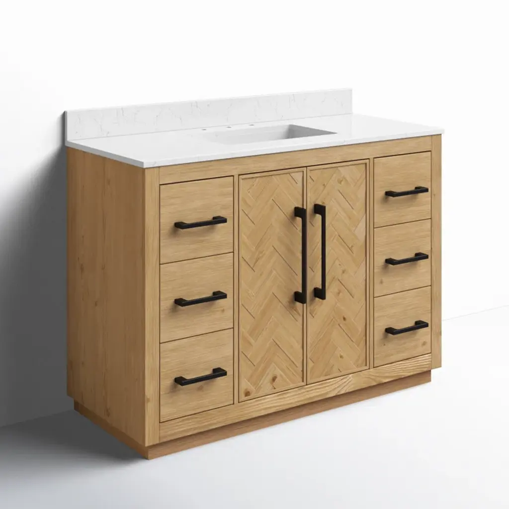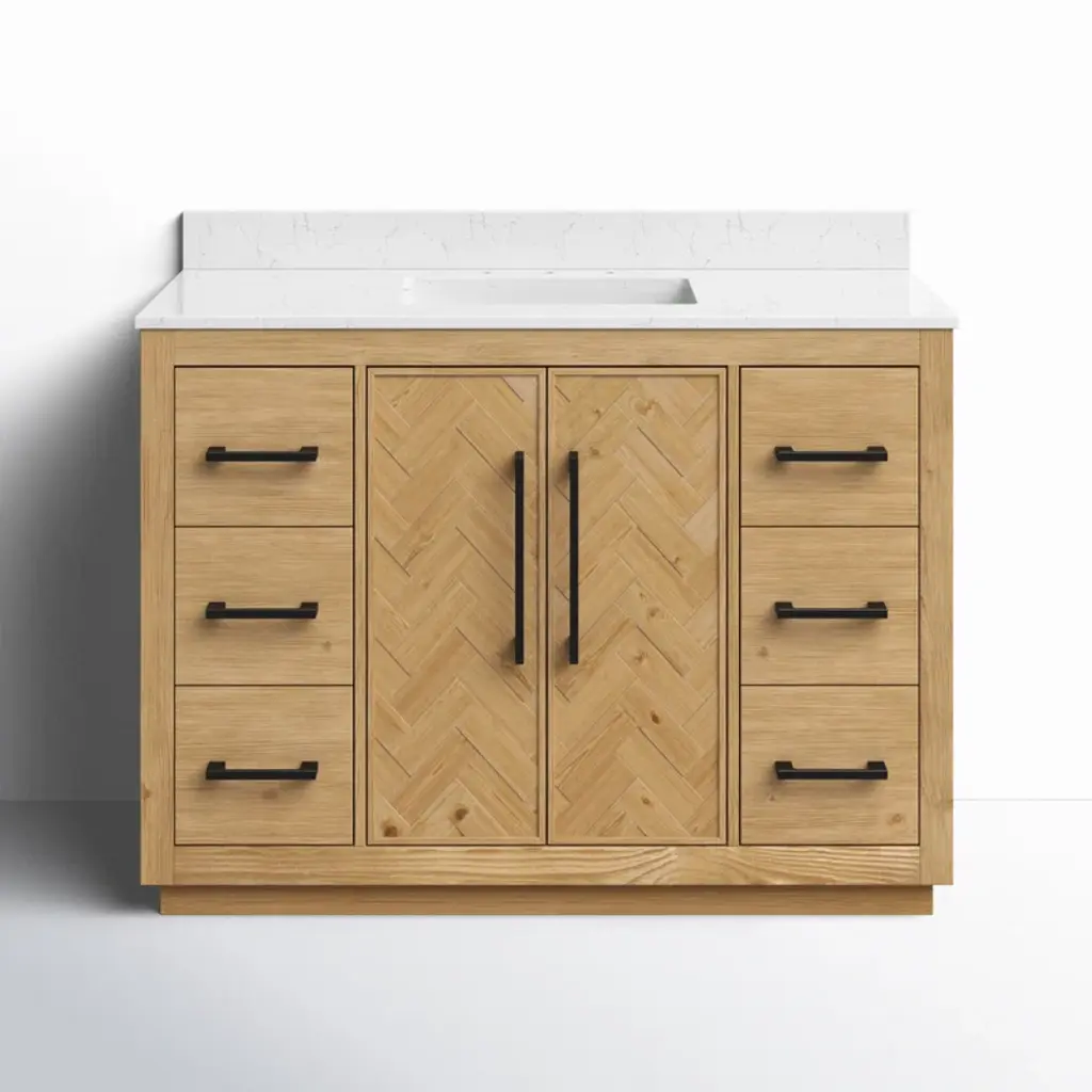 This 48'' single vanity brings a classic feel to your bathroom remodel. Made from solid and engineered wood in a weathered fir finish, it features a solid base and herringbone paneling, while the top is capped in a white engineered stone countertop for a crisp look. Six functional drawers and two cabinet doors open up to space for all your bathroom essentials, cleaning supplies, and extra toiletries – with room left over for folded towels and toilet paper. Three pre-drilled holes in the marble make it easy to add a faucet (sold separately) alongside the included sink.