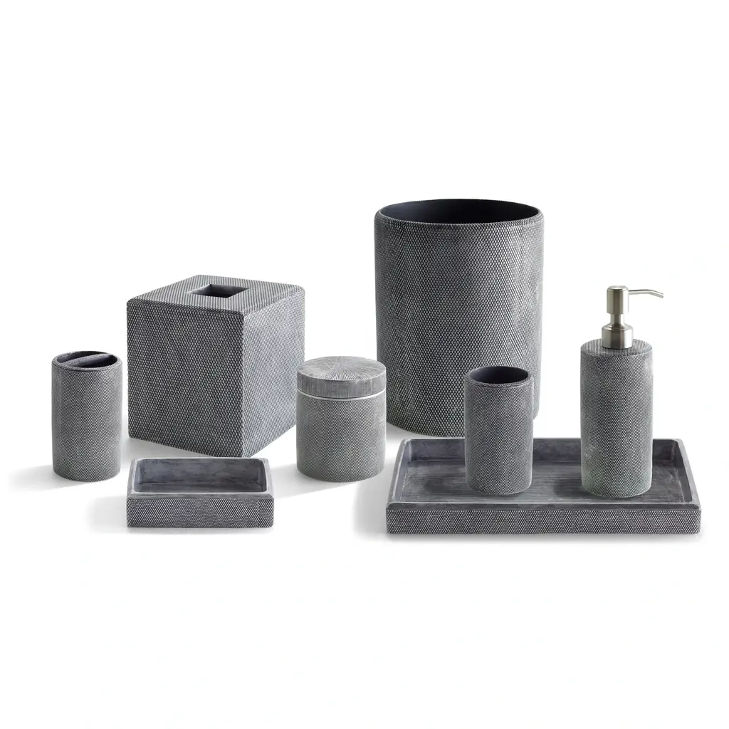 Add an industrial-chic touch to your bathroom decor with our Textured Resin Bath Accessory collection. Each piece in this collection is crafted from durable grey resin, designed to mimic the look of metal. Elegant and practical, this collection will withstand everyday use and elevate your bathroom style.Features:Dimensions: