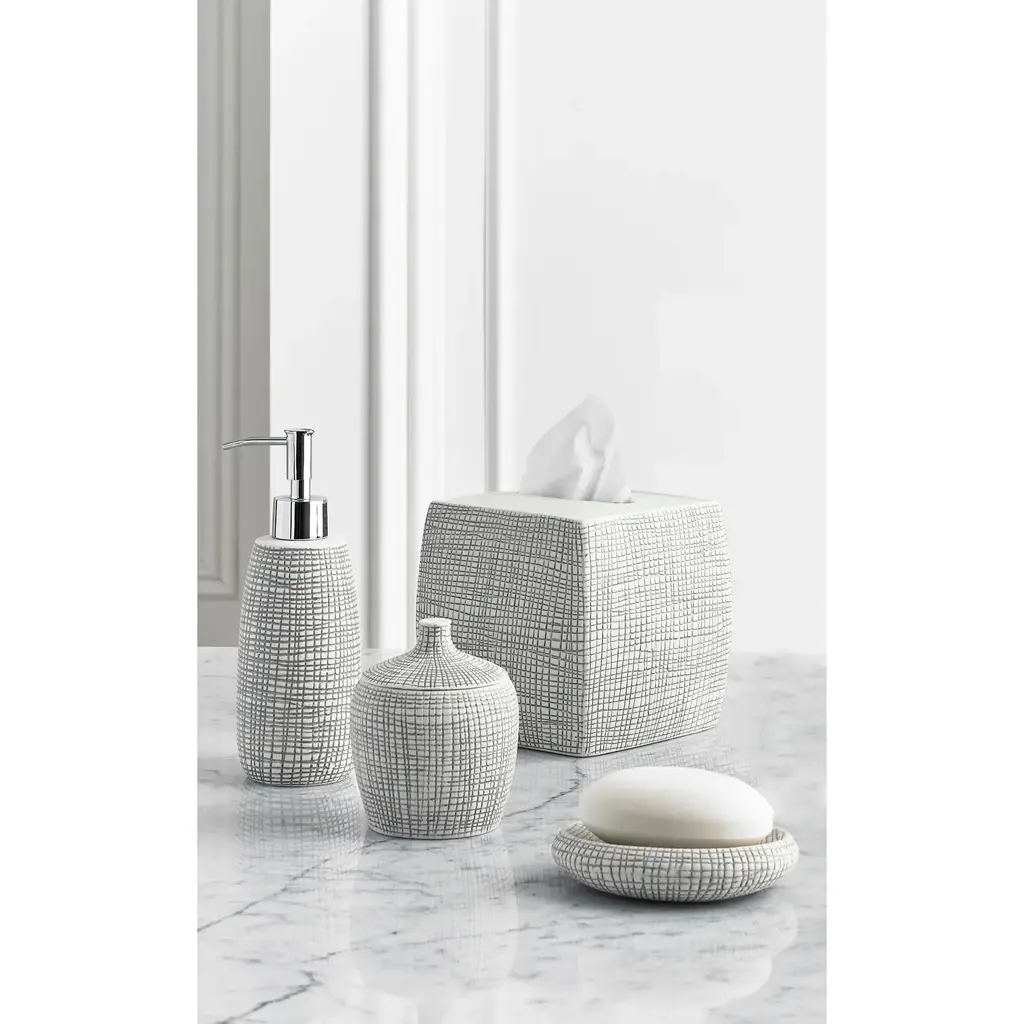 Bring the beauty of nature into your bathroom with the Cestino Bath Accessory Collection. Crafted from 100% embossed porcelain with painted details that imitate raffia palms, each piece exudes a serene and chic atmosphere. The stainless steel pump adds a touch of modern elegance. Each item is sold separately, and the collection includes a lotion dispenser, cotton jar, tissue holder, soap dish, tumbler, toothbrush holder, tray, and waste basket. Please note that the tumbler is not intended for use as a drinking cup. Clean these porcelain bath accessories easily with soap and water.Features:Dimensions: