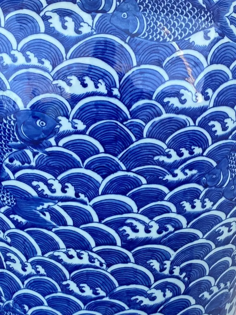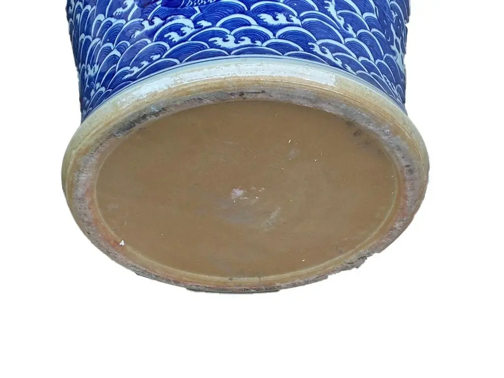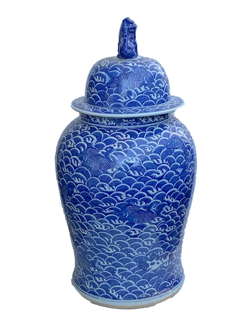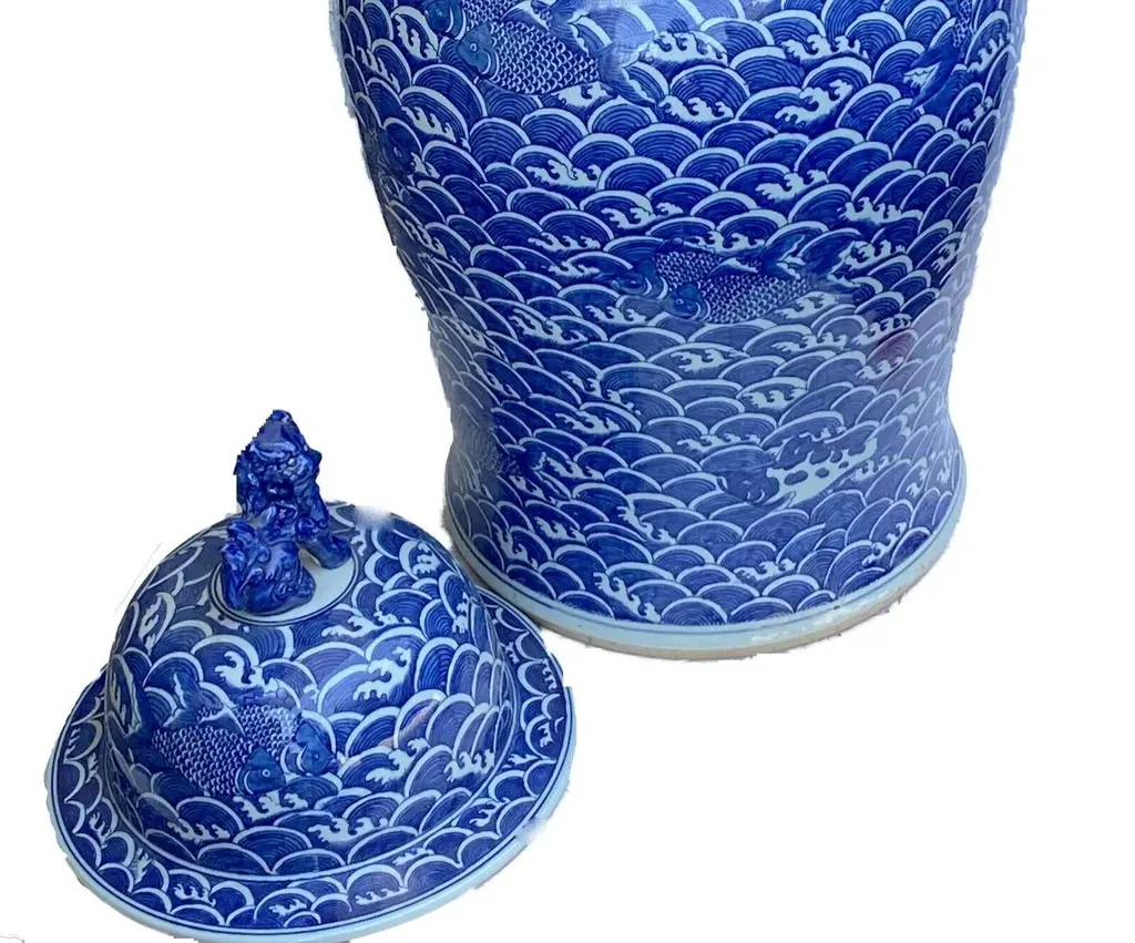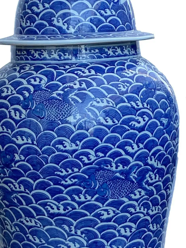Superb and elegant Large Chinoiserie Blue and white porcelain lidded ginger jar with a seated foo dog finial ,all hand painted with allover waves design and summing koi fish. Fish in general symbolize wealth and surplus, and the Chinese believe koi particularly represent good fortune in business and academics. Buddhists on the other hand see koi as representations of courage. Together in a koi pond, they represent love and friendship. 38" H by 20" Diameter.thanks