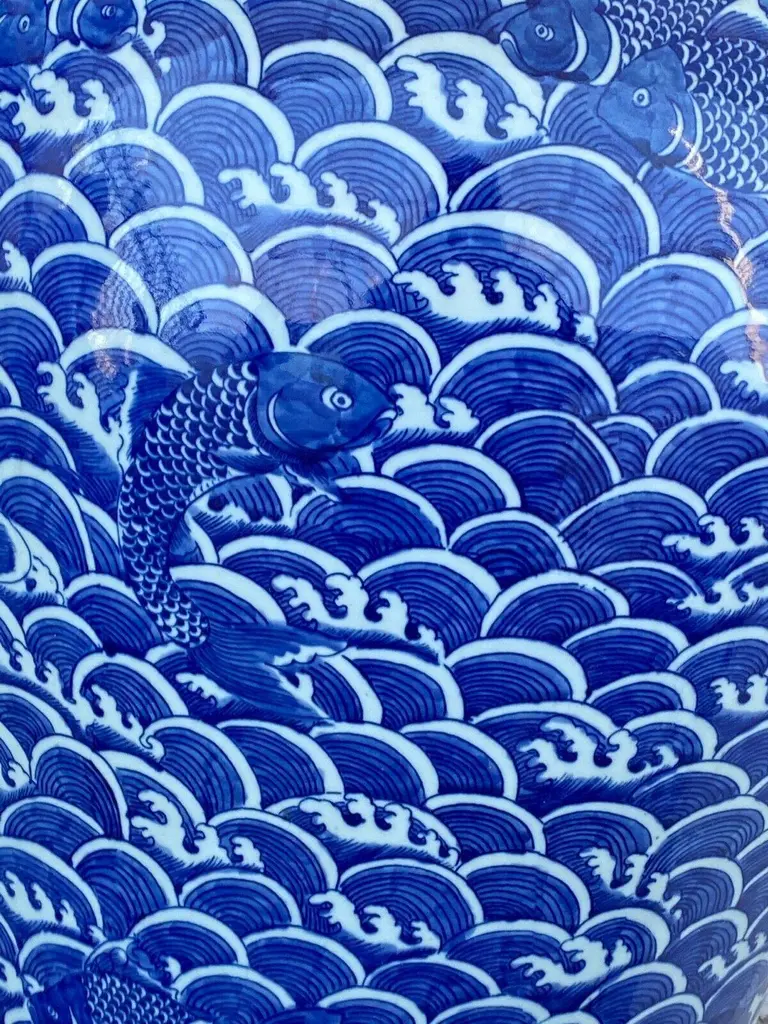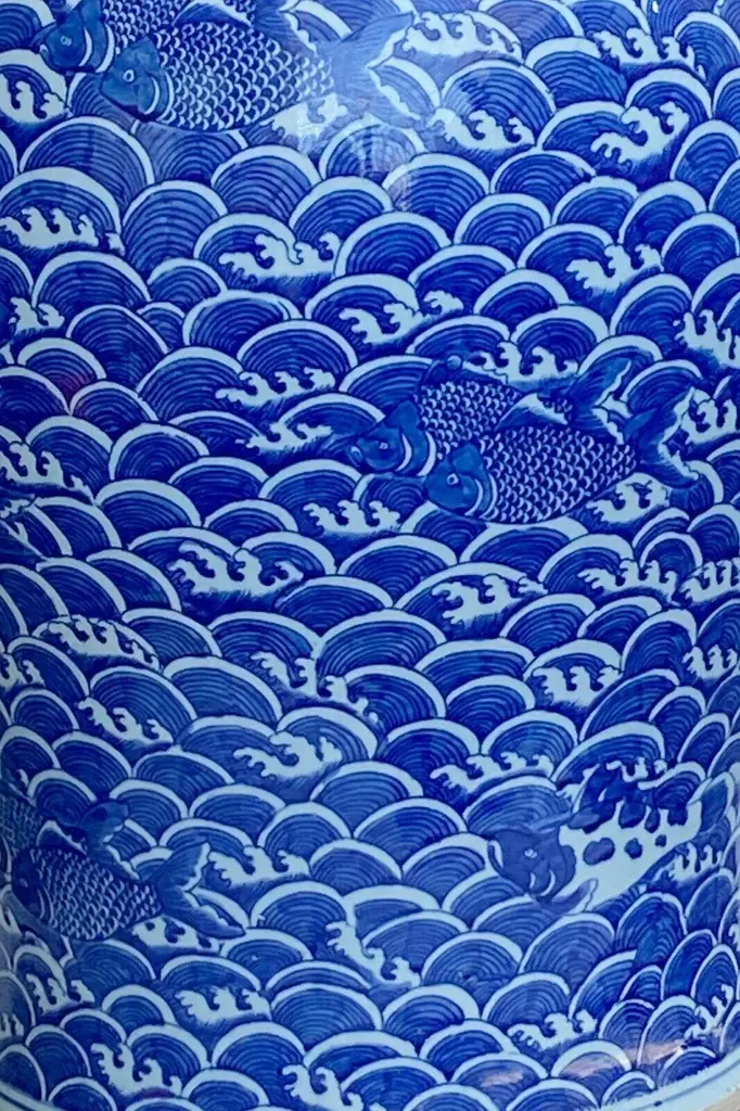 Large Chinoiserie Blue And White Porcelain Koi Fish Ginger Jar 38"h
