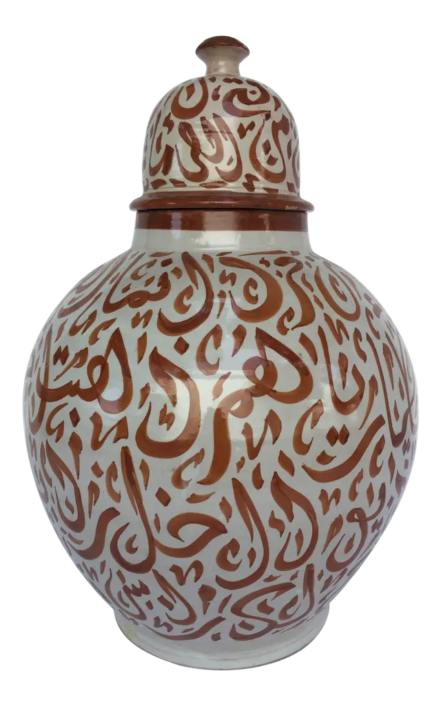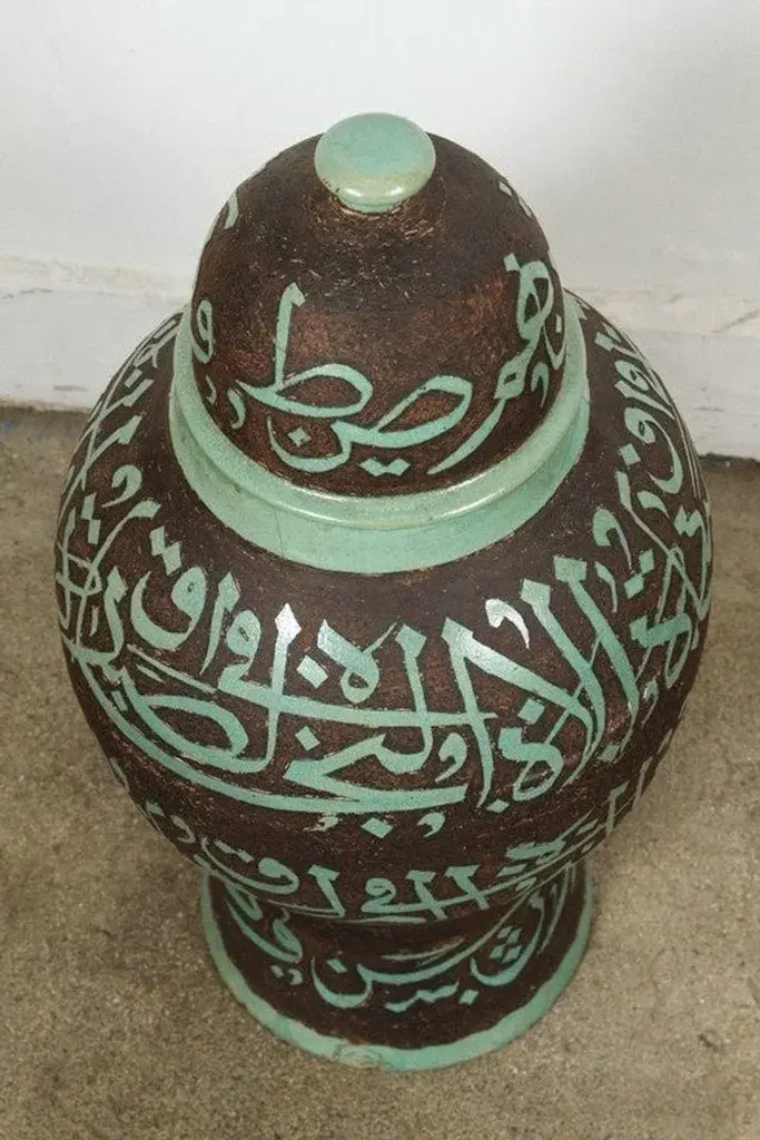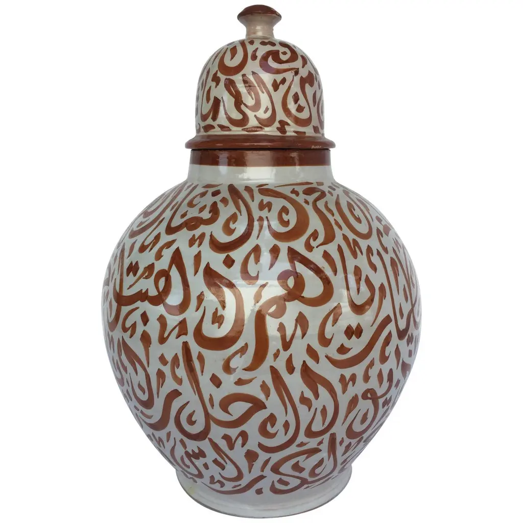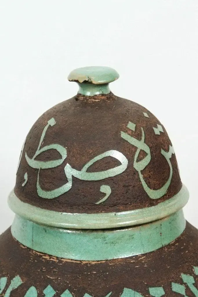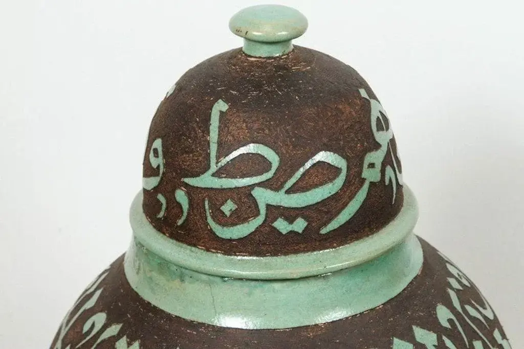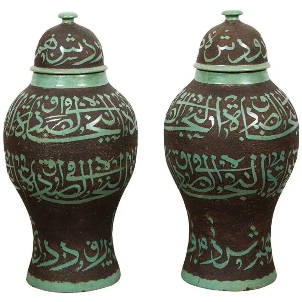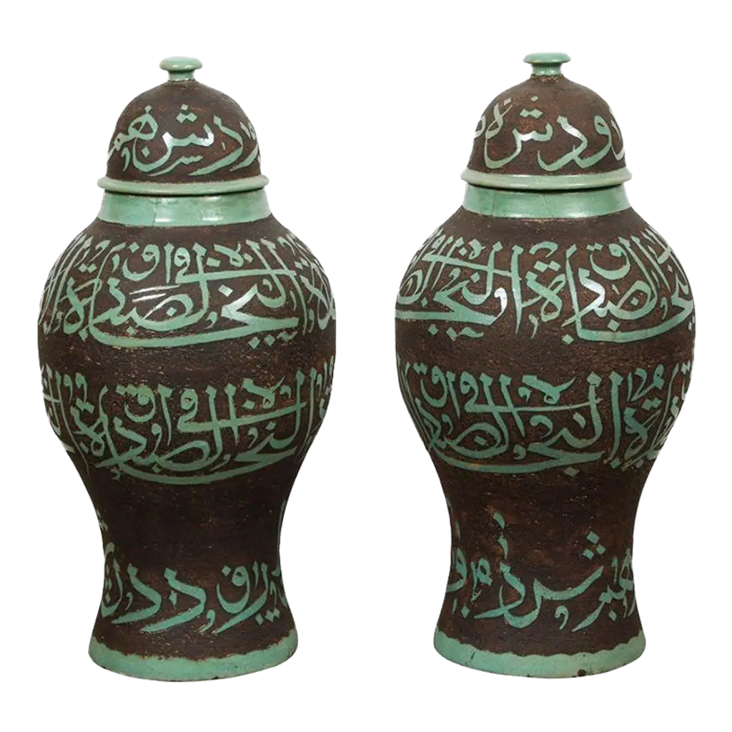 Large pair of Moroccan brown and green ceramic urns with lid, handcrafted in Fez Morocco, the green ceramic is hand-etched with Arabic writing calligraphy. This kind of ceramic Moorish Spanish style work could be found in the Alhambra palace in Spain. Dimensions: 27 in. H x 14 in. D Price is per set.