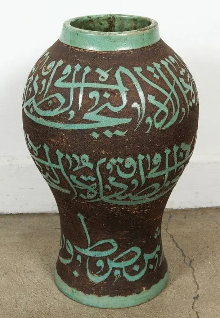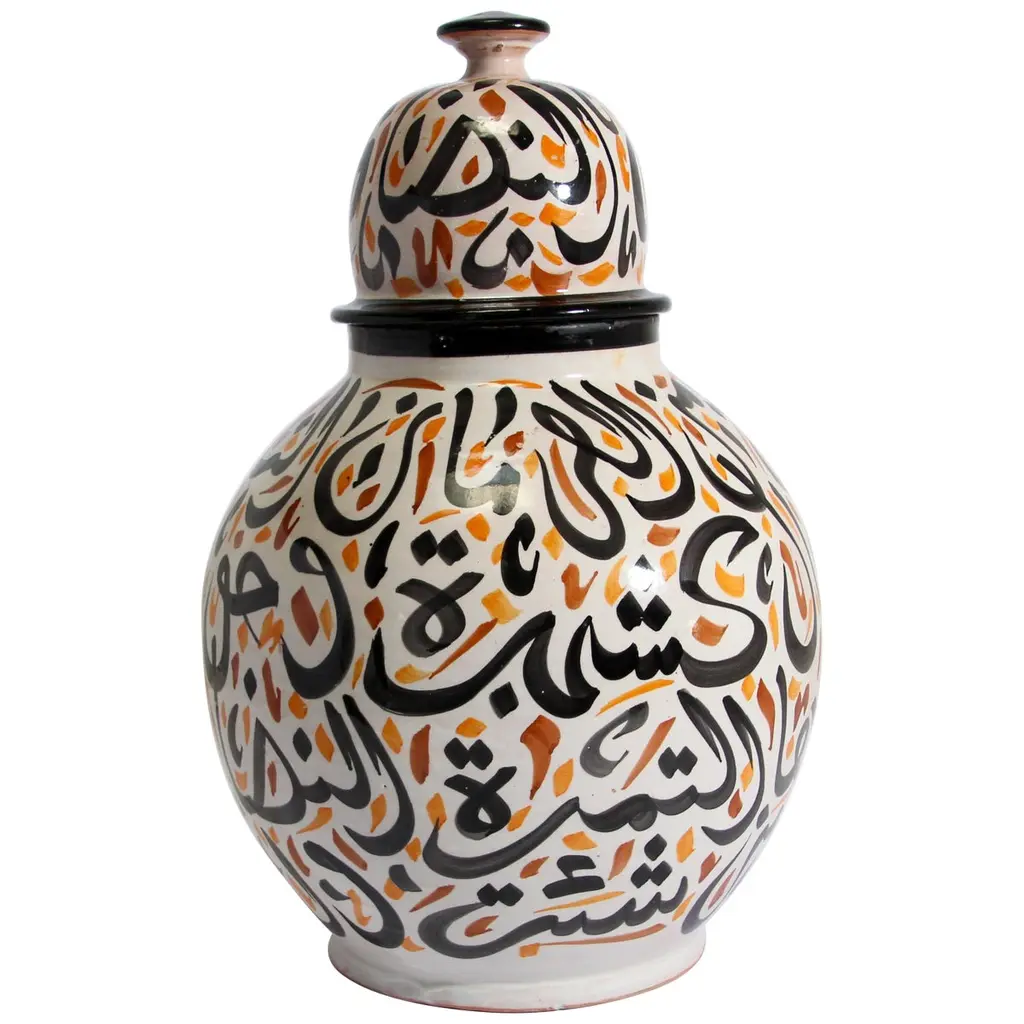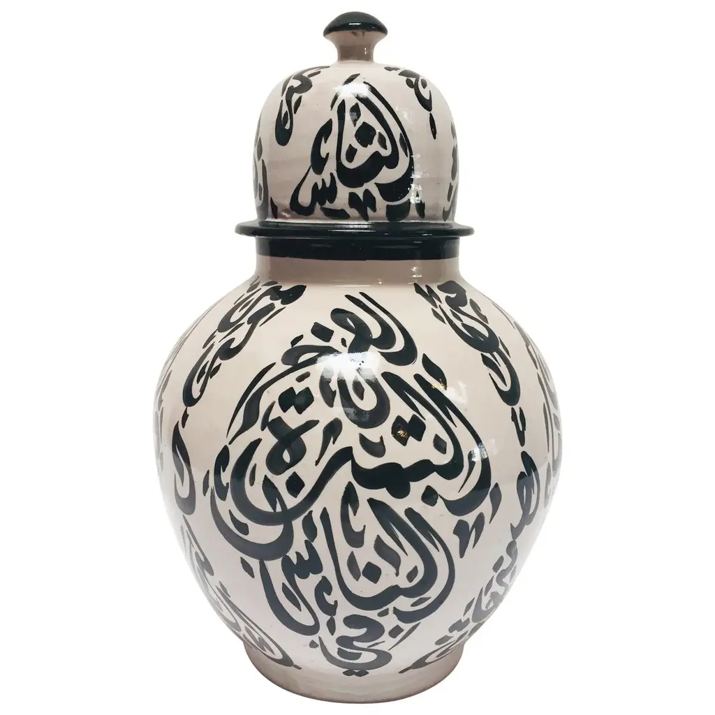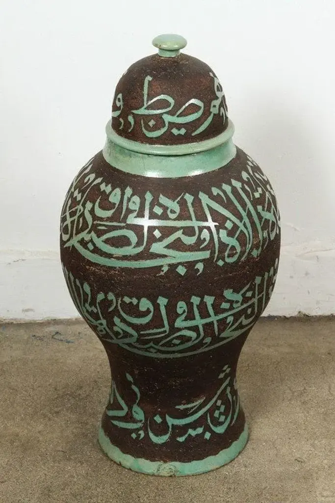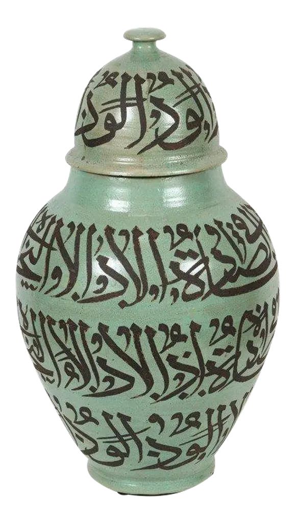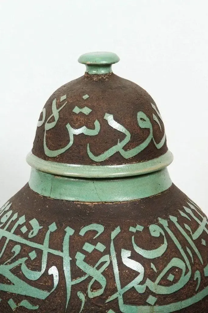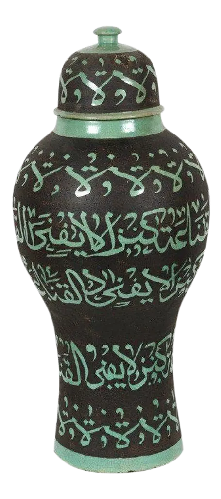 Large pair of Moroccan brown and green ceramic urns with lid, handcrafted in Fez Morocco, the green ceramic is hand-etched with Arabic writing calligraphy. This kind of ceramic Moorish Spanish style work could be found in the Alhambra palace in Spain. Dimensions: 27 in. H x 14 in. D Price is per set.