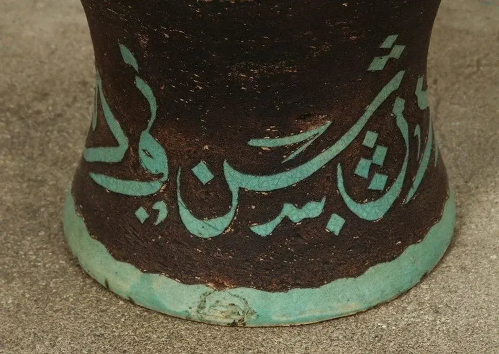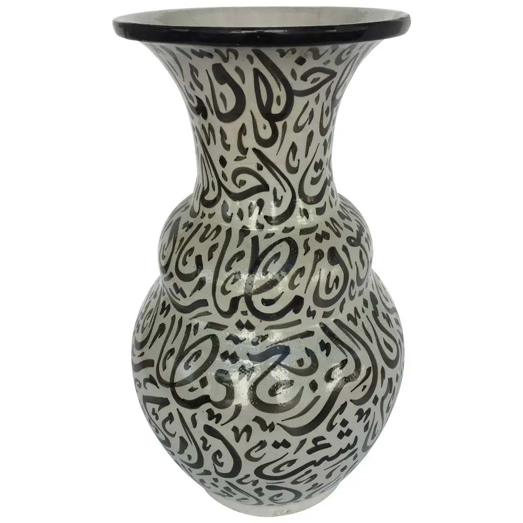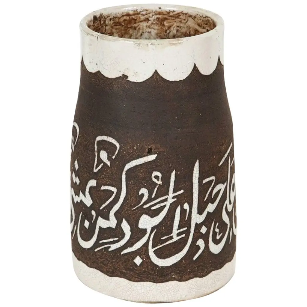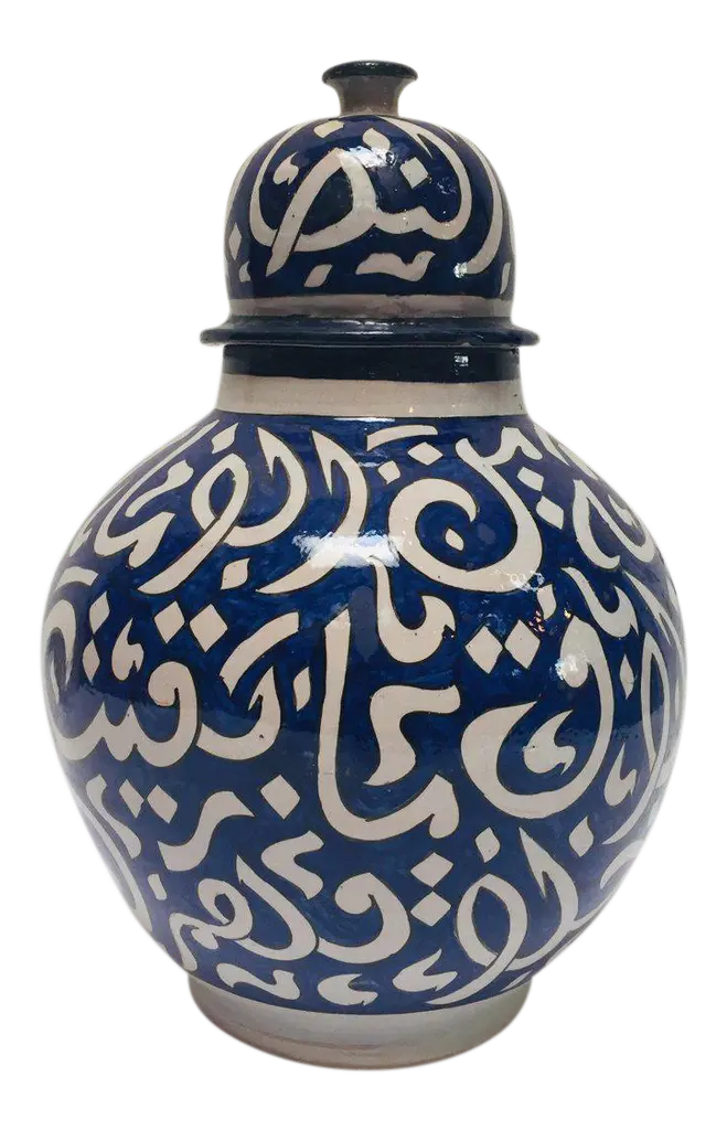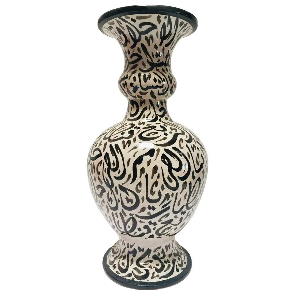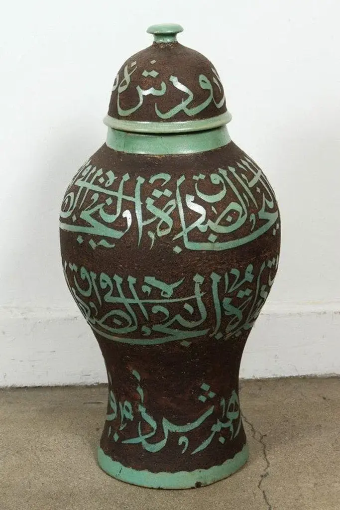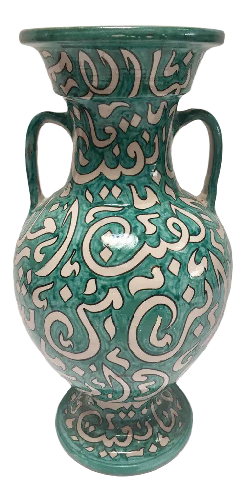 Large pair of Moroccan brown and green ceramic urns with lid, handcrafted in Fez Morocco, the green ceramic is hand-etched with Arabic writing calligraphy. This kind of ceramic Moorish Spanish style work could be found in the Alhambra palace in Spain. Dimensions: 27 in. H x 14 in. D Price is per set.