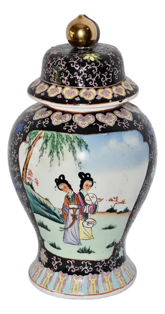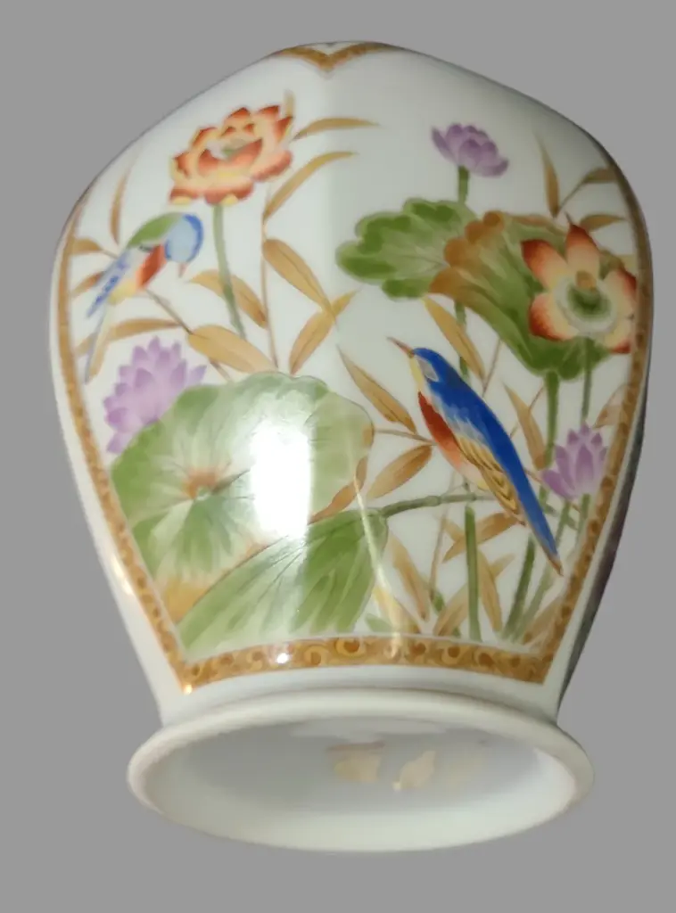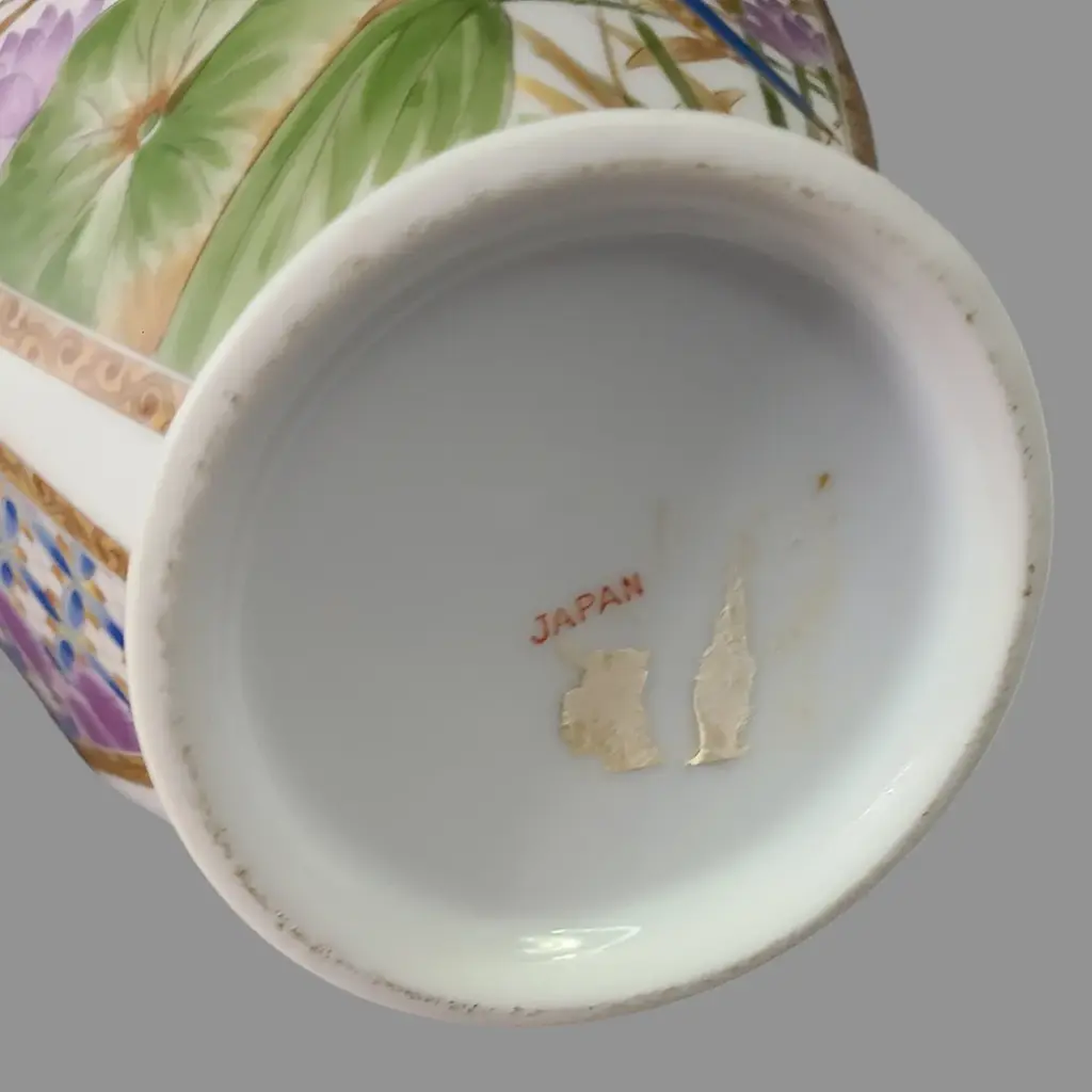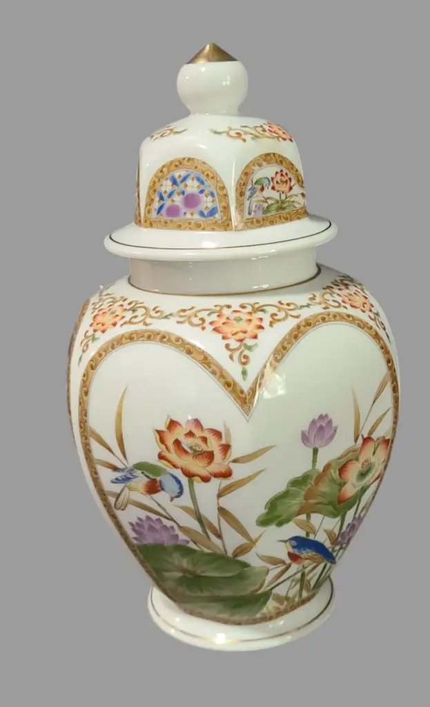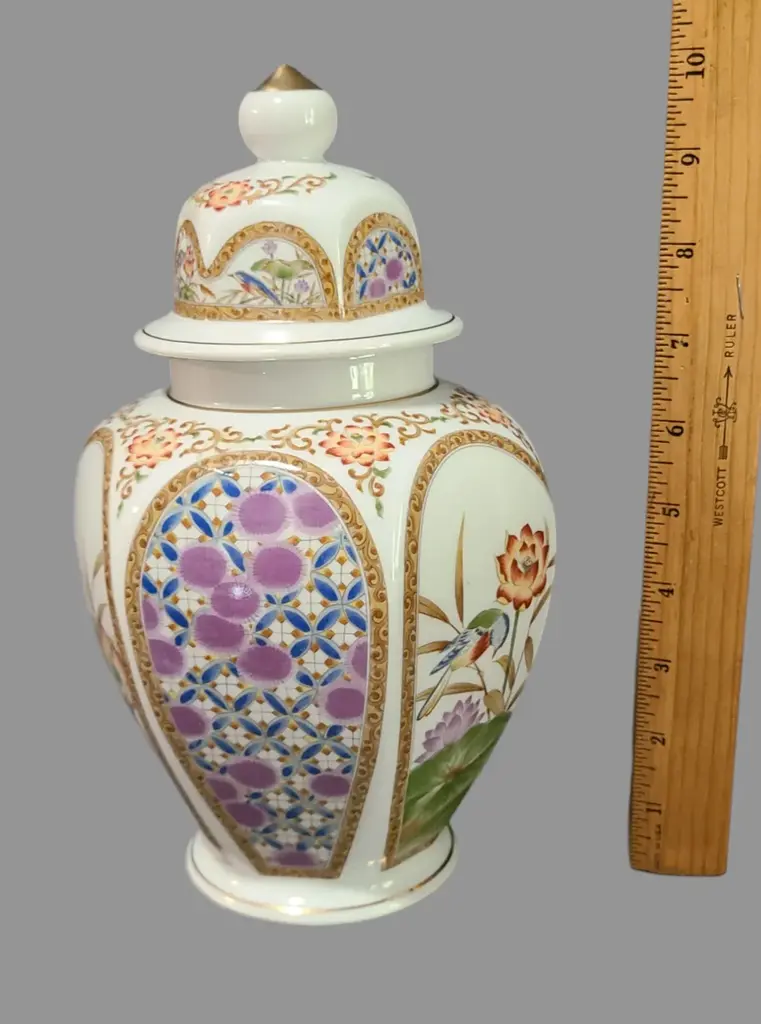 This vintage Japanese ginger jar features a beautiful bird and lotus floral design, making it a perfect addition to any collection or display. Made in Japan, this jar is a unique piece that showcases the rich culture and artistry of the region. Its urn shape and Japanese origins make it a fascinating item for collectors of Asian art and culture. The jar is perfect for use as a vase or for storing small items. Its intricate design and attention to detail make it a true work of art. Whether you're a collector or simply appreciate unique and beautiful pieces, this vintage Japanese ginger jar is sure to impress. Very good vintage condition, measuring 11'' High 6'' Wide 3.25'' Top opening 3.75'' At base, please view photos for detail