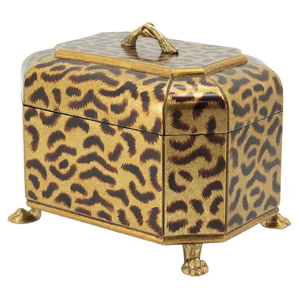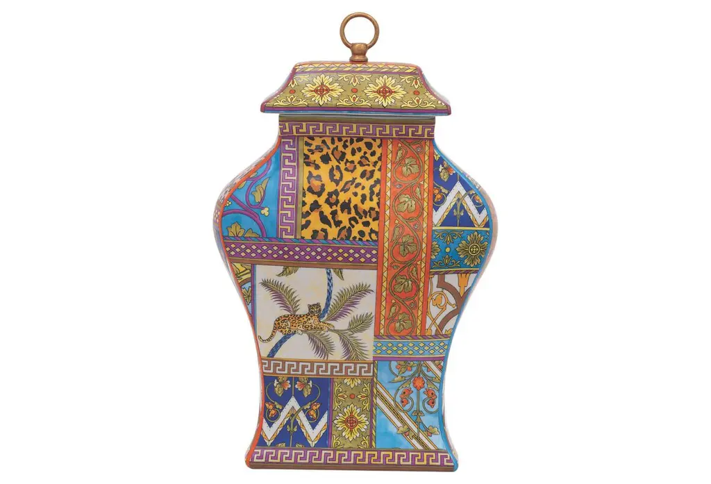 The patterned Leopard Jar is scaled at 6" deep to fit on your mantle or shelf. Accented with a solid brass ring finial, the sides are patterned in a gold marble. Accents of gloss black. Lift off porcelain top. Holds water. Materials: Porcelain, Brass Indoor use only. Clean with soft dry cloth At Port 68, our porcelain pieces are handcrafted and fired at extremely high temperatures, and as a result, slight variations may occur. The glaze color of the finished product may differ slightly from the images displayed online.