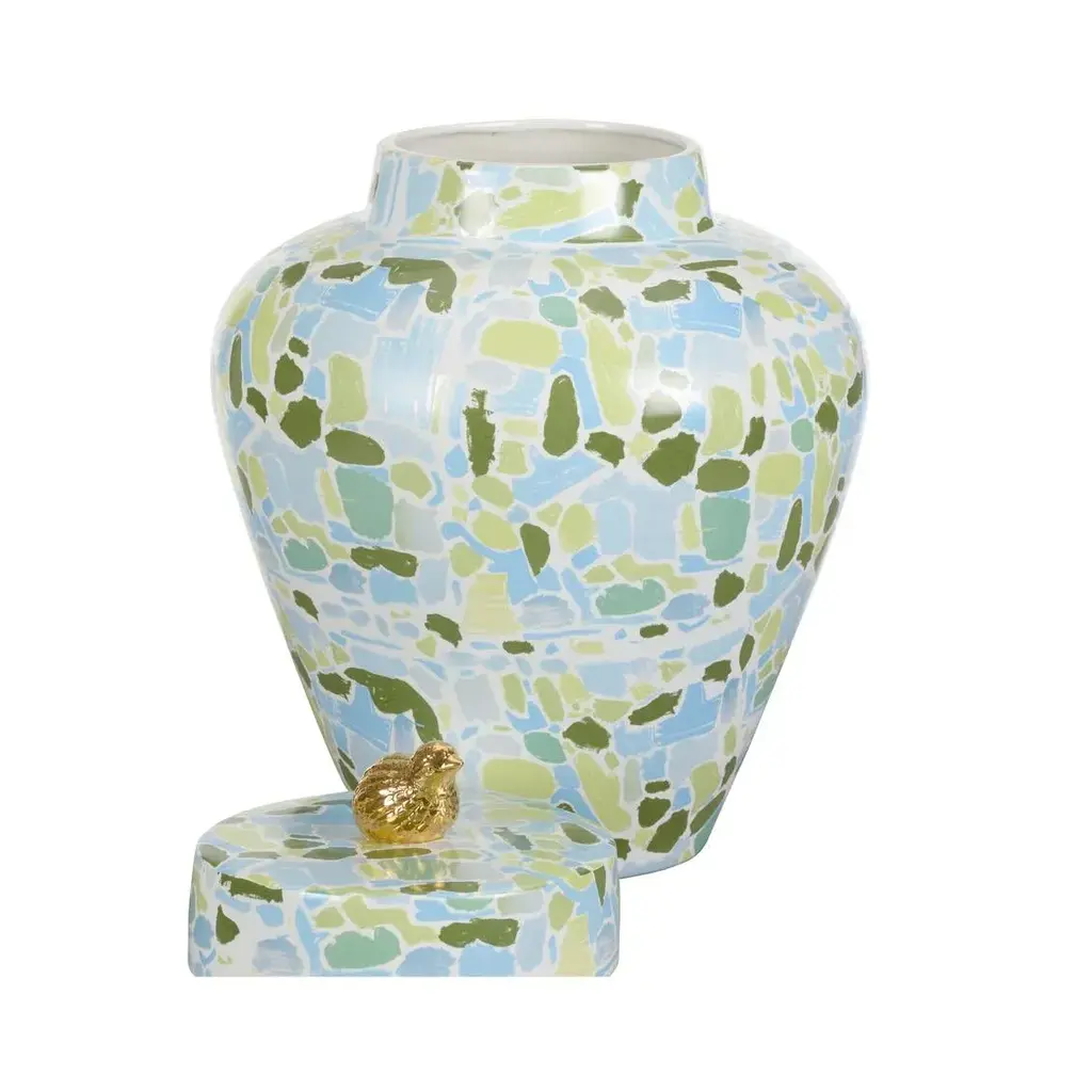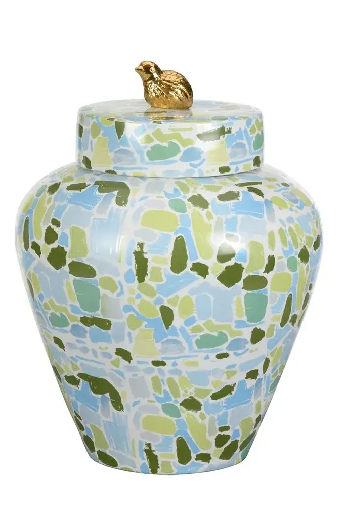 Created by artist Elaine Burge, this jar features lovely blues and greens in a updated pattern on a classic shape. Topped with a removable lid featuring a delightful gold quail.