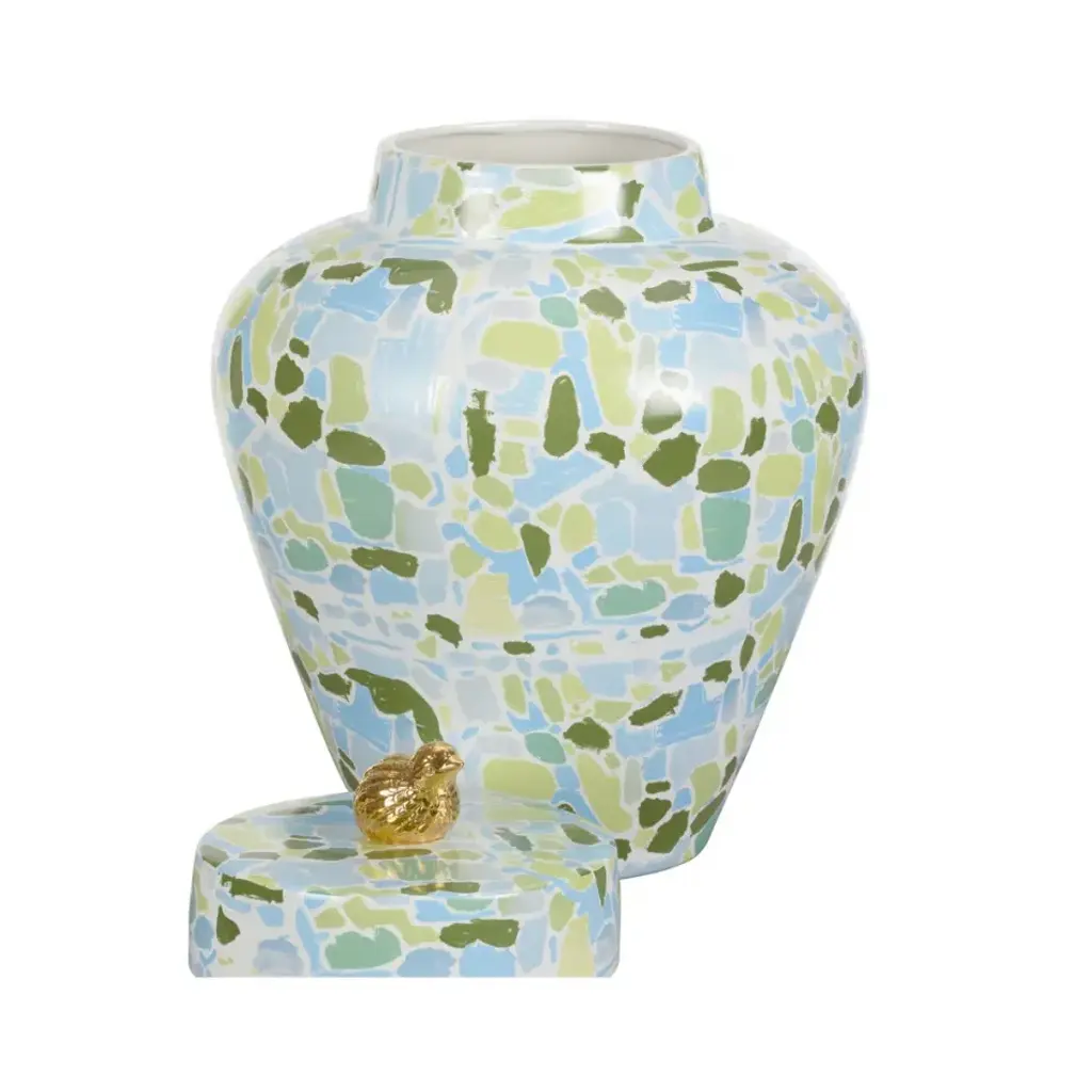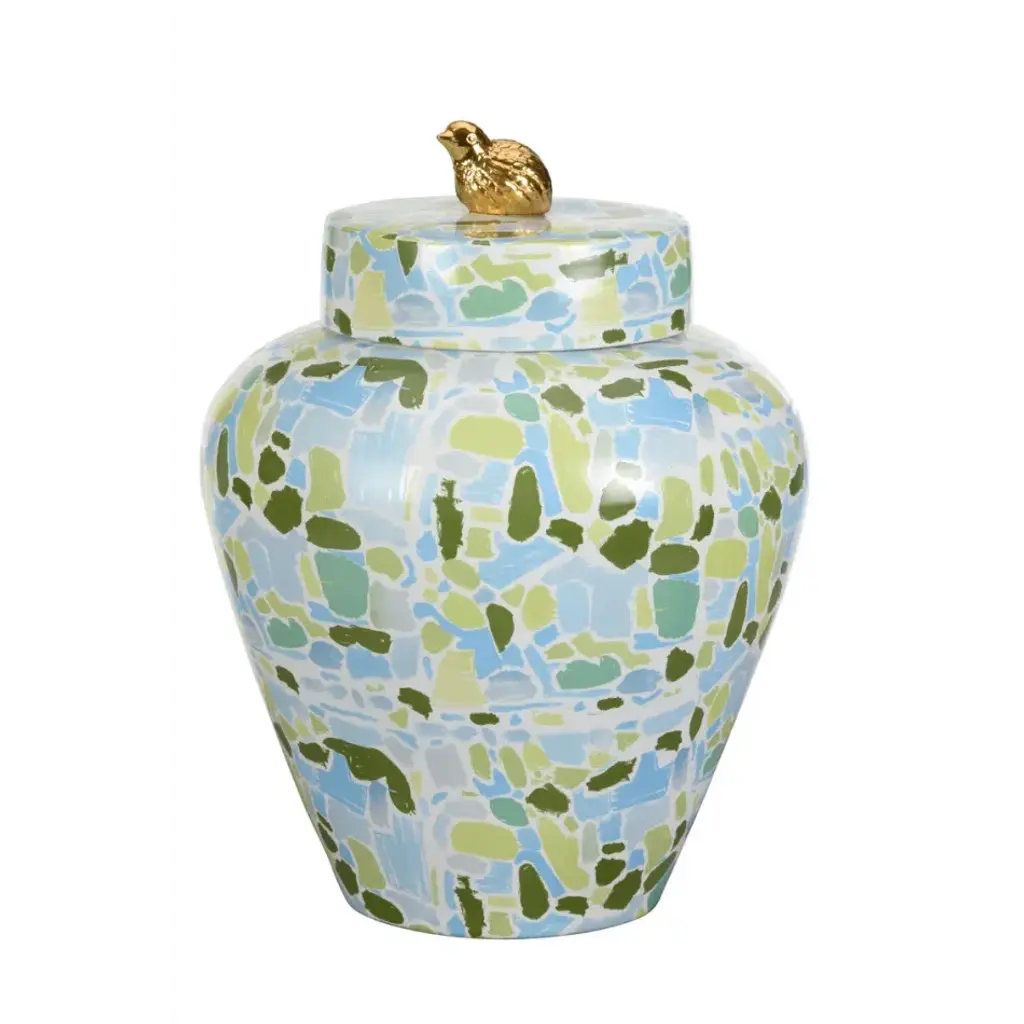 CREATED BY ARTIST ELAINE BURGE, THIS JAR FEATURES LOVELY BLUES AND GREENS IN A UPDATED PATTERN ON A CLASSIC SHAPE. TOPPED WITH A REMOVABLE LID FEATURING A DELIGHTFUL GOLD QUAIL.
