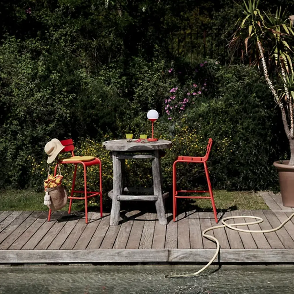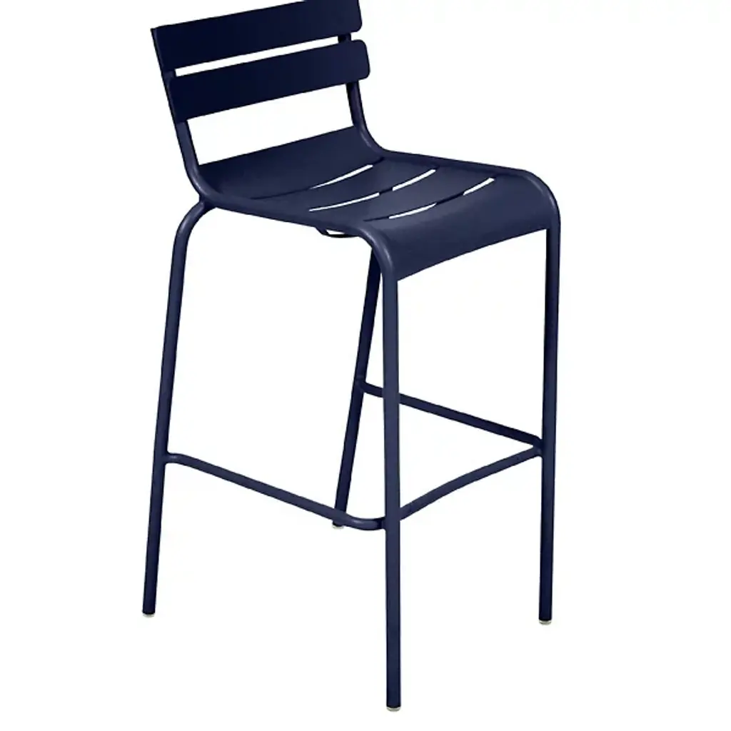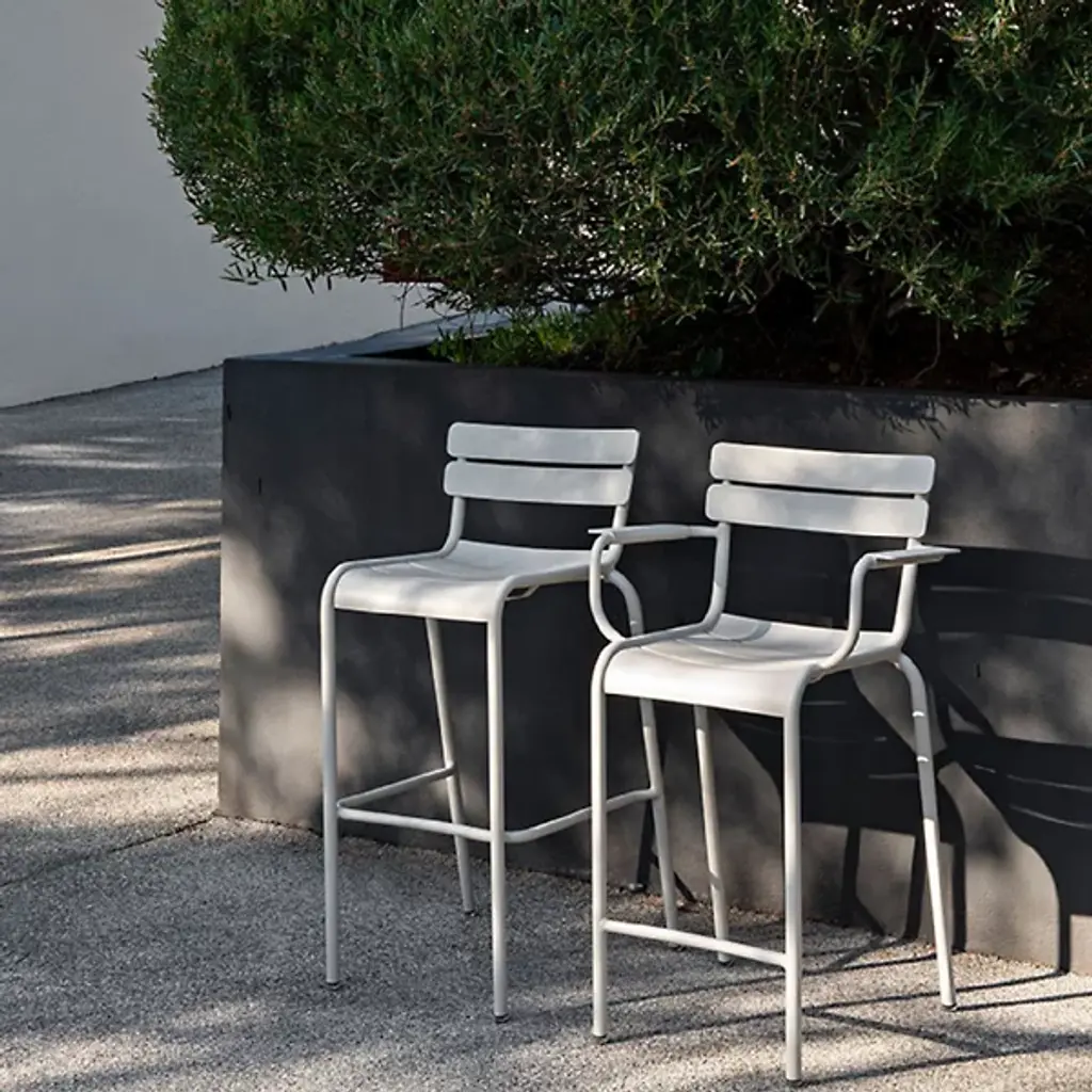 Enjoy happy hour in high style and carefree comfort. The Luxembourg High Stool, Set of 2 by Fermob is a comfortable stackable bar stool made for home and commercial settings. Designer Frédéric Sofia designed the stool to be a modern reinterpretation of the iconic Jardin du Luxembourg chairs in Paris. A double-slatted back and contoured seat with a waterfall front provide relaxed seating at a poolside bar or high table. Crafted from lightweight Aluminum, the powder coated stools are resistant to UV rays and wet weather conditions. Top this high stool with a matching Color Mix Luxembourg Cushion and pair it with the Luxembourg Square High Table for cozy bistro eating on your deck or patio.