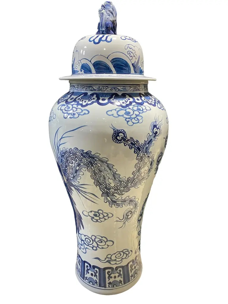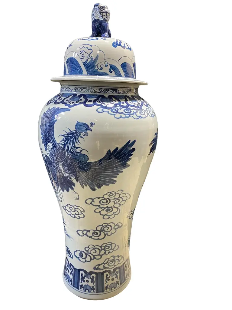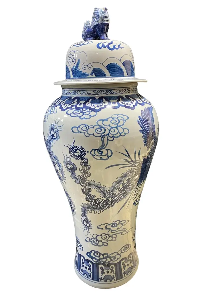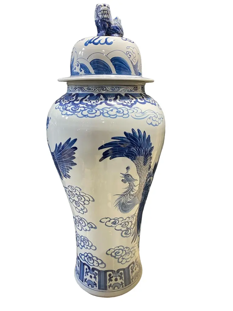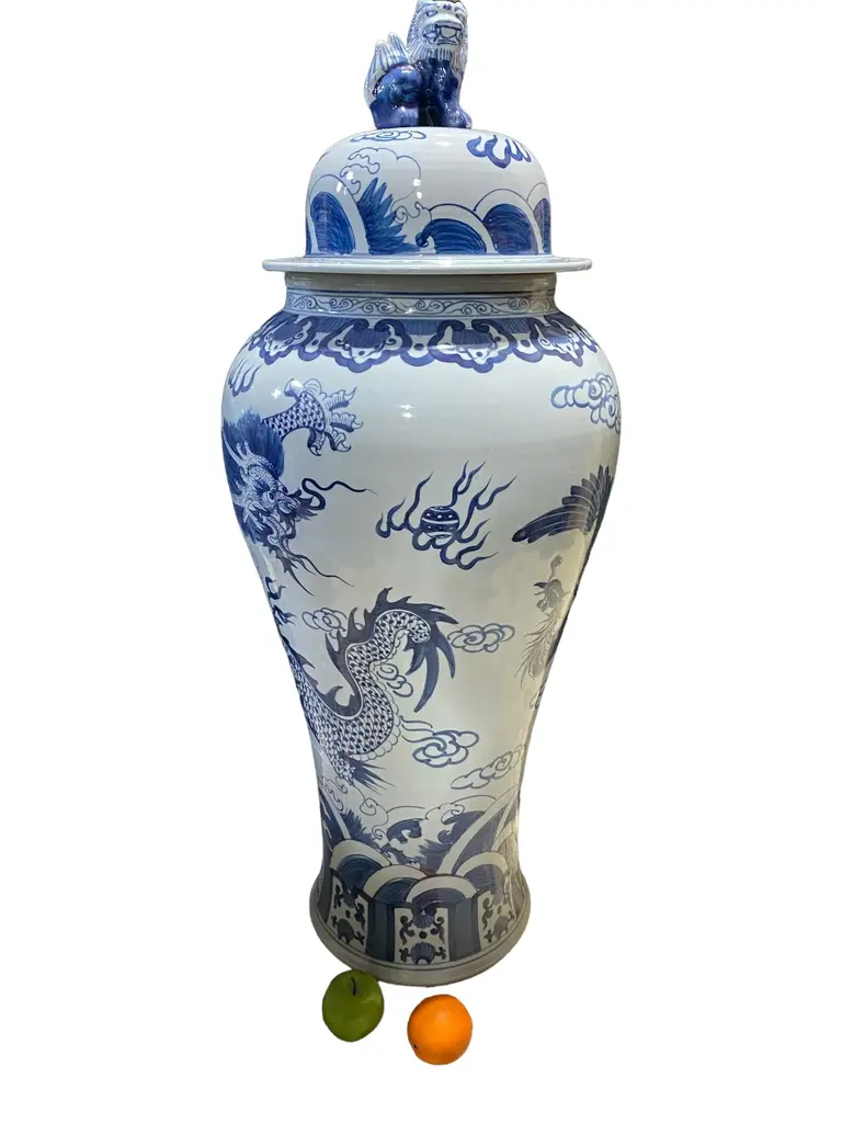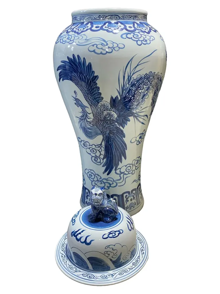 The Mansion Size Chinoiserie Ginger Peacocks Jar, standing at 44 inches tall with a 17-inch diameter, showcases exquisite hand-painted depictions of peacocks. These majestic birds, highly regarded in Chinese culture, symbolize not only beauty but also longevity, dignity, and prosperity, making them a popular motif in traditional art. The jar also features foo dog handle 17ʺW × 17ʺD × 44ʺH