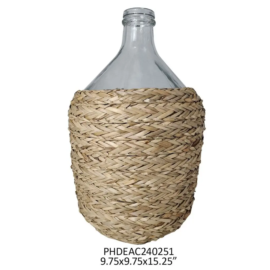 Medium Bottiglia Woven Jar. The Medium Bottiglia Woven Jar blends natural texture with simple elegance. Featuring a clear glass bottle wrapped in handwoven natural fibers, this piece adds rustic charm and artisan craftsmanship to any space. At 15.25" tall, it’s perfect as a decorative accent, a vase for tall stems, or a statement piece on its own. Fully assembled. Manufacturer: Porch View Home.