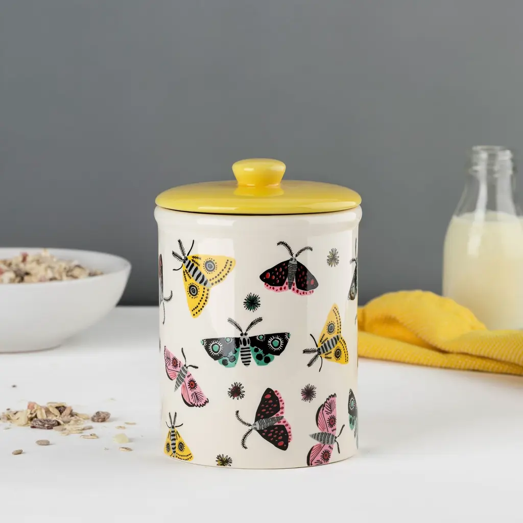 Adorned with Hannah's beautiful moth designs, this Moth Storage Jar is perfect for looking after your teabags, or sugar or maybe cookies?Made from high-fired earthenware ceramic. Dishwasher safe. Handmade in Sri Lanka.