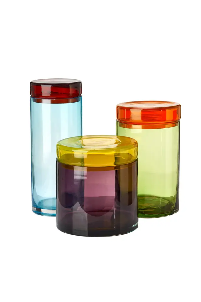 Our Caps and Jars are made from full-colored glass, individually mouth-blown and hand-worked. They’re simply functional and décorative – suitable for everyday use. Take your pick from the variety of colors that this set has to offer – store your dry goods in style.