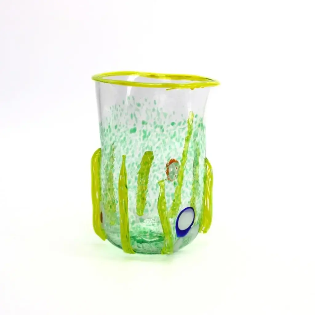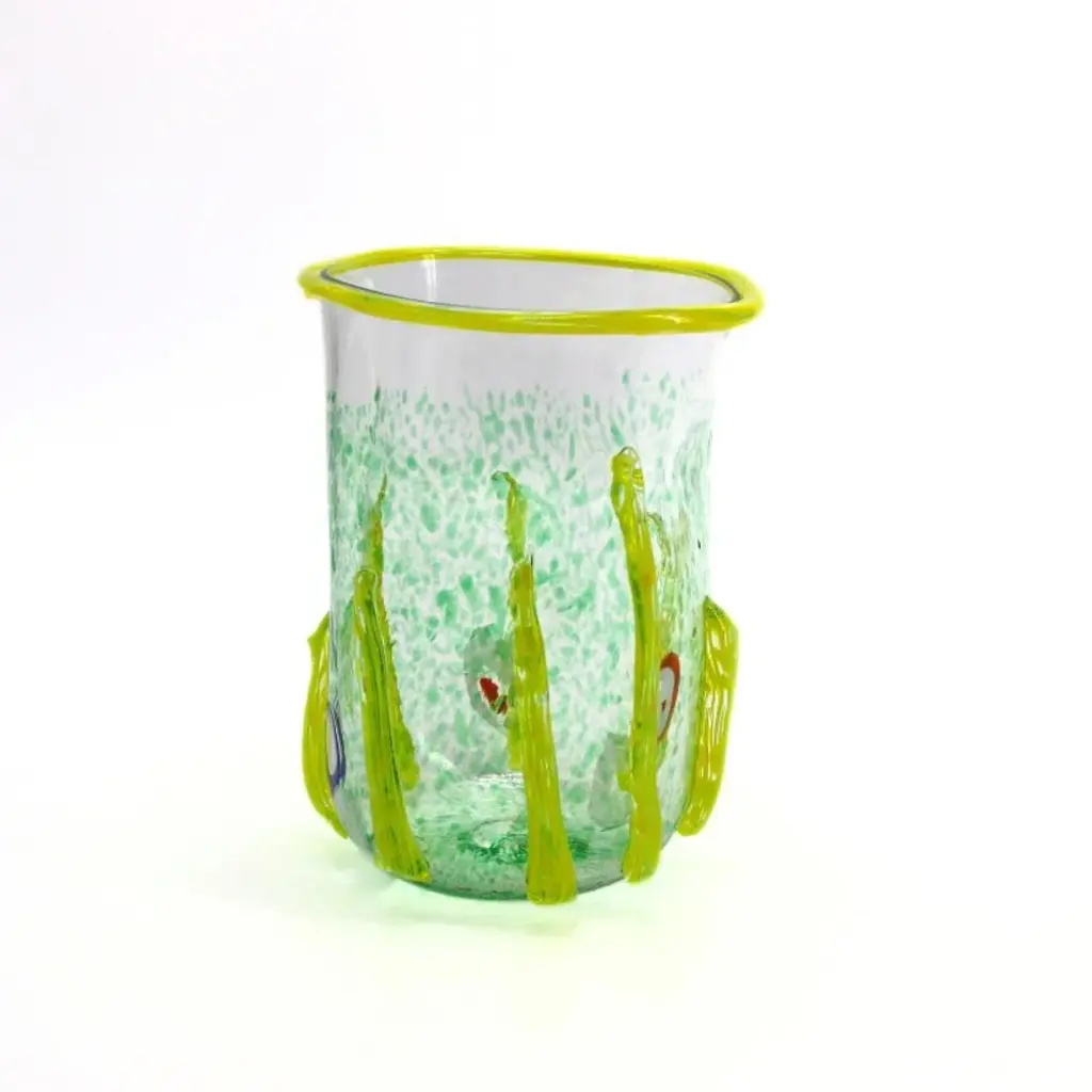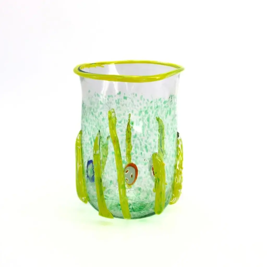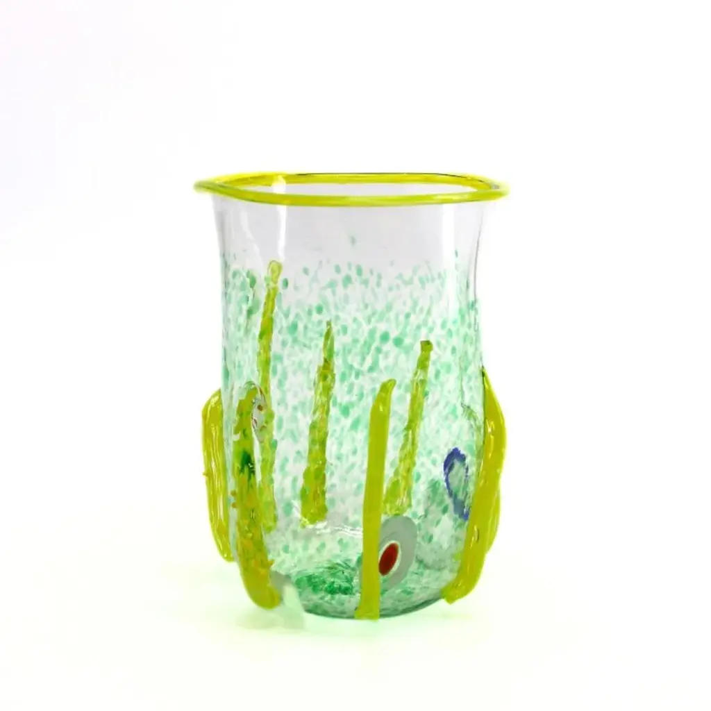 Handcrafted on Murano Island using traditional glassblowing techniques, this punch jar blends modern vibrancy with artisanal charm. The transparent glass base, soft green hue, murrina accents, and bold yellow relief make it a striking piece. Perfect for serving lemonade, punches, or even as a champagne bucket, each jar showcases the handmade craftsmanship of Murano’s glassmasters, with no two being exactly alike.