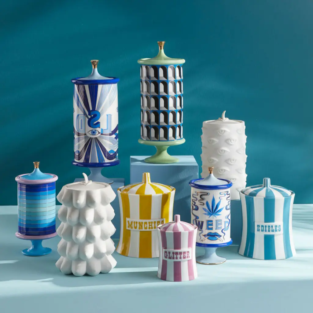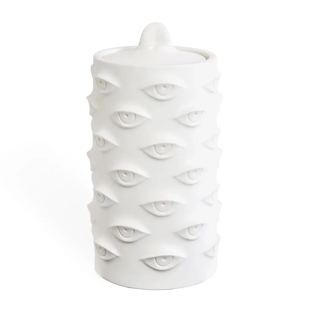 Posh Peepers. An absolute vision, our Muse Eyes Cookie Jar is a natural eye-catcher. Topped with a removable lid and crafted from classic matte porcelain, it's a real looker on any counter or tabletop. Jonathan sculpts and throws the models for our Muse pottery and then substitutes our signature geometric relief patterns with body parts—faces, breasts, lips—to create a surreal style. Pieces are inspired by our favorite artists' muses.