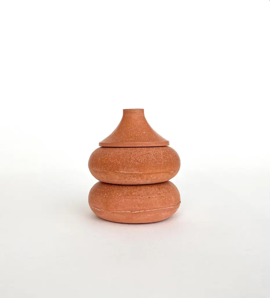 Nomad jar pebble tower by Gilles & Cecilie.Unique.Dimensions: H 8 x W 6 cm.Material: terracotta with iron.Gilles and Cecilie studio created the Nomad Jar Family to explore drawing in three dimensions. The series of objects that can stand alone or can interact through stacking allows the user to influence the composition by mixing material, shape and color. This series was developed to investigate the seemingly instinctive desire for personal belongings, the need to own something, to establish what portable objects evoke the comfort of home and so that the feeling of home itself is something you can take with you wherever you go. Each object is cast in terracotta with iron and ceramic stone, and available natural, white, or colour. Casted at Gilles & Cecilie Studio in London using handmade moulds. Each object is unique.