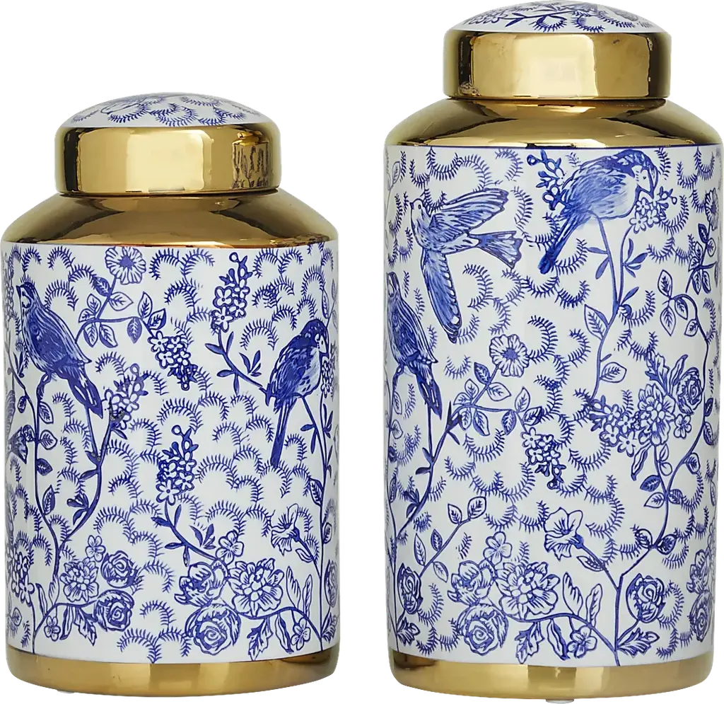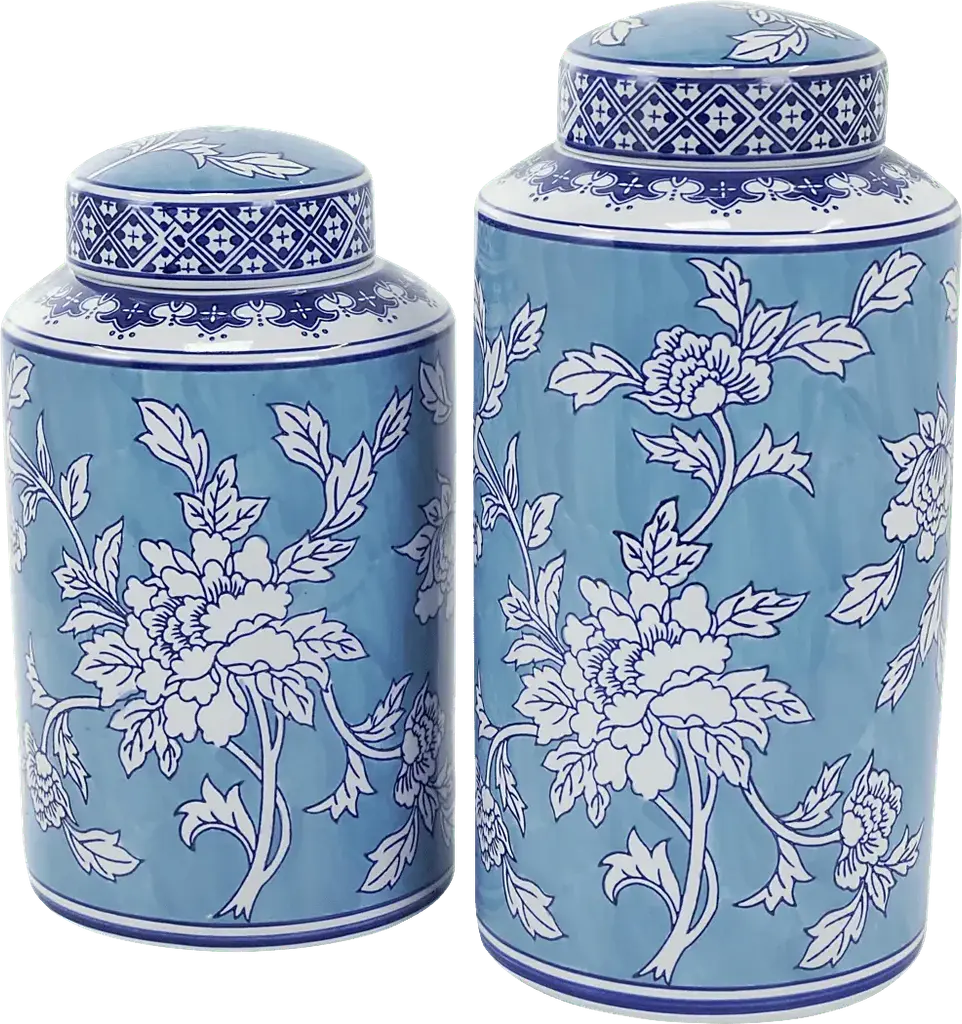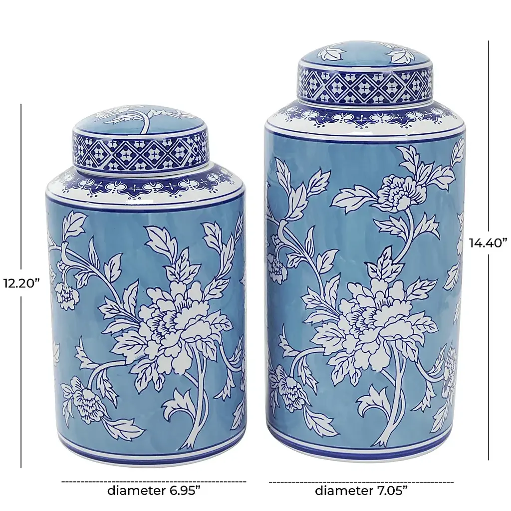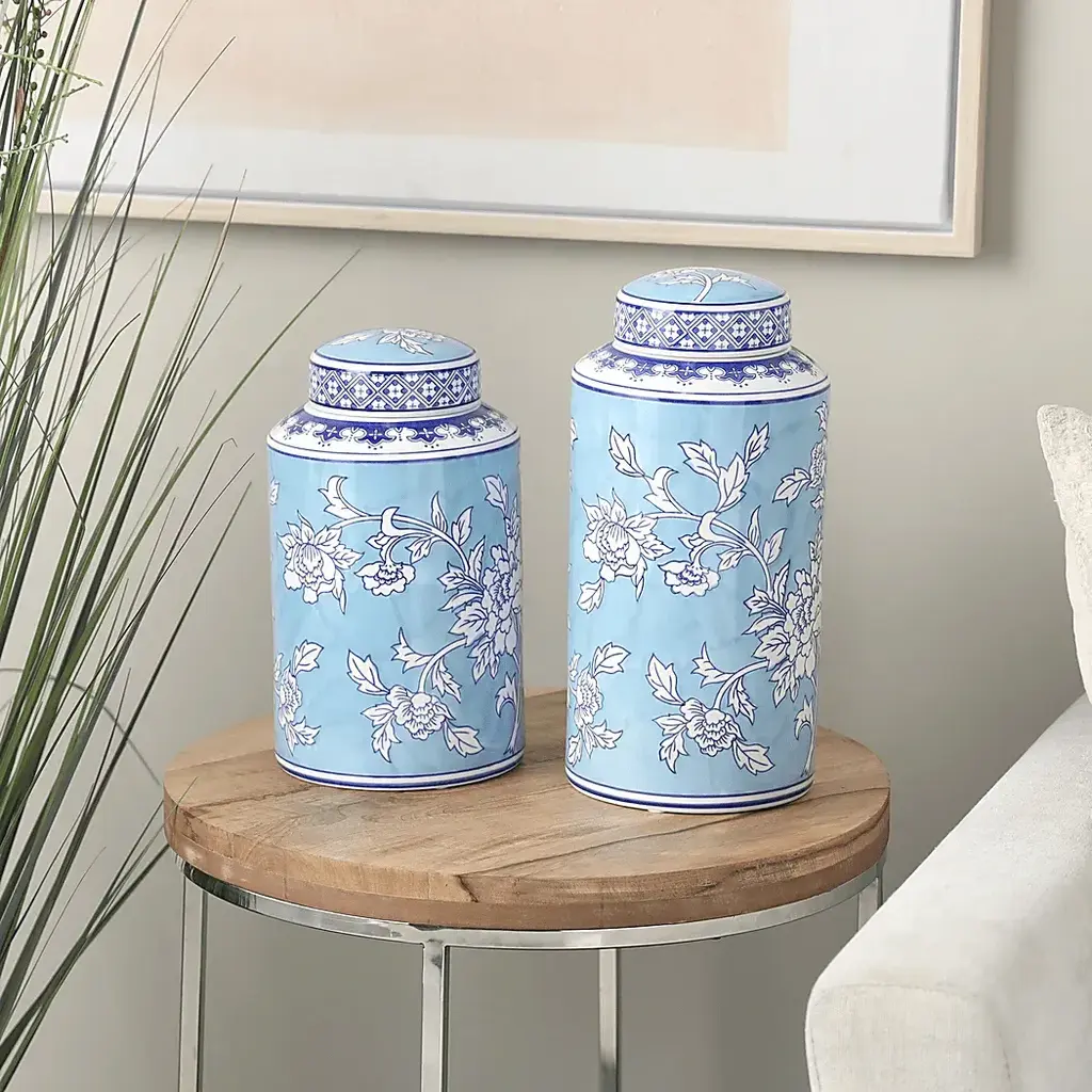 The Oredu Jar, Set of 2 is designed with timeless sophistication, rich old-world textures and warm hues come together for a refined classic taste of luxury. Crafted from high-quality stoneware, this blue living room decorative jars set promises durability and longevity. Round decorative storage jar set boasts a polished blue finish, while the dark blue and white floral patterns add a touch of charm. Marked by intricate floral designs, this stoneware set of 2 decorative jars offers a unique aesthetic appeal. Each blue ceramic decorative jar measures 7.05L x 7.1W x 14.4H, 6.95L x 6.95W x 12.2H inches, and collectively weighs 11.43 lbs. Customer assembly is required.