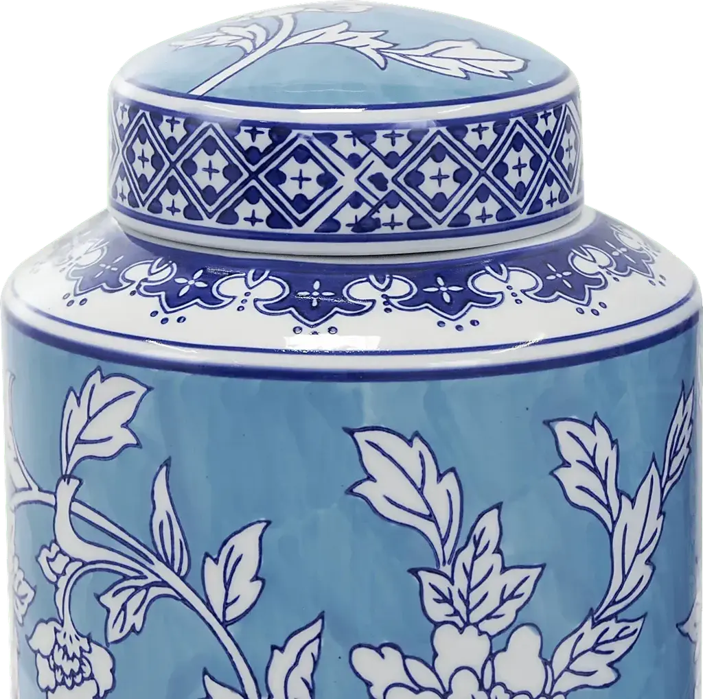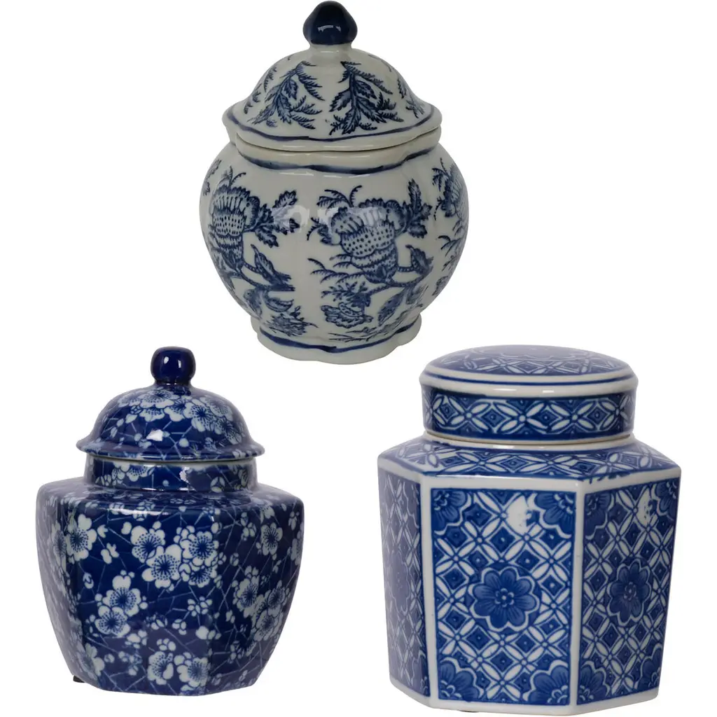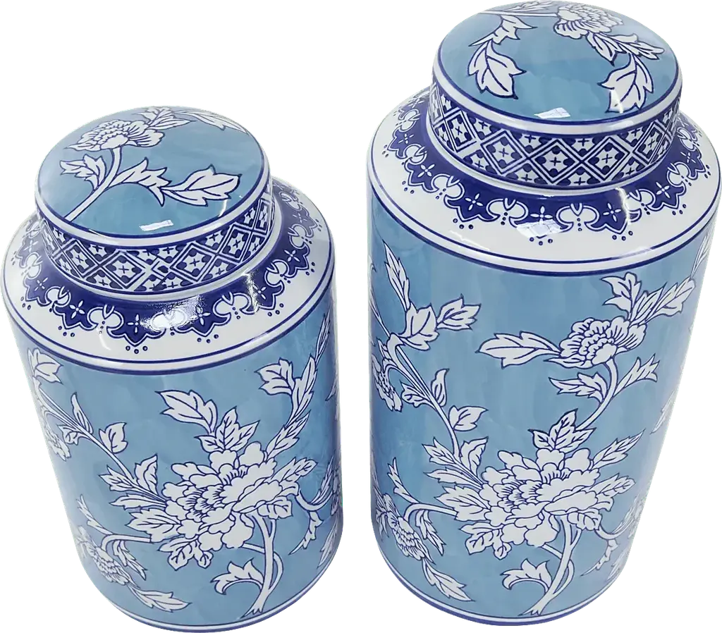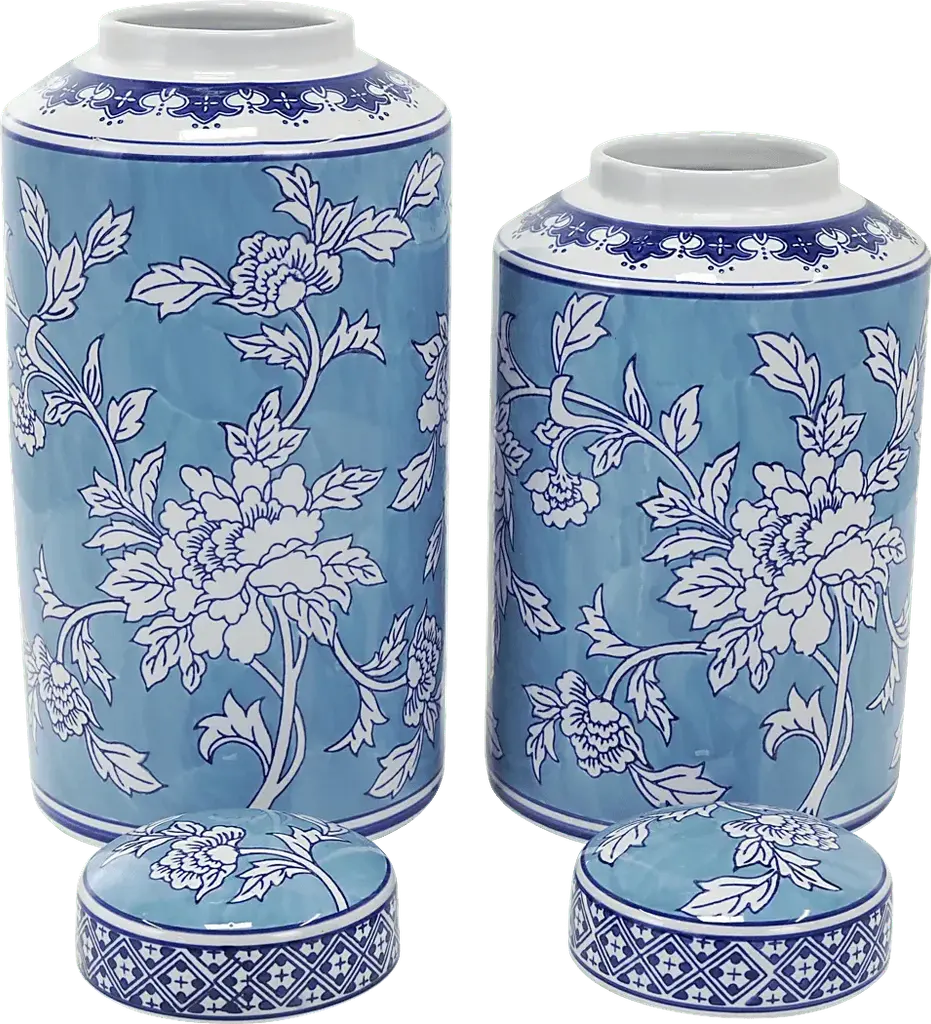 The Oredu Jar, Set of 2 is designed with timeless sophistication, rich old-world textures and warm hues come together for a refined classic taste of luxury. Crafted from high-quality stoneware, this blue living room decorative jars set promises durability and longevity. Round decorative storage jar set boasts a polished blue finish, while the dark blue and white floral patterns add a touch of charm. Marked by intricate floral designs, this stoneware set of 2 decorative jars offers a unique aesthetic appeal. Each blue ceramic decorative jar measures 7.05L x 7.1W x 14.4H, 6.95L x 6.95W x 12.2H inches, and collectively weighs 11.43 lbs. Customer assembly is required.
