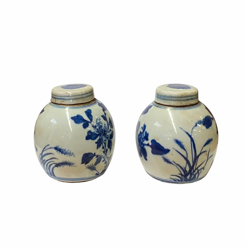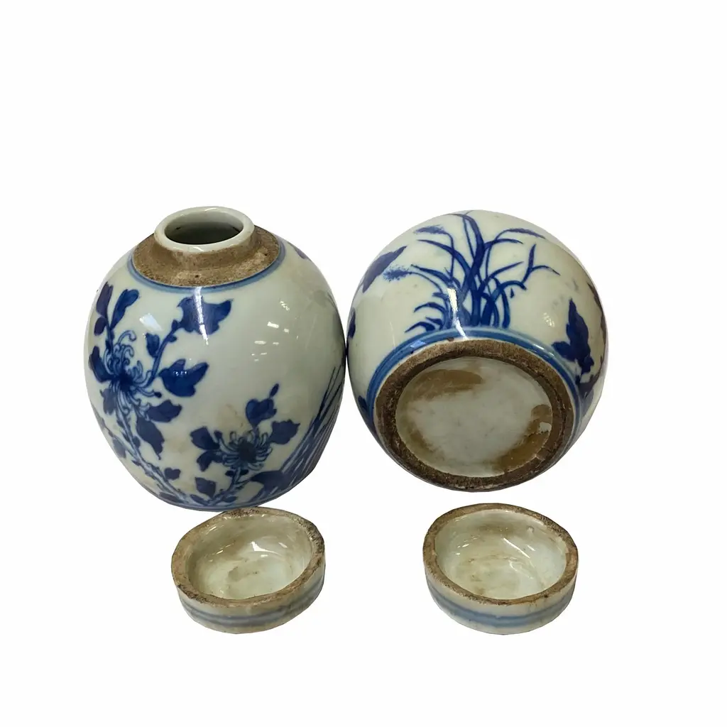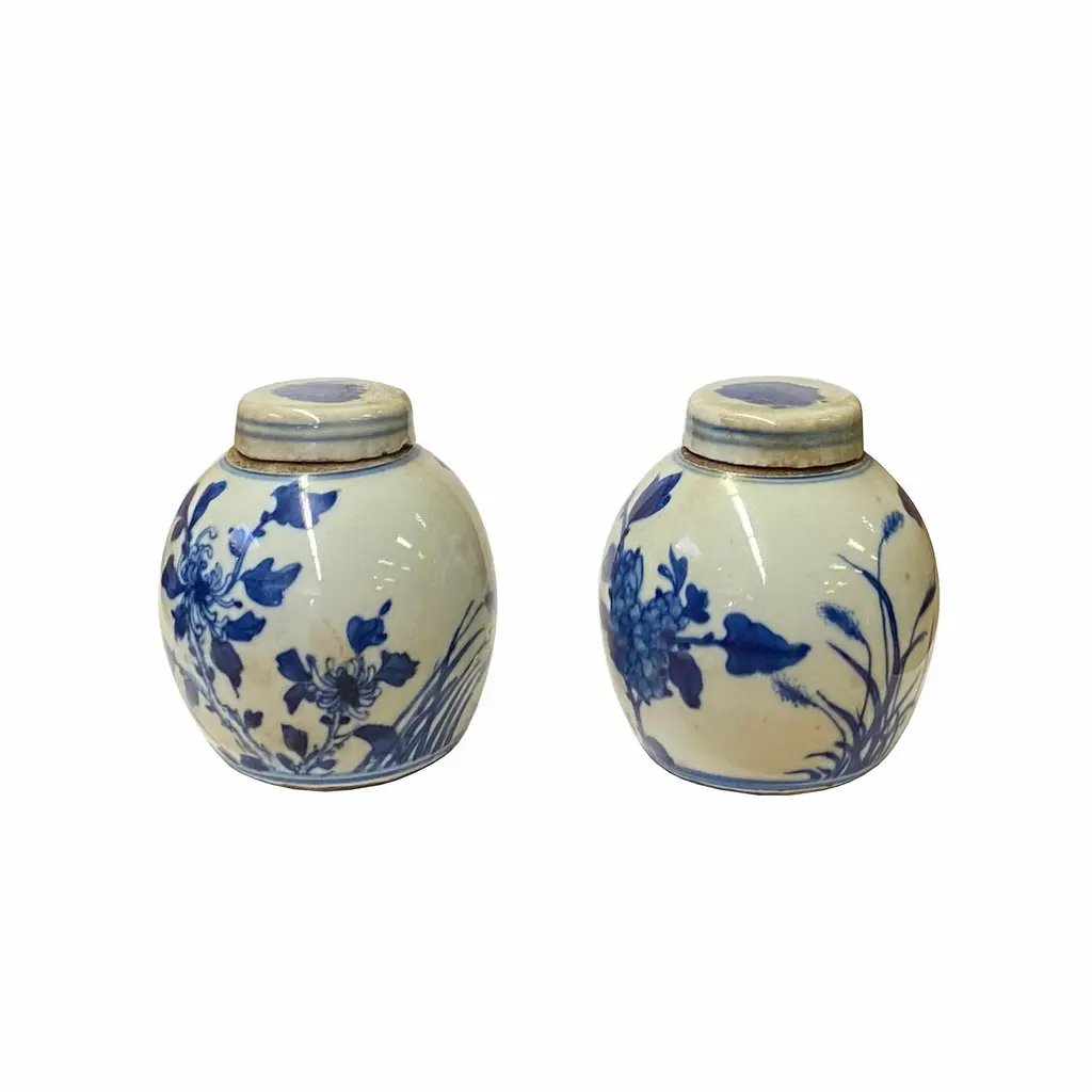 This is a pair of mini size blue and white ginger jars with Chinese Oriental scenery character theme. There is a variation on the hand drawing graphic. Dimensions: Dia 3" x h3.5" each +- 0.25" Origin: China Material: Porcelain Condition: Handmade, vintage style finish, distressed mark surface,