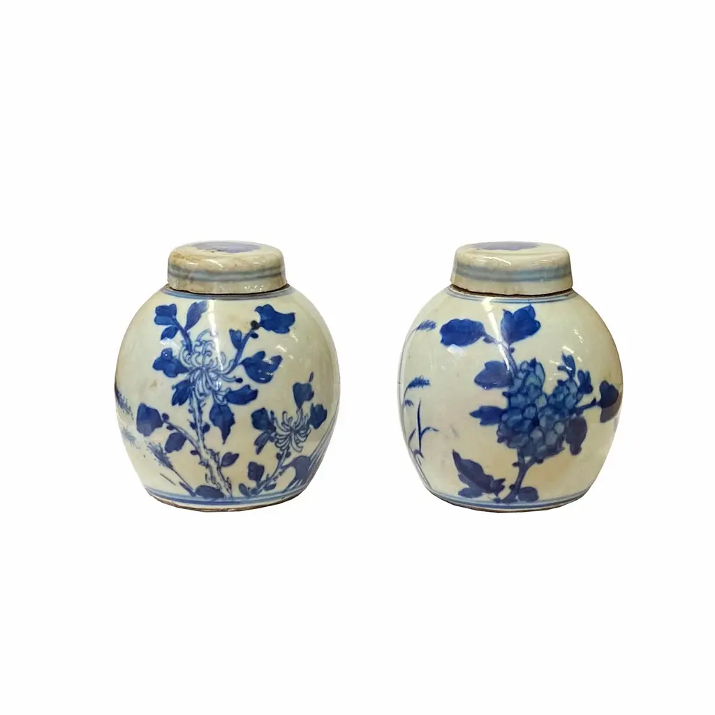 Pair Blue White Mini Oriental Flowers Graphic Porcelain Ginger Jars