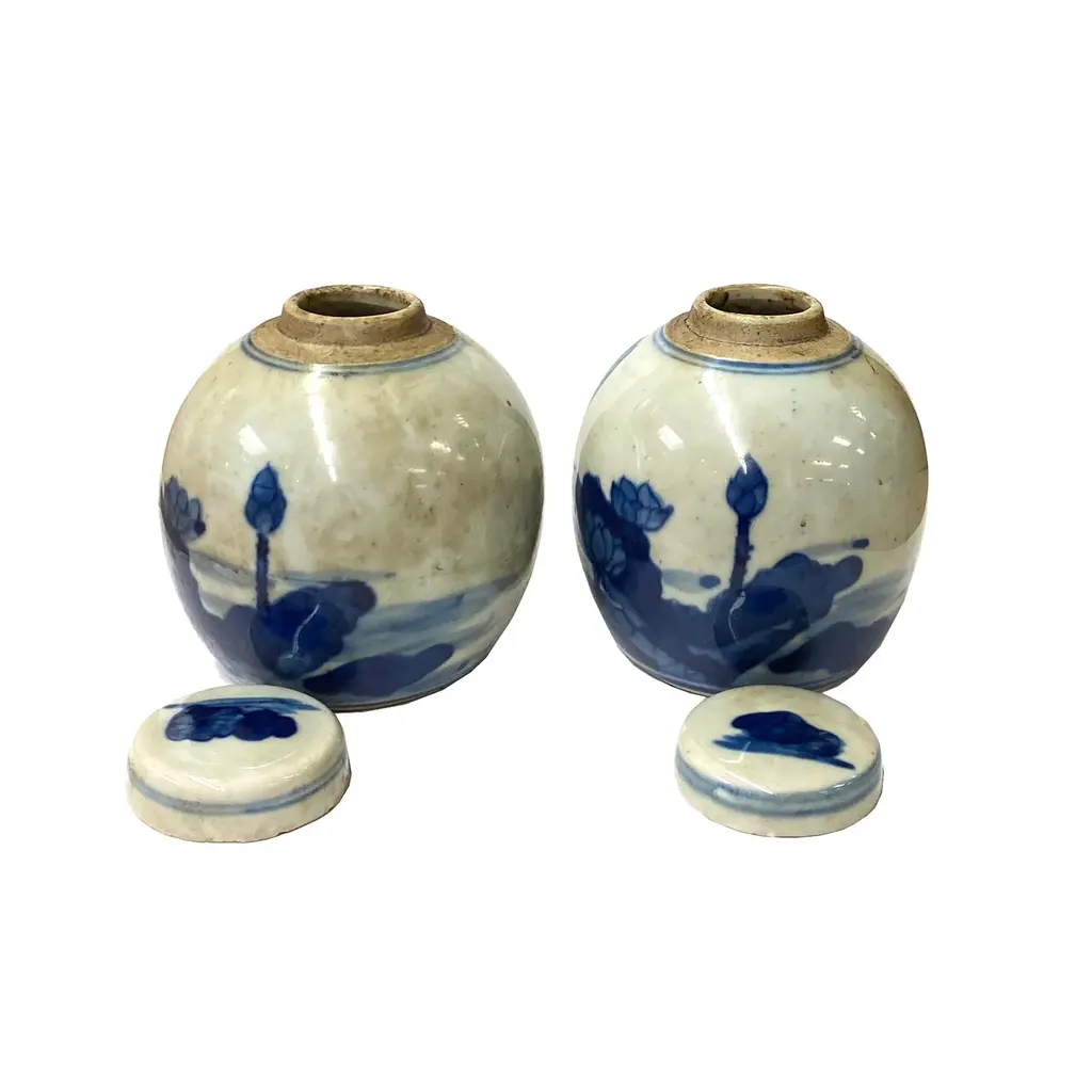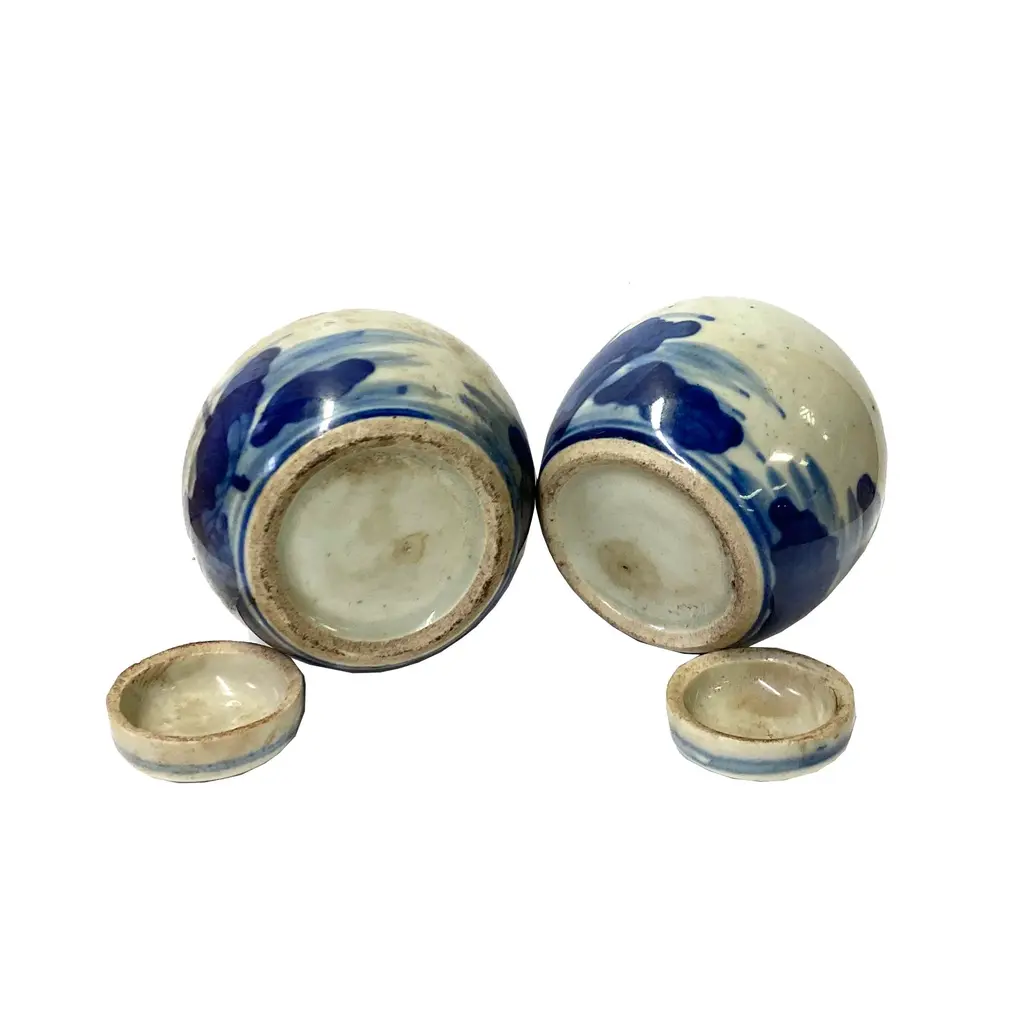 This is a pair of mini size blue and white ginger jars with Chinese Oriental scenery character theme. There is a variation on the hand drawing graphic. Dimensions: Dia 3" x h3.5" each +- 0.25" Origin: China Material: Porcelain Condition: Handmade, vintage style finish, distressed mark surface, good condition