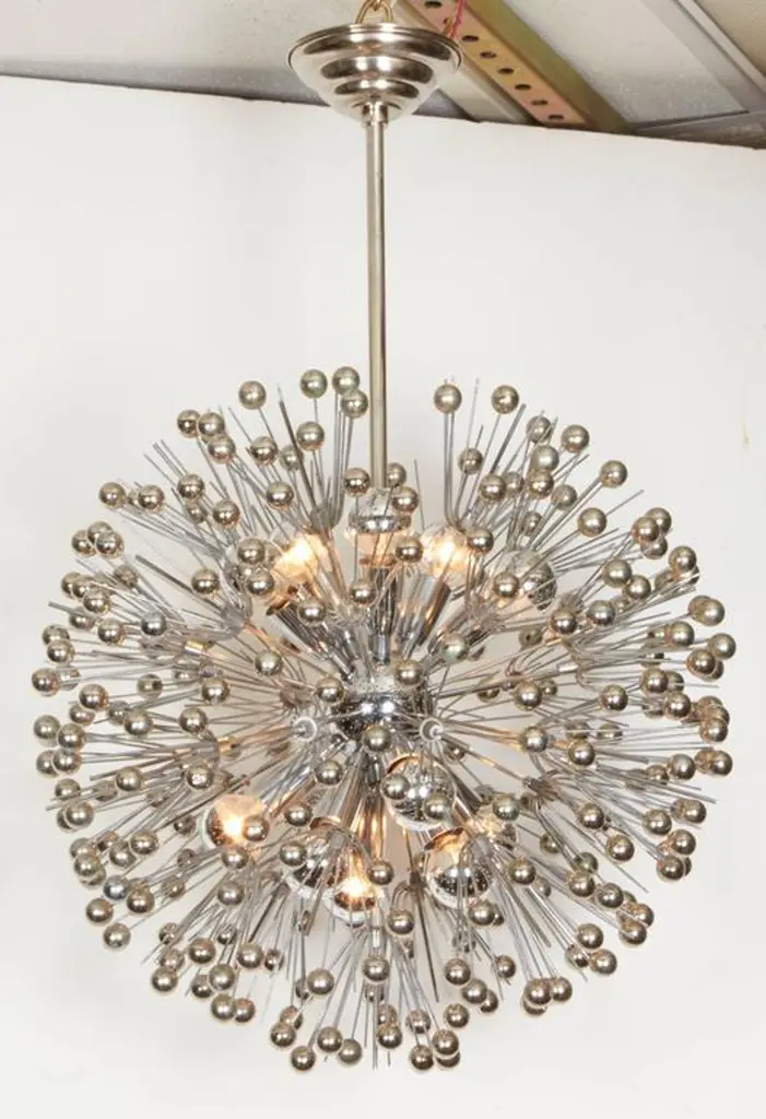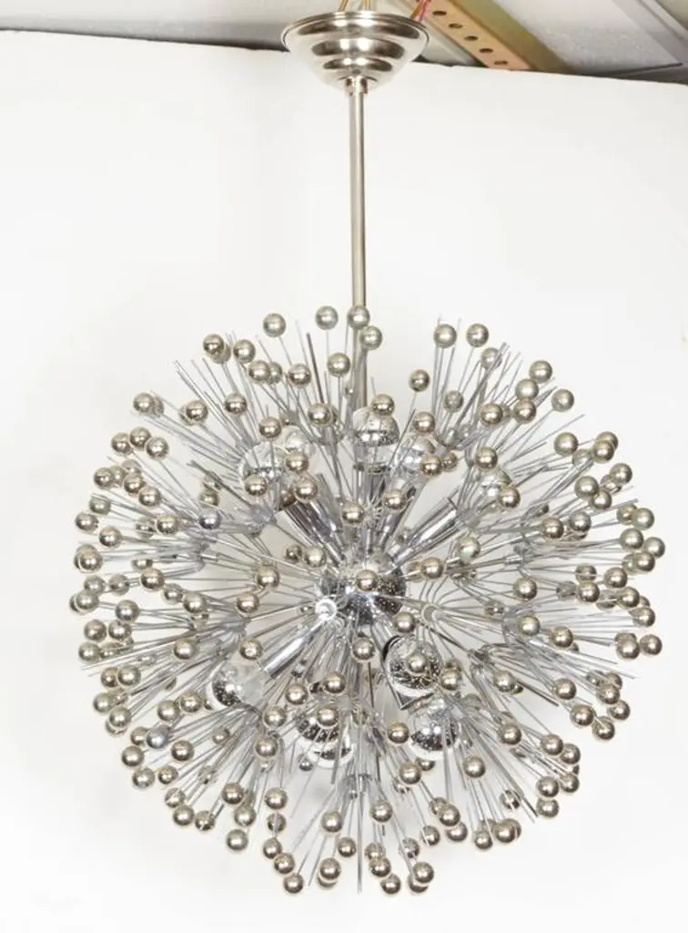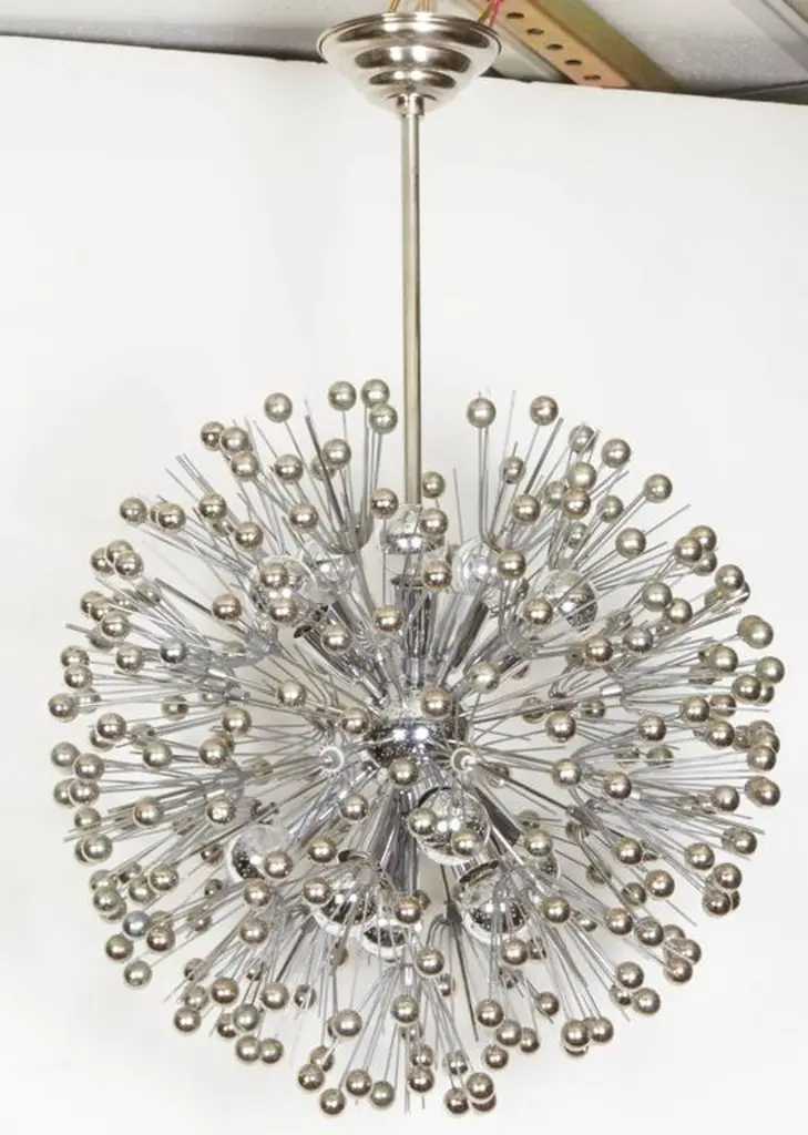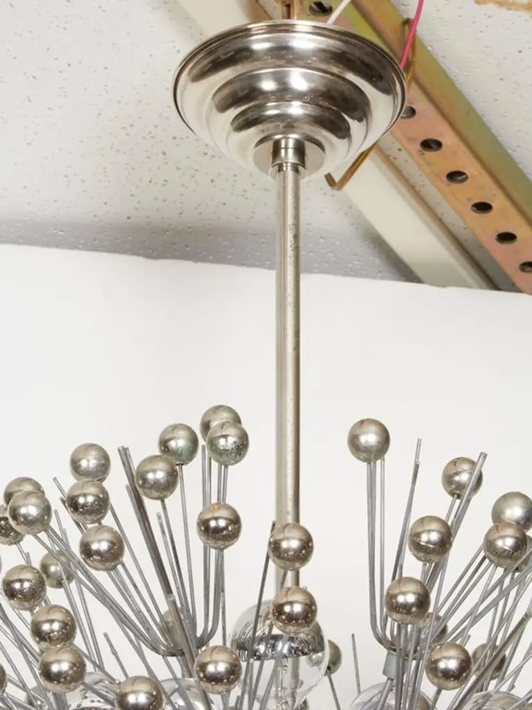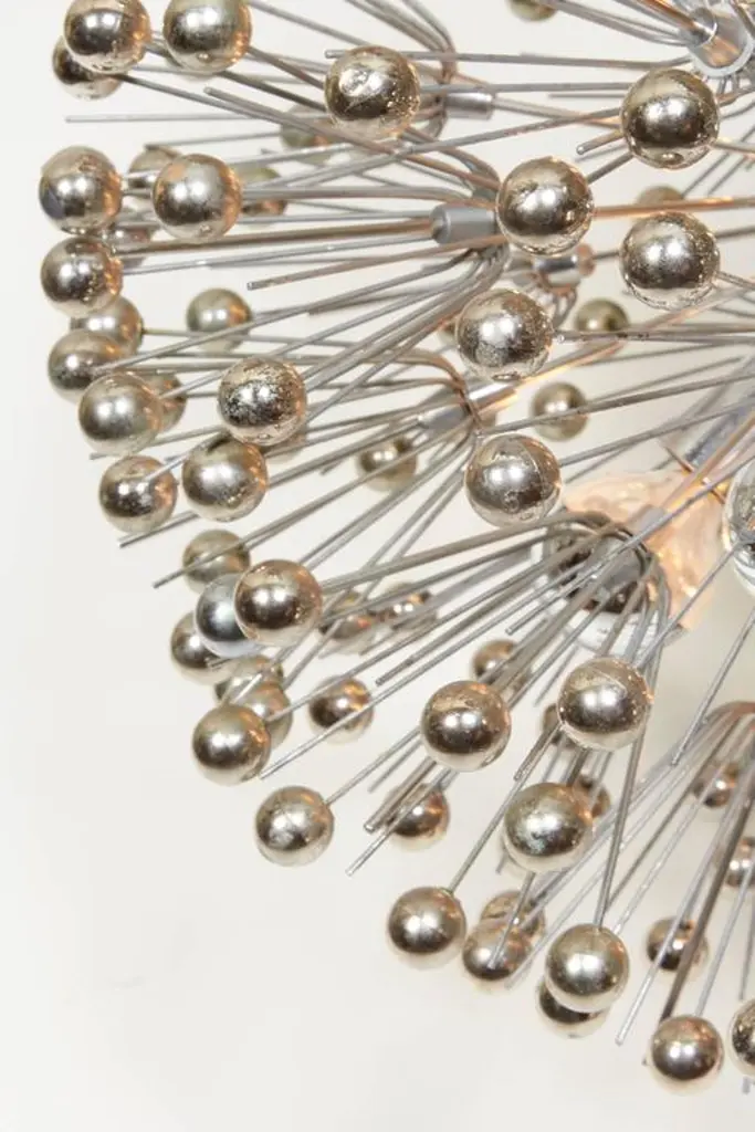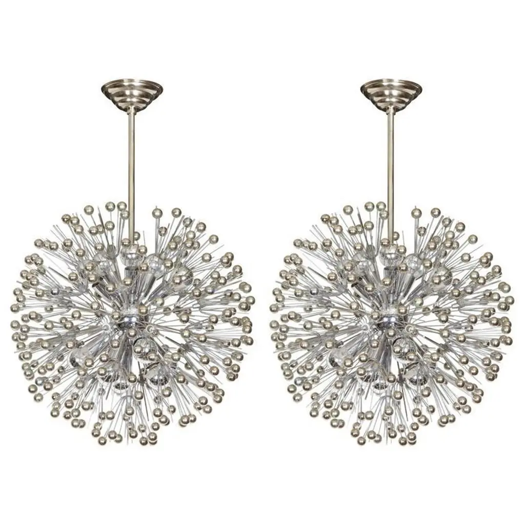 A pair of Modernist, ball tipped snowflake Sputniks in polished nickel with matte spokes in the manner of Emil Stejnar / Rupert Nikoli Austria 1970.The entity, round like a ball radiates outward from a central sphere with many small and delicate ball tips at their end of their rods. This pair of pendant globes showcase a sunburst, blowball / dandelion motif and feature an explosion of a chandelier which will make a lasting impact in your space.The lightbulbs emanate out from the center making a beautiful pattern.The pair can be hung at the same or at varied heights next to each other or separately in adjoining spaces. Can be sold separately. Price is per item / one fixture. Can be lengthened or shortened for a surcharge.Space age, Mid century Modern, Industrial, Minimalist