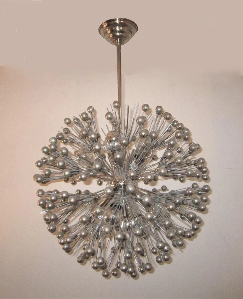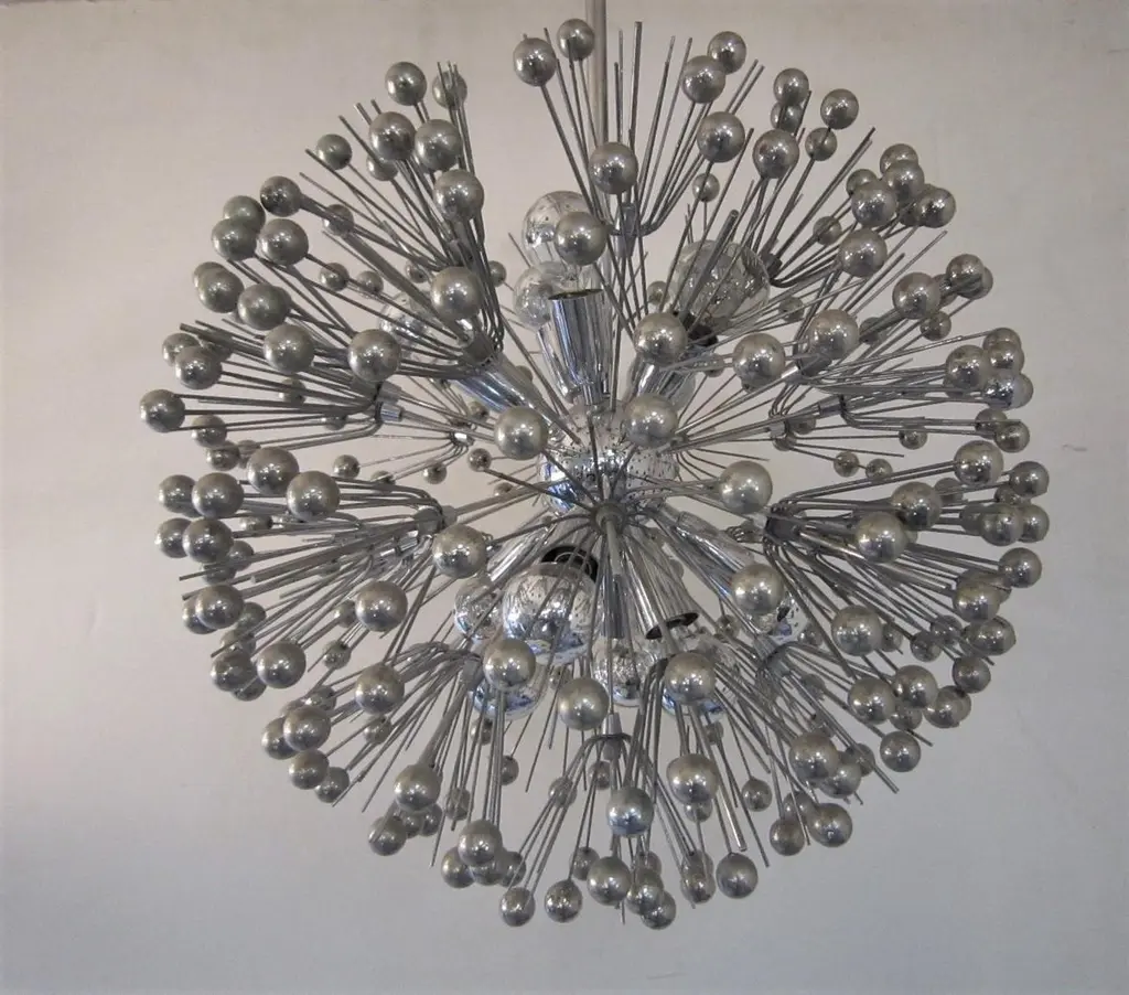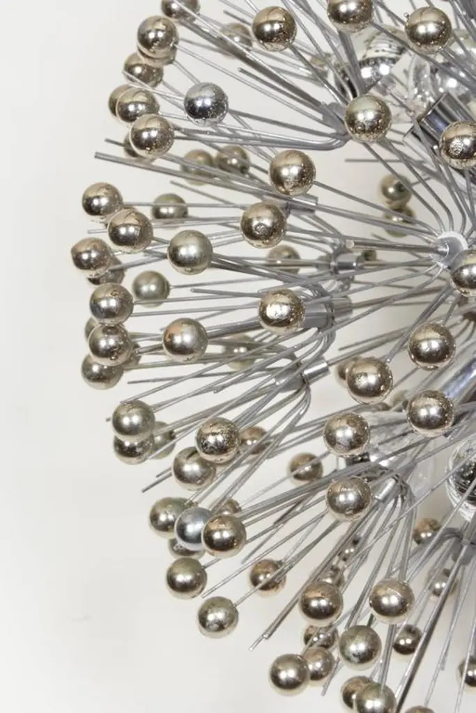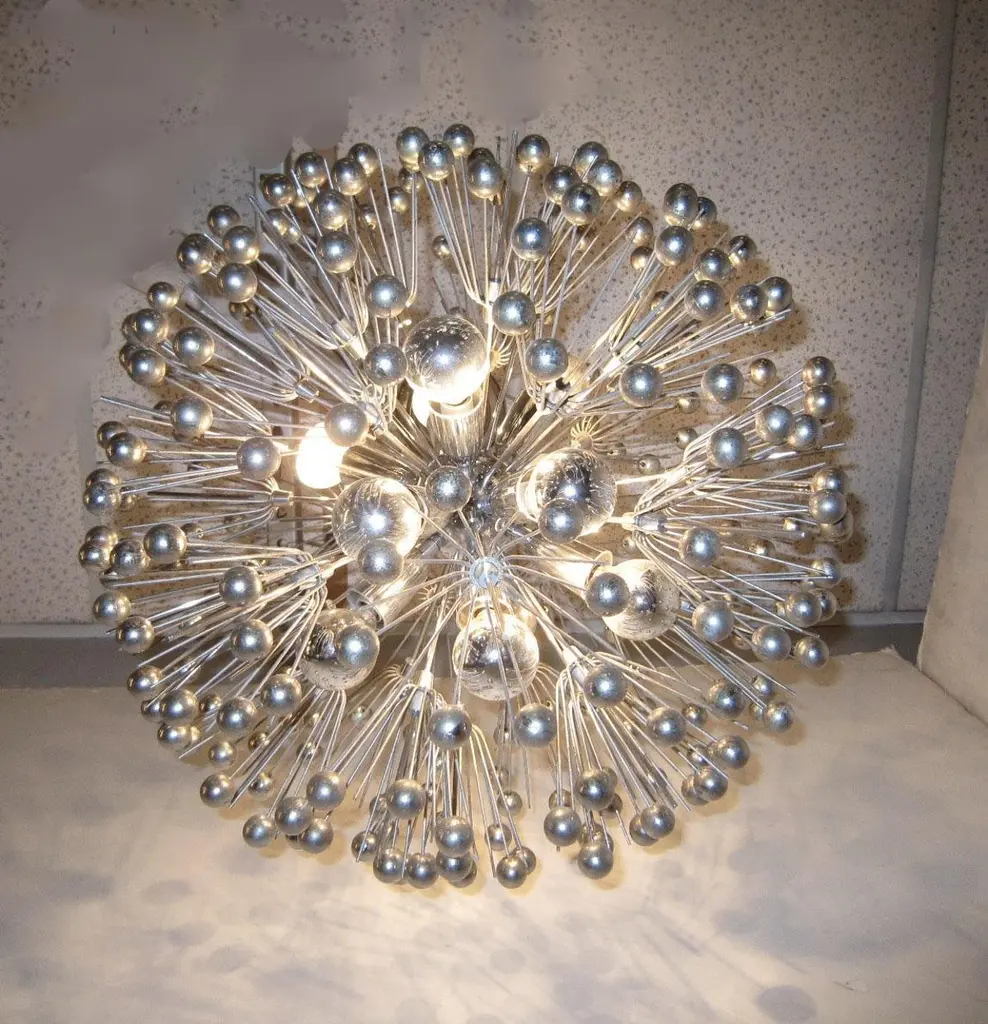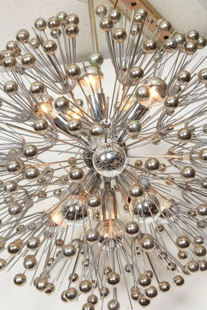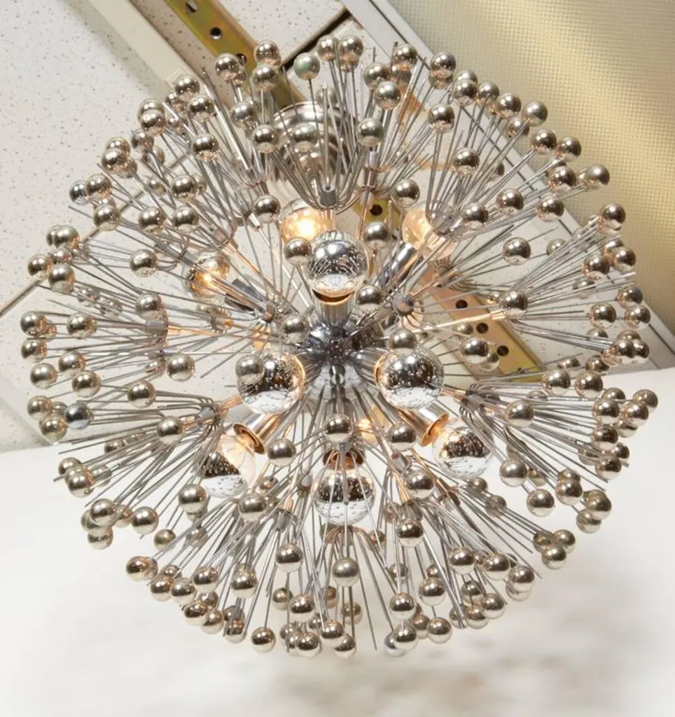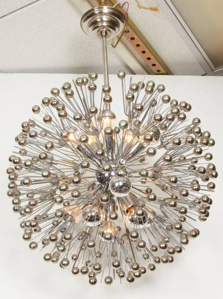 A pair of Modernist, ball tipped snowflake Sputniks in polished nickel with matte spokes in the manner of Emil Stejnar / Rupert Nikoli Austria 1970.The entity, round like a ball radiates outward from a central sphere with many small and delicate ball tips at their end of their rods. This pair of pendant globes showcase a sunburst, blowball / dandelion motif and feature an explosion of a chandelier which will make a lasting impact in your space.The lightbulbs emanate out from the center making a beautiful pattern.The pair can be hung at the same or at varied heights next to each other or separately in adjoining spaces. Can be sold separately. Price is per item / one fixture. Can be lengthened or shortened for a surcharge.Space age, Mid century Modern, Industrial, Minimalist