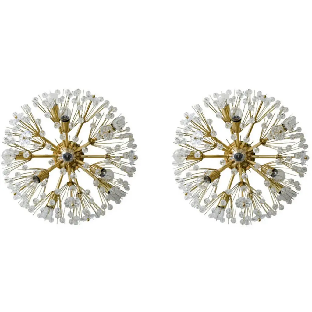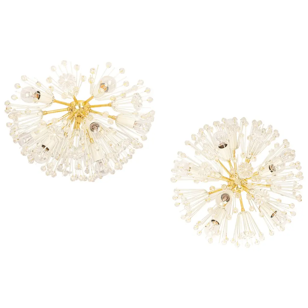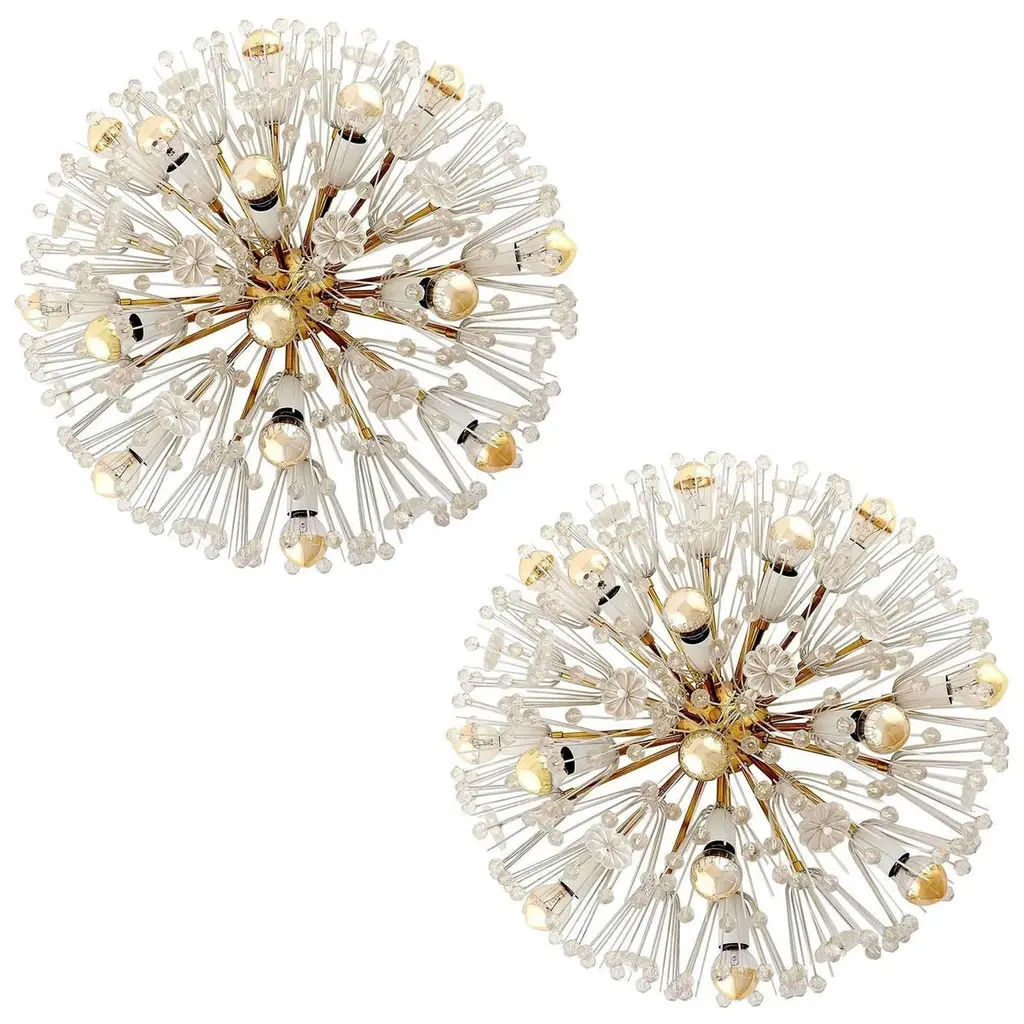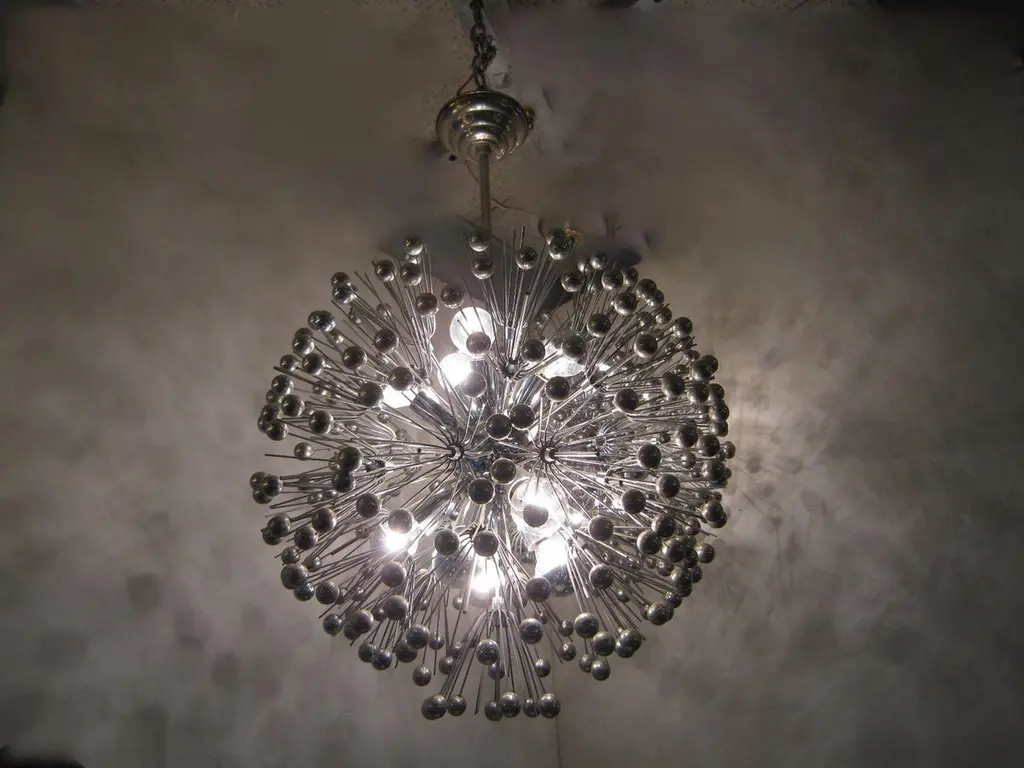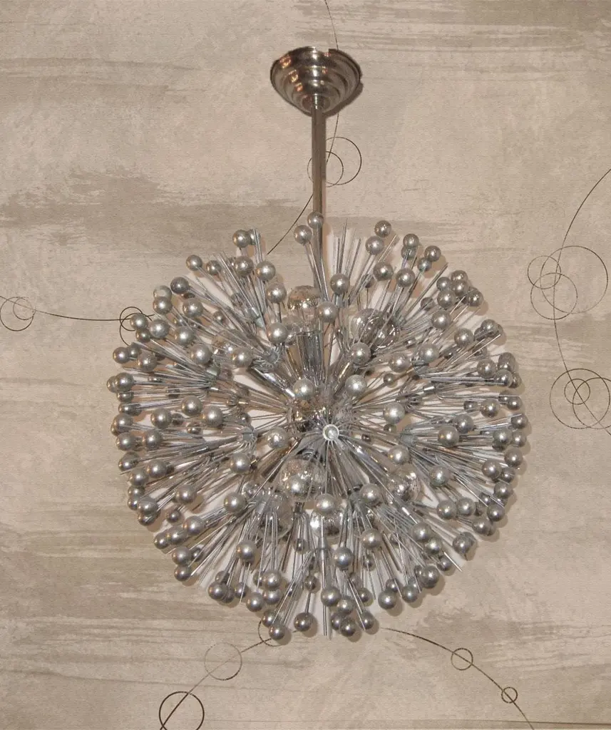 A pair of Modernist, ball tipped snowflake Sputniks in polished nickel with matte spokes in the manner of Emil Stejnar / Rupert Nikoli Austria 1970.The entity, round like a ball radiates outward from a central sphere with many small and delicate ball tips at their end of their rods. This pair of pendant globes showcase a sunburst, blowball / dandelion motif and feature an explosion of a chandelier which will make a lasting impact in your space.The lightbulbs emanate out from the center making a beautiful pattern.The pair can be hung at the same or at varied heights next to each other or separately in adjoining spaces. Can be sold separately. Price is per item / one fixture. Can be lengthened or shortened for a surcharge.Space age, Mid century Modern, Industrial, Minimalist