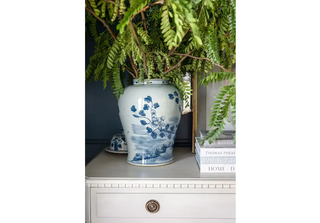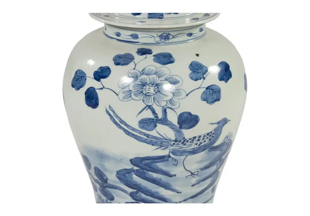 The Peony Flight Jar pairs graceful pheasants with hand-painted peonies. Finished in traditional blue and white with a fitted lid, it's a collectible accent that blends artistry, heritage, and elegance.