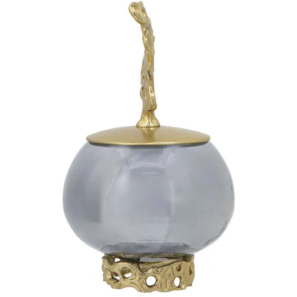 Accenting soft gold tones and translucent black glass create the Percy glass lidded jar, adding a sleek accent for any contemporary design. The distinct design of the gold honeycomb pattern inspires the crafted look of the aluminum crating the base and lidded accent for the jar. Perfectly accenting your contemporary decor, add new textures and accent a table or modern kitchen with the Percy jar.