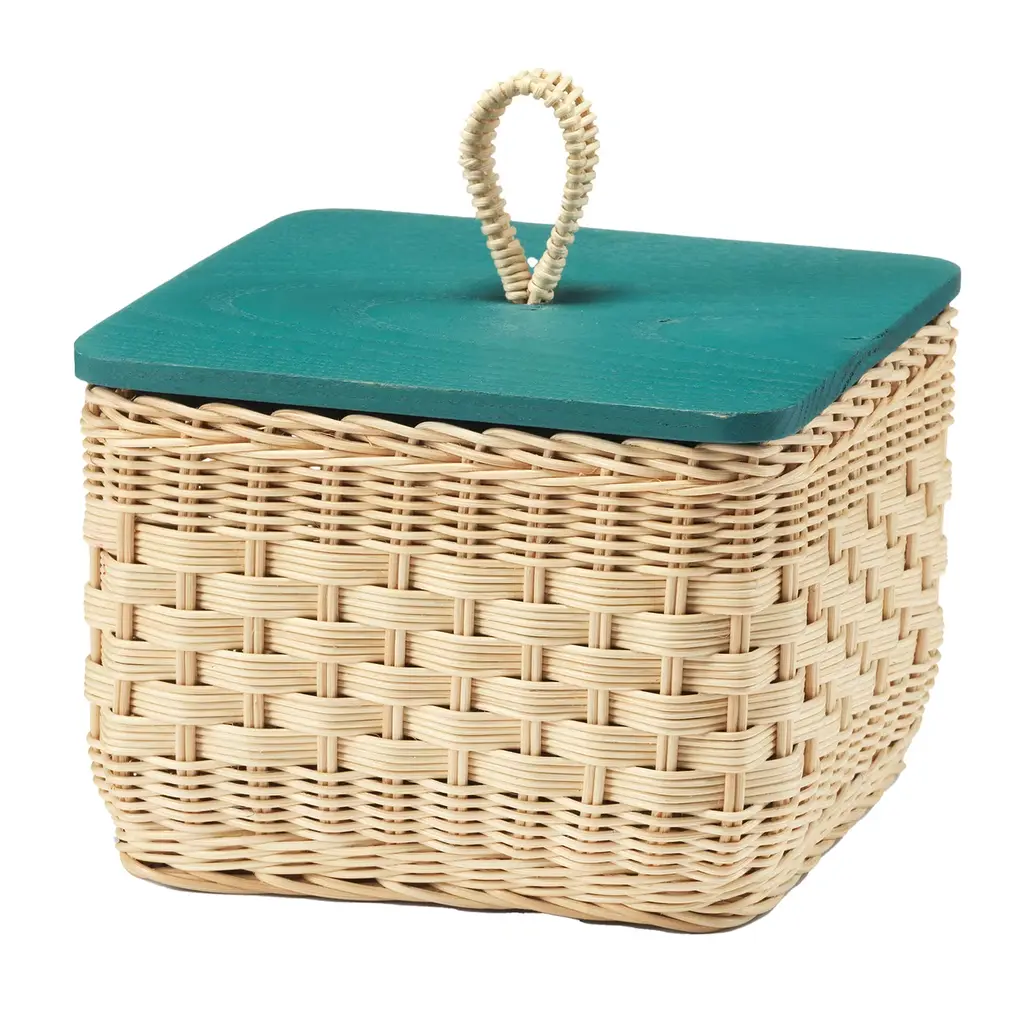 A singular design from the Perla series of multifunctional hand-woven boxes, this splendid piece will be perfect for storing objects, personal belongings, or toiletries alike. Boasting a cylindrical wicker body. it features blue details colored with a natural pastel, and a solid ash wood lid finished with a water-based treatment, finally completed with a pastel blue wicker handle. Please consult the Artemest catalog for other shape and color options.