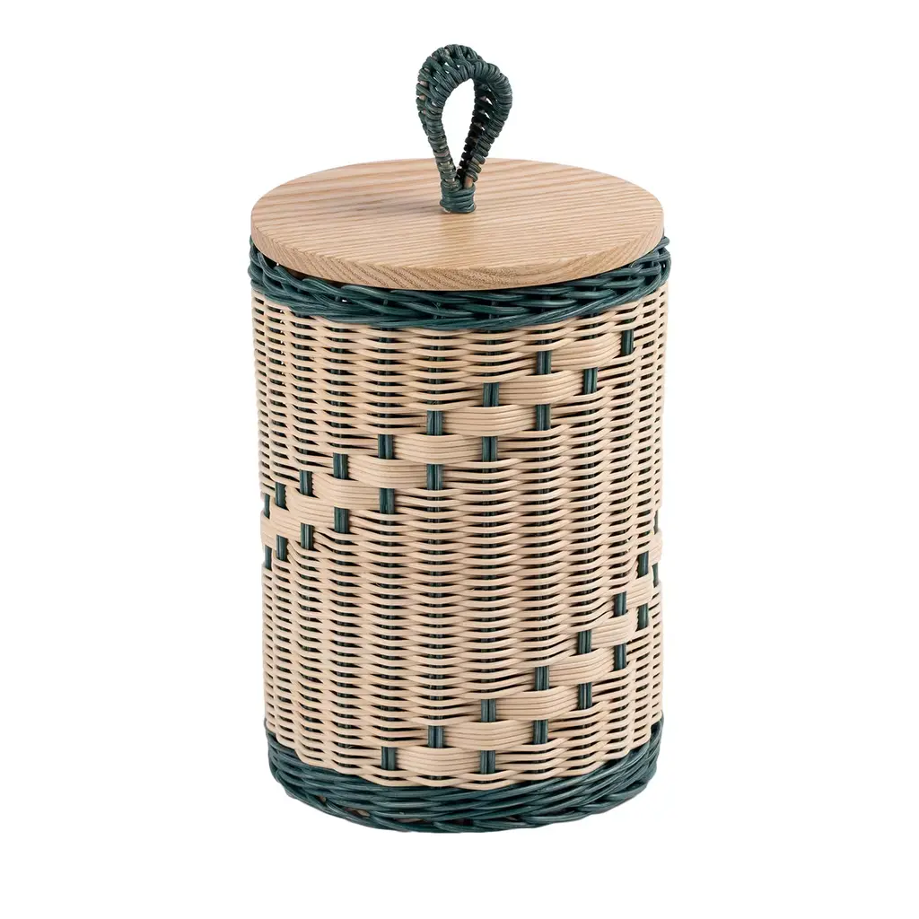 Part of the Perla series of multifunction hand-woven boxes, this design exudes timeless elegance. Ideal for storing objects, personal belongings, or toiletries, it features a cylindrical wicker body enriched with pink details, colored with a natural pigment extracted from madder. Completed with a solid ash wood lid finished with a water-based treatment, topped with a pink-hued wicker handle. Please consult the Artemest catalog for other shape and color options.
