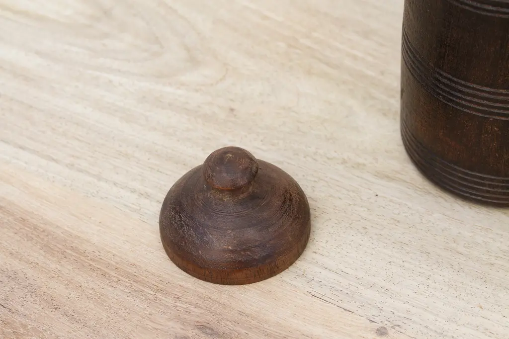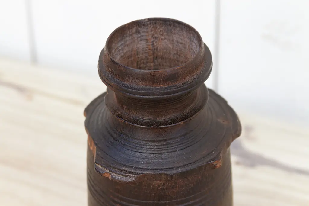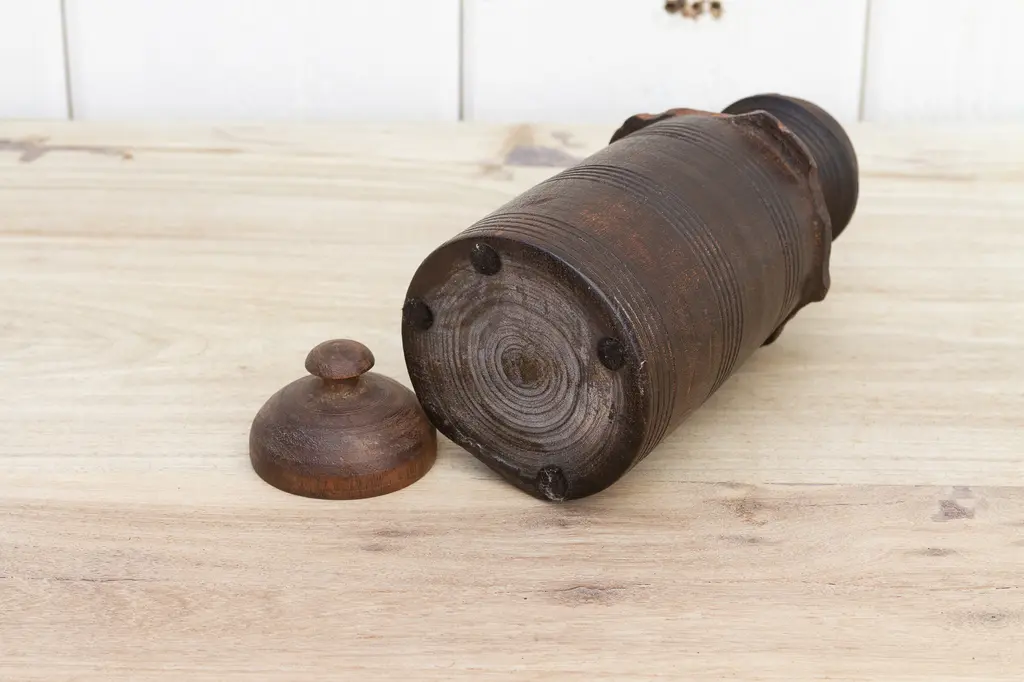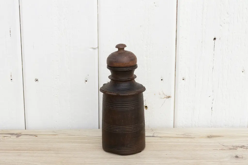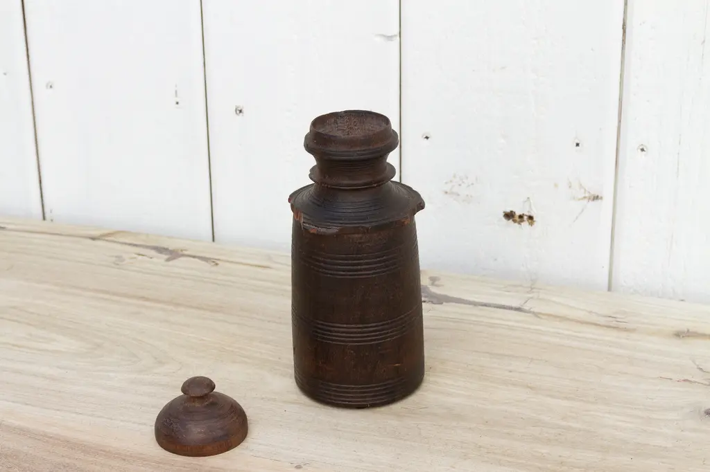 Wonderful early 20th century wood pot from Nepal. This antique "Tekhi" container comes from the mountains of Nepal where it was used to store food. This antique vessel is hand turned from hard wood and shows a lustrous wax patina with a lovely wooden grain. This antique wooden pot has a rounded fitted lid.