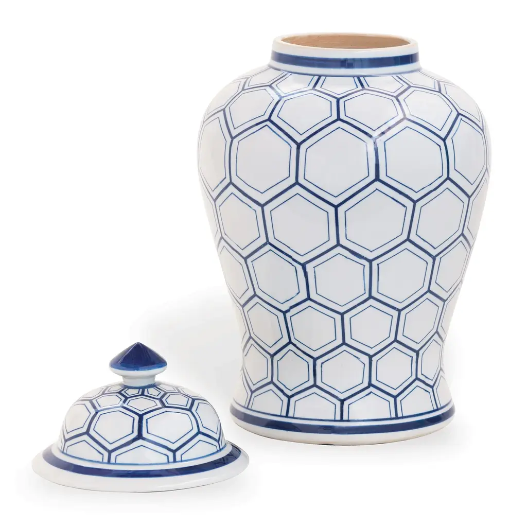 This classic temple jar by Port 68 features a Kenilworth honeycomb pattern in blue or brown on white porcelain. Perfect in pairs on the mantle or grouped on a table.
