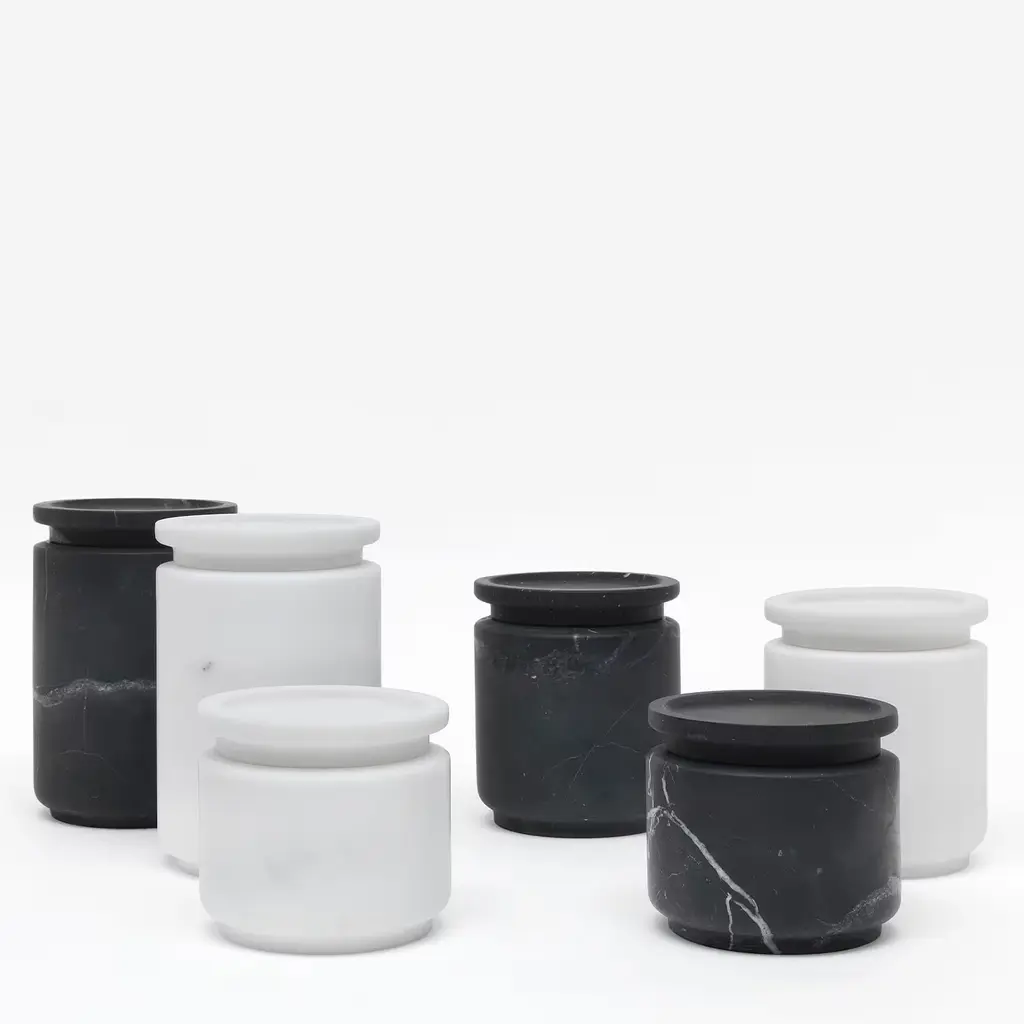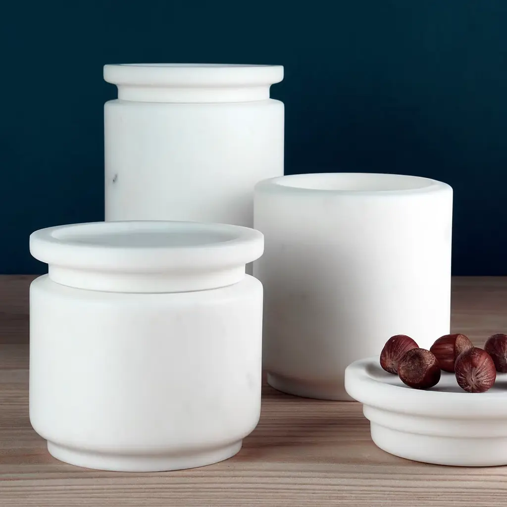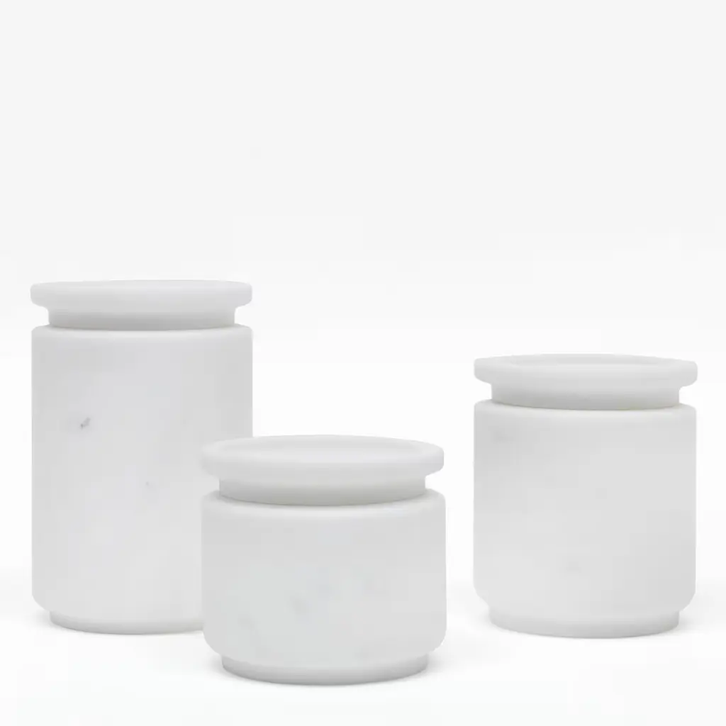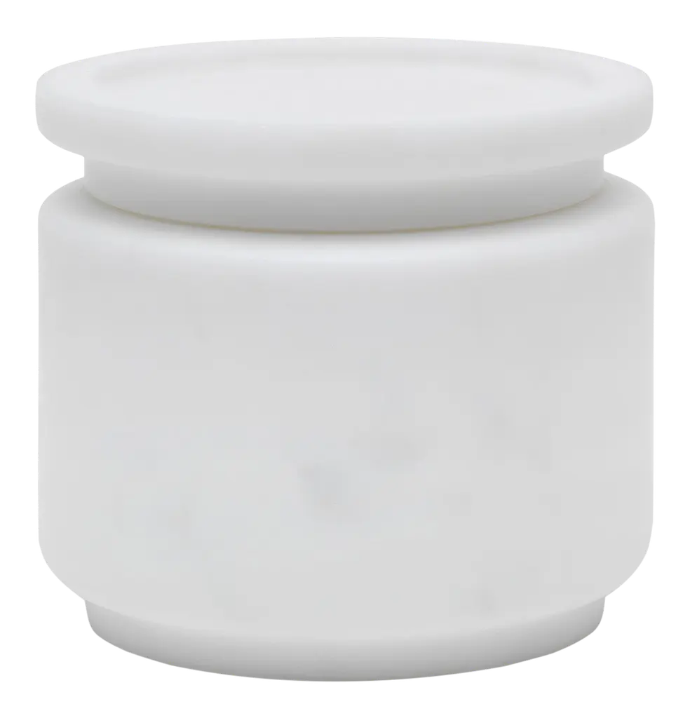 As functional as it is alluring, this medium version of the jar from the Pyxis Collection will be a luminous addition to any contemporary kitchen. Its ethereal body in prized white Michelangelo marble is one-of-a-kind thanks to its sublime hue and veining. The cylindrical profile features harmonious indentations at the base and along the lower portion of the lid for increased functionality and visual appeal. Please note that marbles and stones are natural materials and they can differ also if coming from the same quarry or the same block. The product shown may differ from purchased items. Every piece is unique.