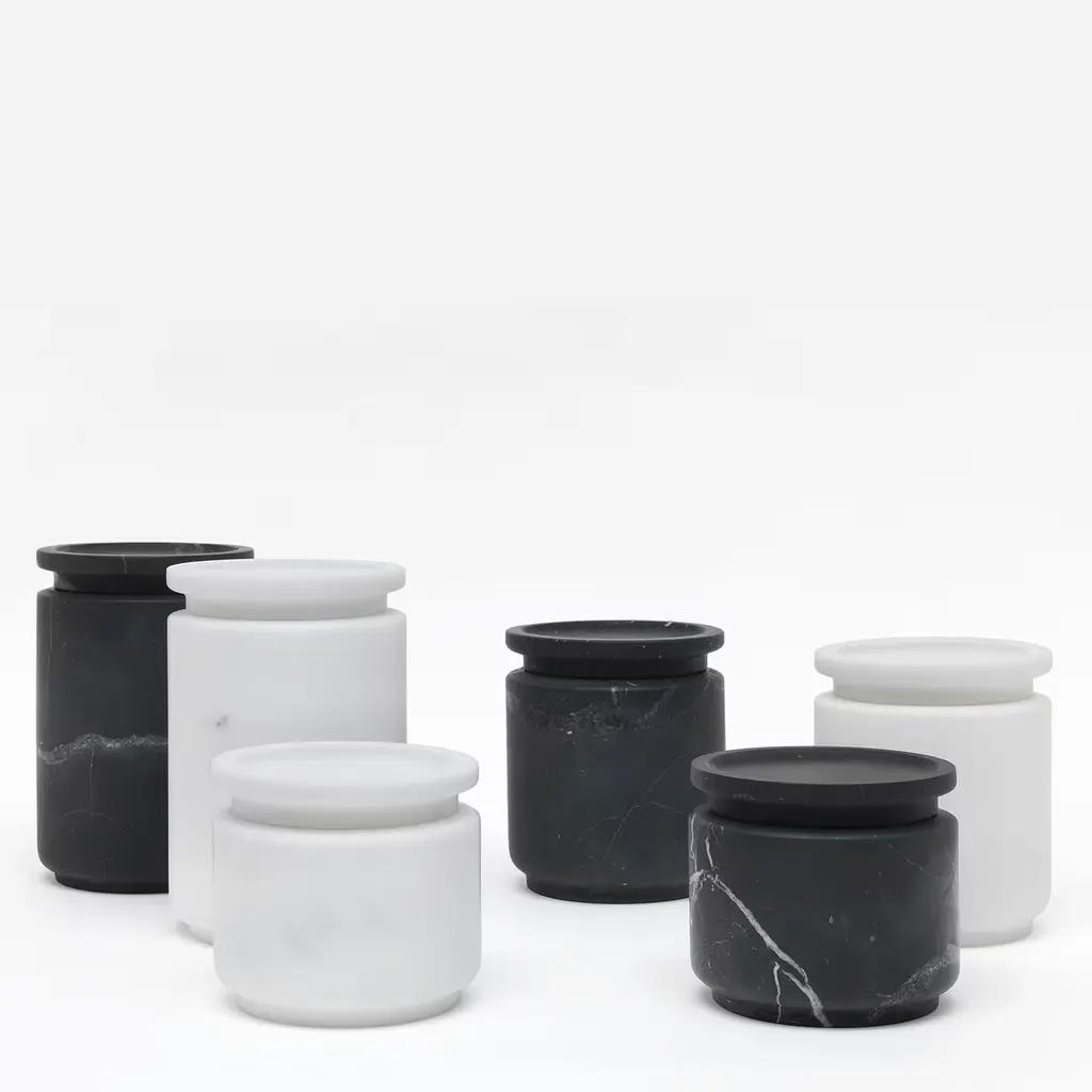 The unpredictable aesthetic of marble was chosen by designer Ivan Colominas as the medium for his Pyxis Collection of jars. This small variant in black Marquina marble boasts a compact shape slightly tapered at the base and whose lid features a recessed profile for optimized grip and opening. Also available in two larger variants, this remarkable kitchenware item will infuse a dash of luxury to any contemporary kitchen counter. Please note that marbles and stones are natural materials and they can differ also if coming from the same quarry or the same block. The product shown may differ from purchased items. Every piece is unique.