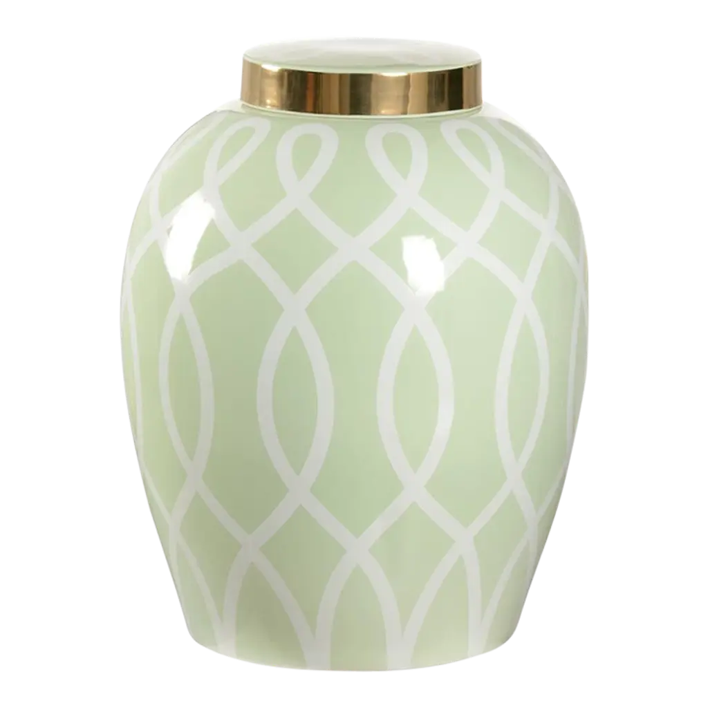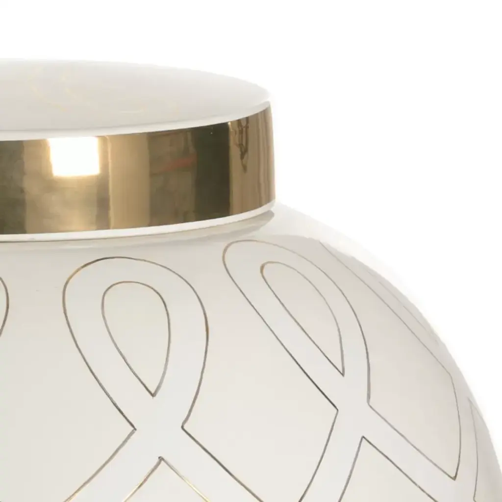 A Midsize Ginger Jar Featuring An Elongated Graceful Geometric Design In Metallic Satin Gold With A Coordinating Lid Detail. Available In A Variety Of Colors.