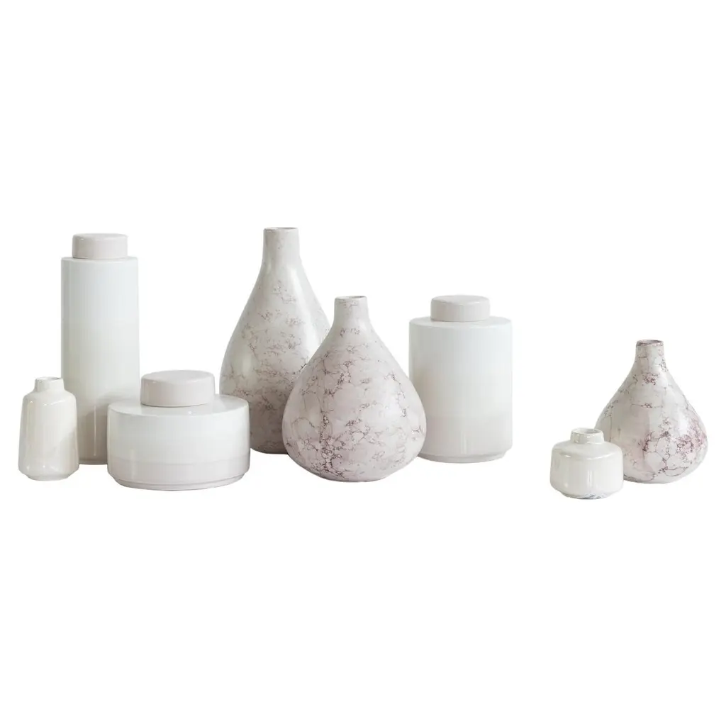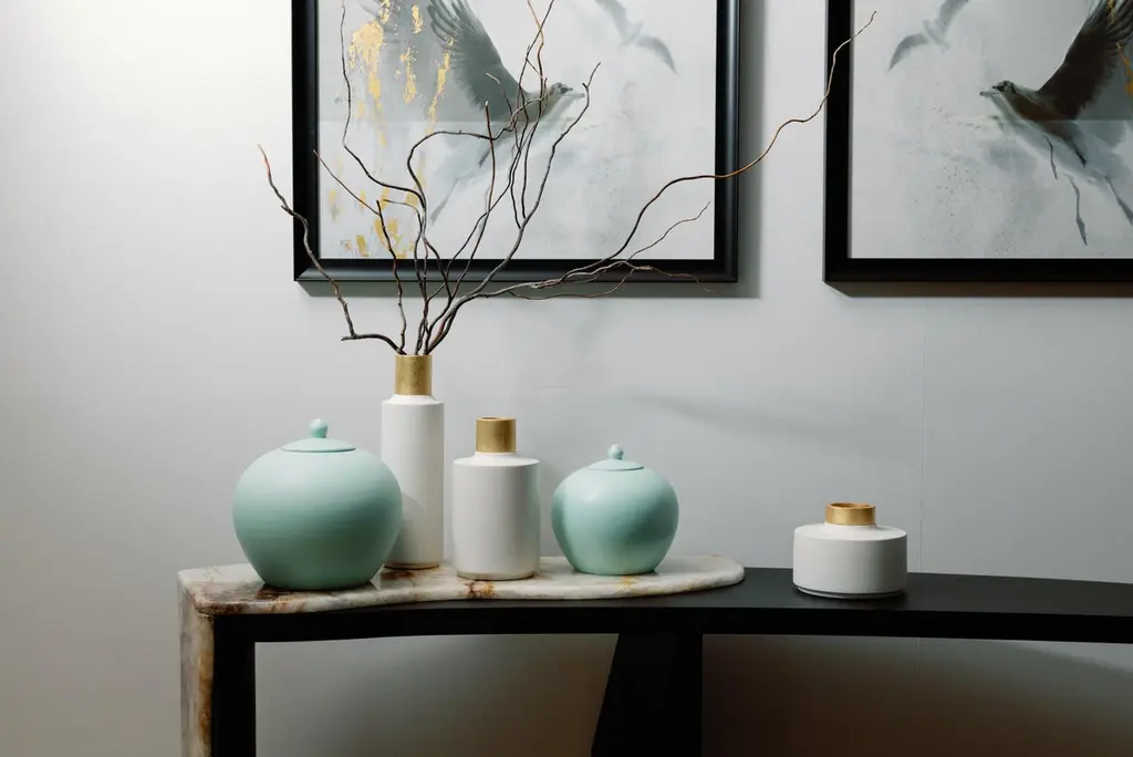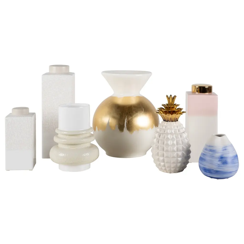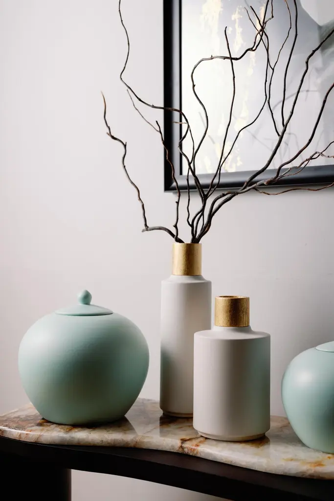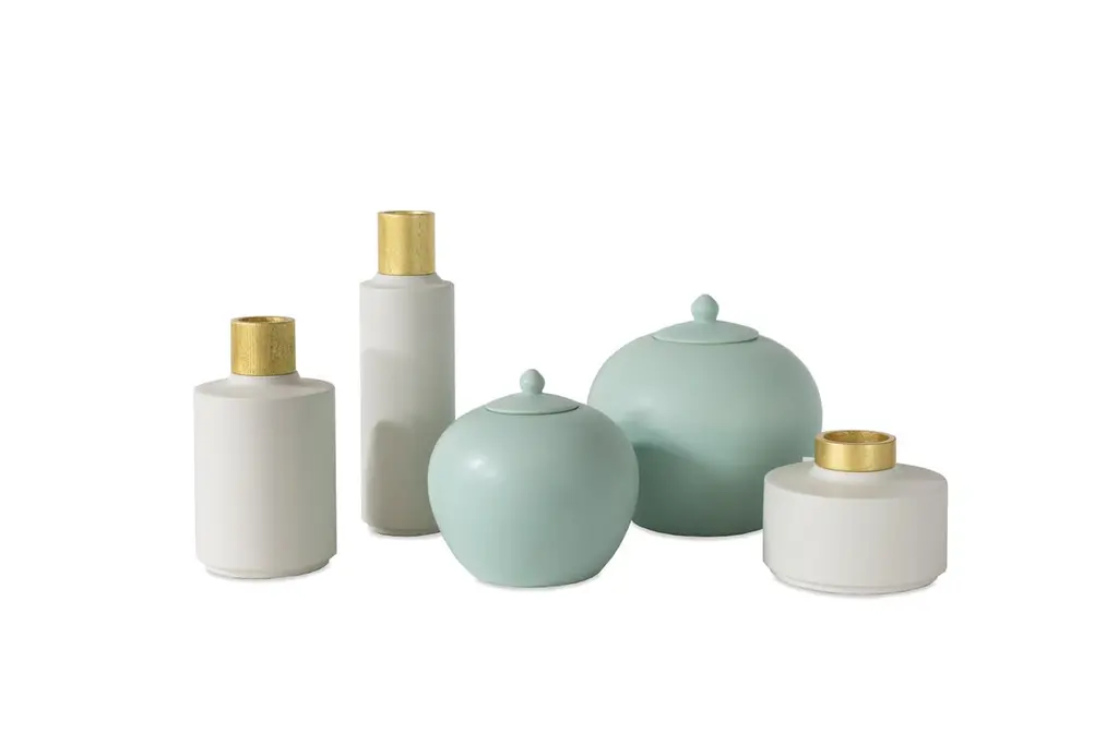 Set/5 Ceramic Jars & Pots, Lusitanus Home Collection, Handcrafted in Portugal - Europe by Lusitanus Home.This beautiful set includes three waterproof ceramic jars and two ceramic pots with lid, perfect to be displayed together in endless combinations, with or without flowers.Each piece has its own elegant silhouette, featuring different shapes in white and mint-green glazed ceramic, with gold leaf details applied by hand.Set of 3 Ceramic Jars KymeDi.11 x H.34cm / Di.4.33 x H.13.39 inDi.14 x H.25cm / Di.5.51 x H.9.84 inDi.17,5 x H.12,5cm / Di.6.89 x H.4.92 inSet of 2 Ceramic Pot w/Lid Taylor Di.25 x H.25cm / Di.9.84 x H.9.84 inDi.20 x H.20cm / Di.7.87 x H.7.87 inHandcrafted in Portugal - Europe by GreenappleUnique by design, Crafted by peopleFounded in 2005 by Sérgio Rebola and Rute Martins, Greenapple designs and produces in-house luxury furniture for exclusive customers worldwide.Our own in-house production facility allows us to be obsessed with detail, and gives us the freedom to dedicate ourselves to the most demanding tailor-made and customised work. As Rute designs all the unique pieces, Sérgio assures the high-quality standards through the whole process - from design to production; from production to your home. Fine craftsmanship, whether perfected by experienced hands or state-of-the-art machinery is quintessential in delivering top quality experiences.