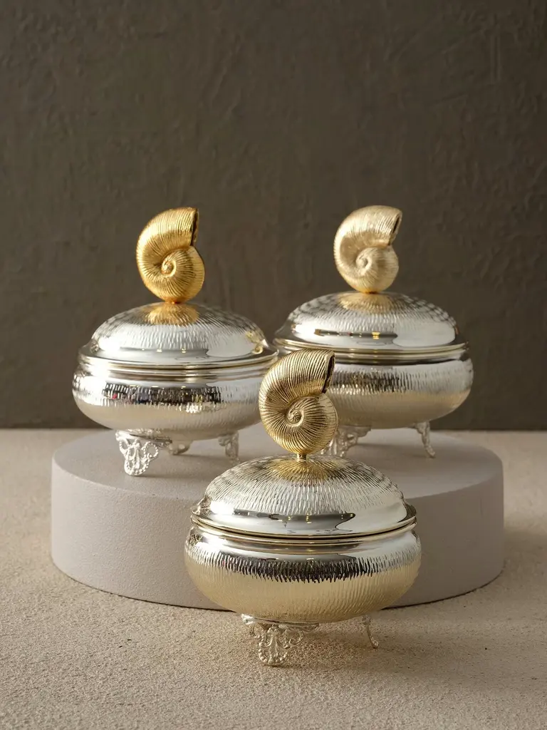 Inspired by the ocean’s natural elegance, this Silver Nautilus Marble Box Set offers a refined balance between organic form and luxurious craftsmanship. Each piece in the trio is crafted from smooth marble and topped with a silver-finished nautilus shell—bringing a coastal yet contemporary spirit to your interior. Whether displayed together or styled individually, these sculptural boxes are perfect for holding jewelry, keepsakes, or small treasures while adding a maritime charm to coffee tables, consoles, or vanities.