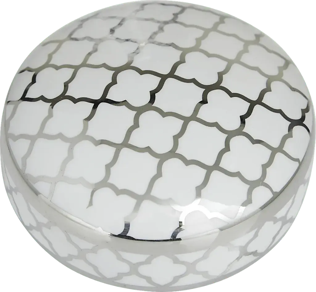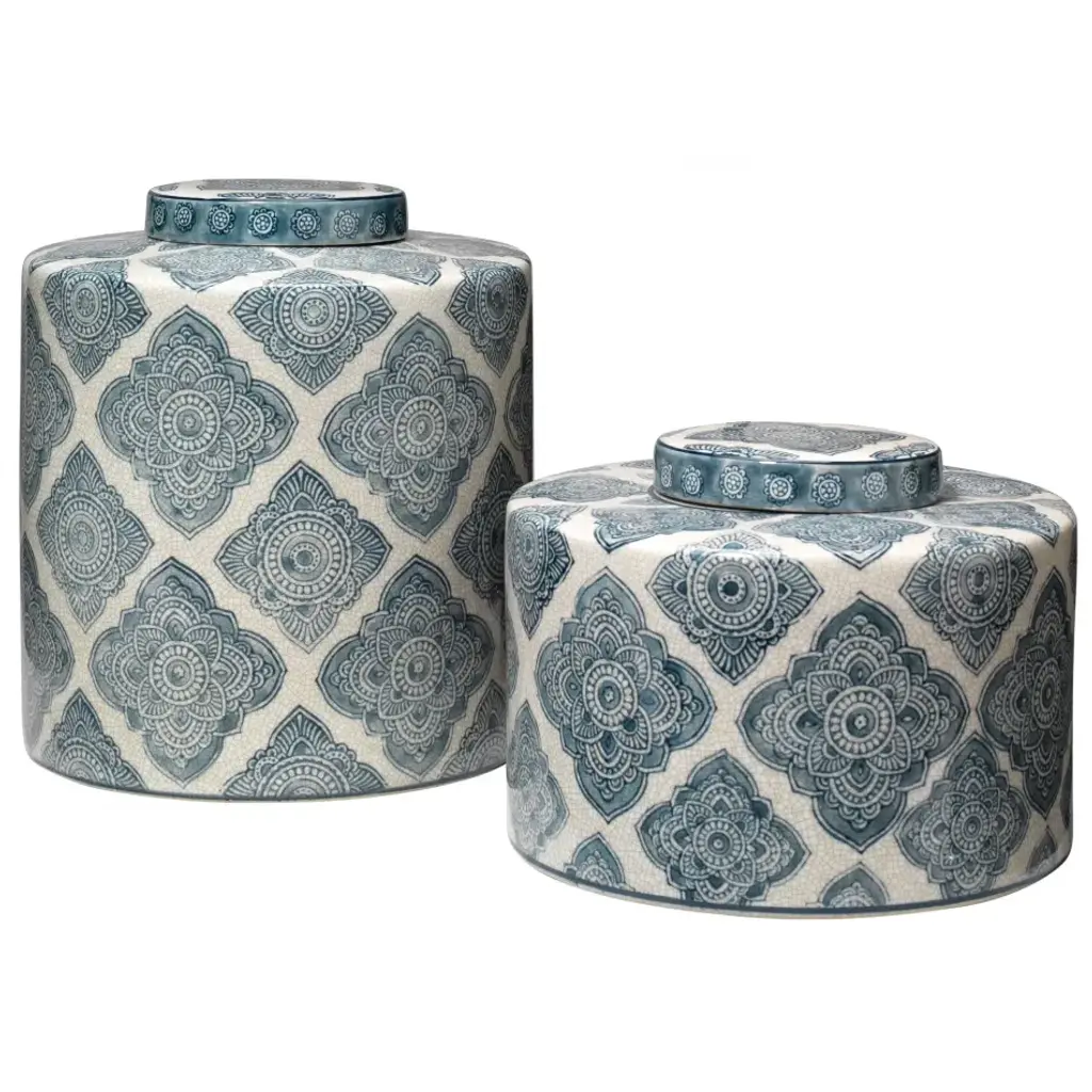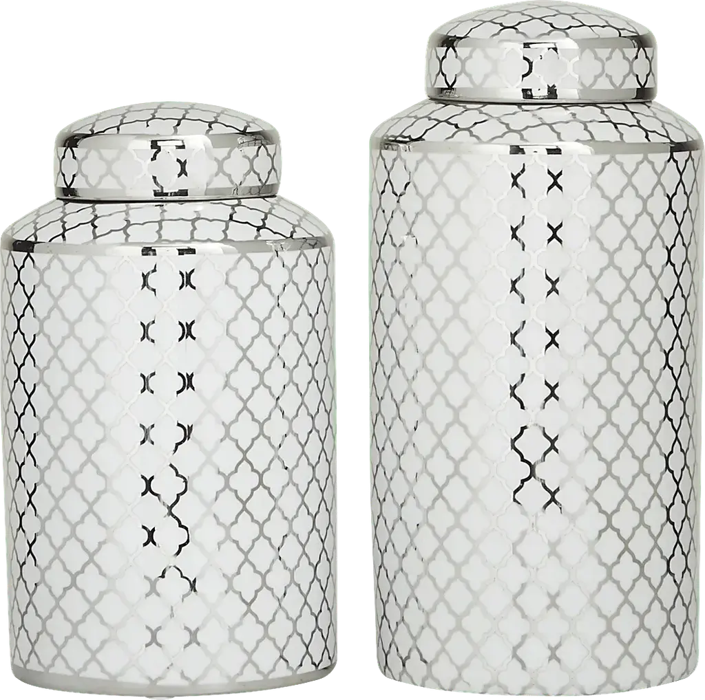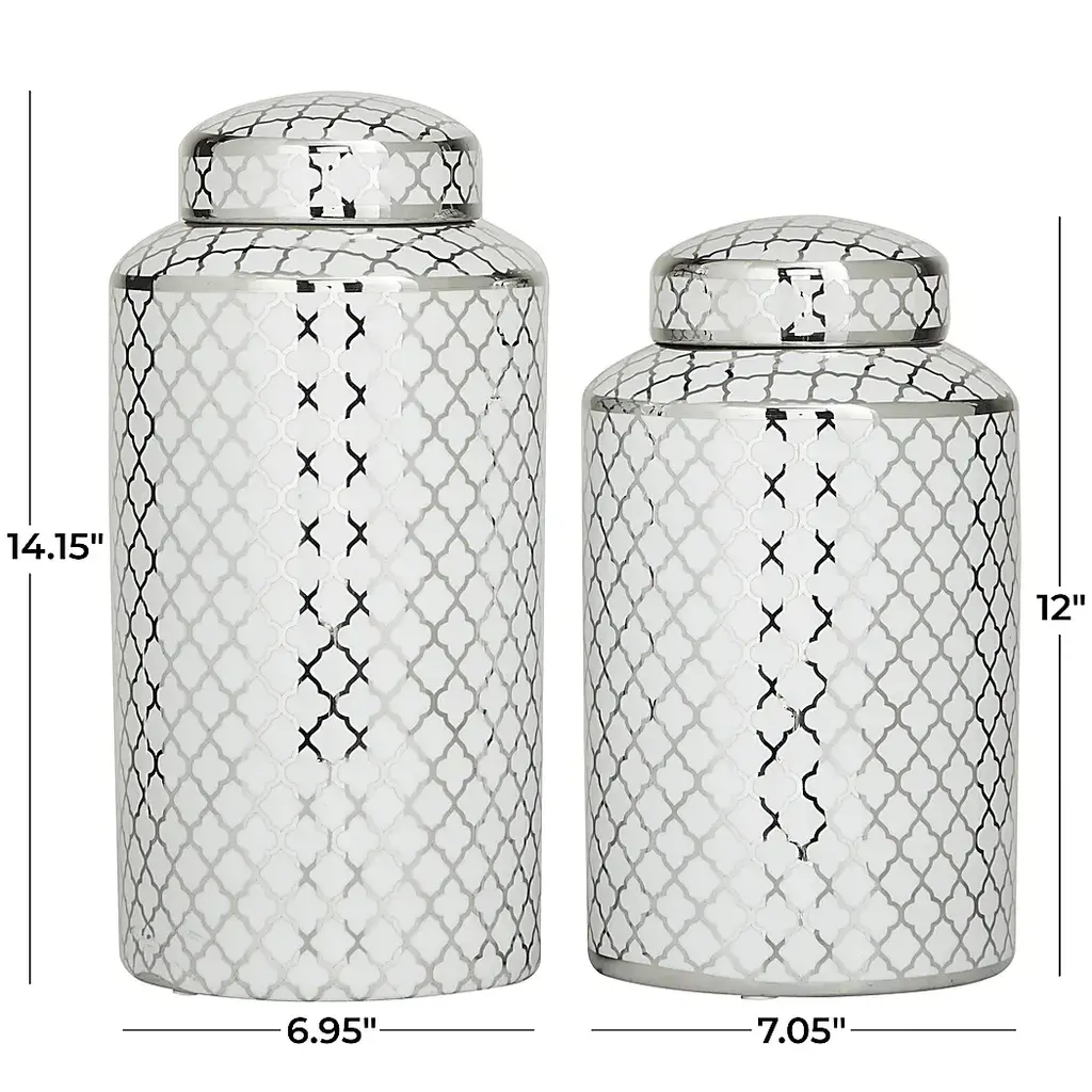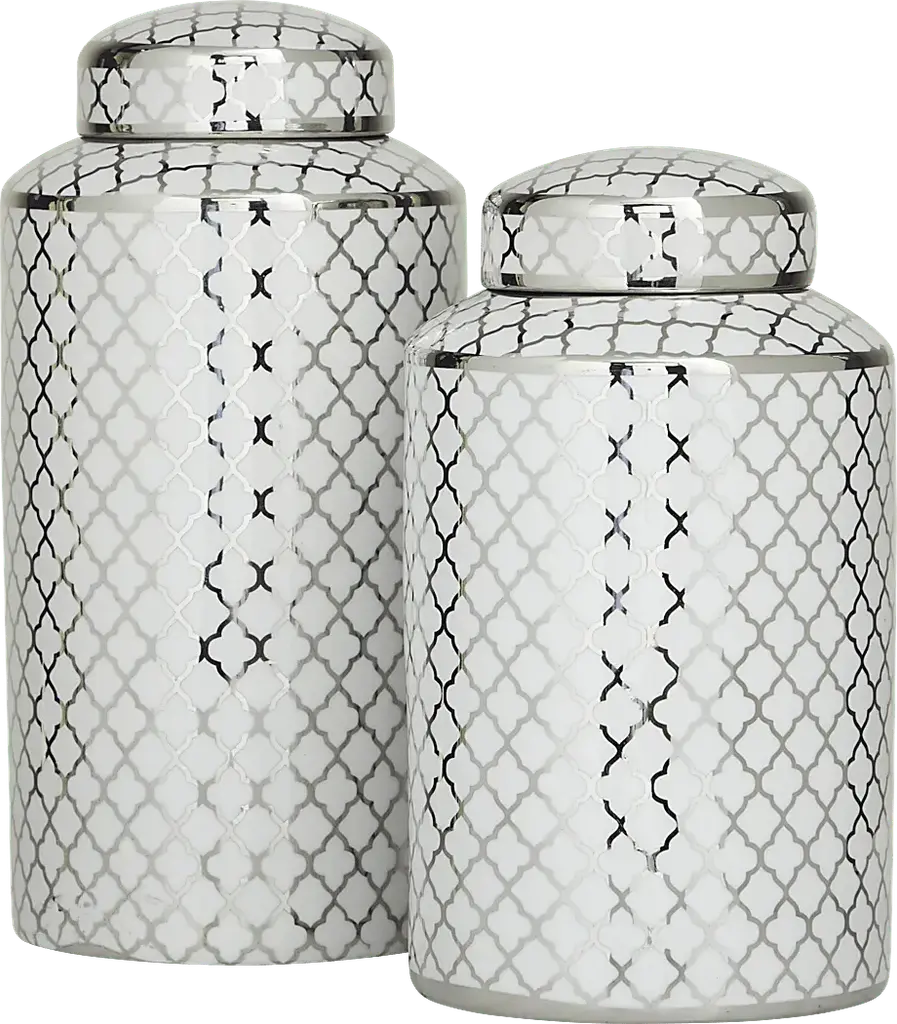 Inspired by sleek elegance and clean lines, this minimalist design reflects effortless luxury through bold, angular details and monochromatic tones. The Sinodo Vase is crafted from durable stoneware, this silver decorative jar set combines long-lasting quality with modern style. Each jar features a glossy silver finish accented by white quatrefoil prints, adding a refined, contemporary touch to any living space. Designed with deep bodies, wide mouth openings, and removable round lids, the set balances function with decorative appeal. It includes two jars measuring 6.95L x 7W x 14.15H and 7.05L x 7.10W x 12H inches, with a combined weight of 6.0 lbs. Customer assembly is required.