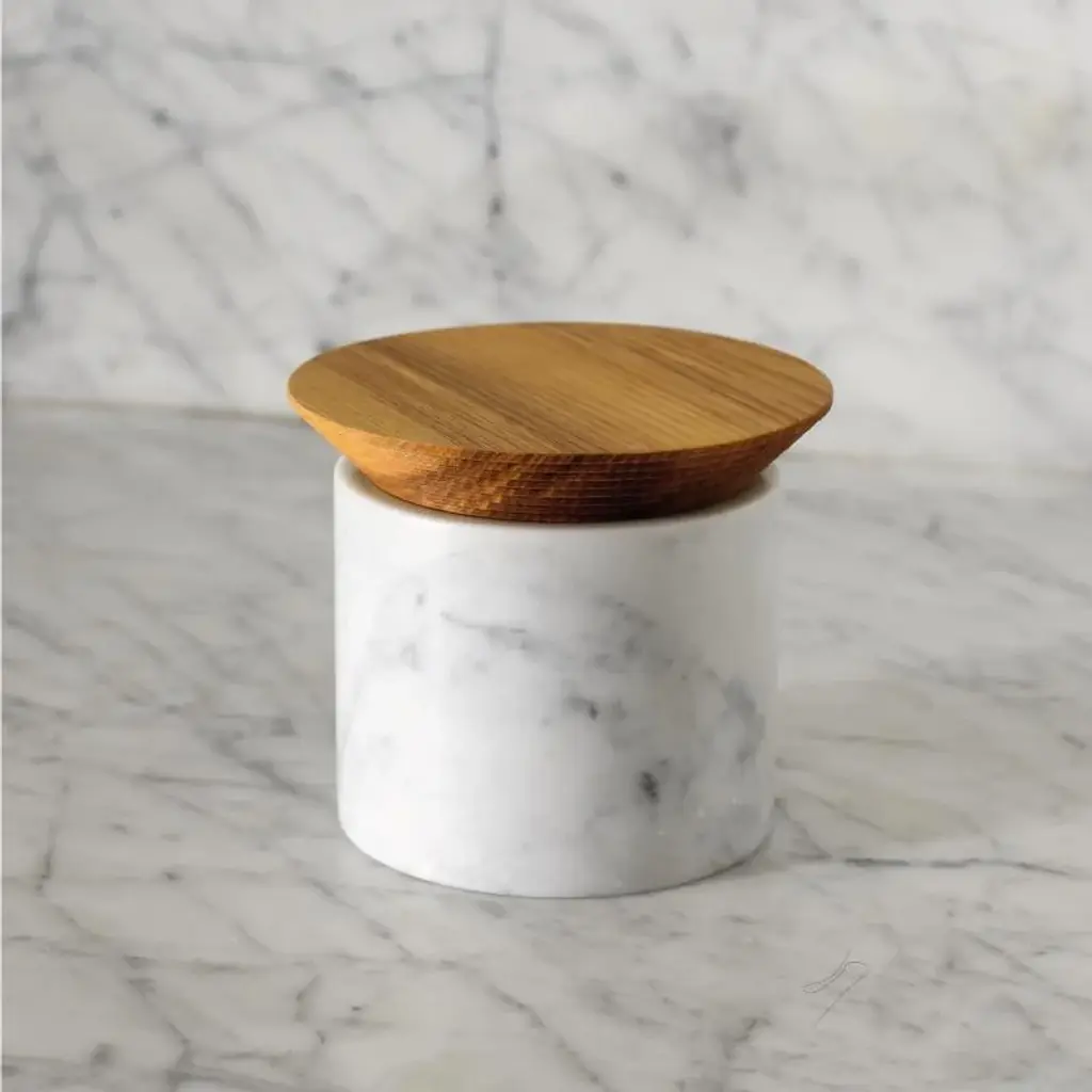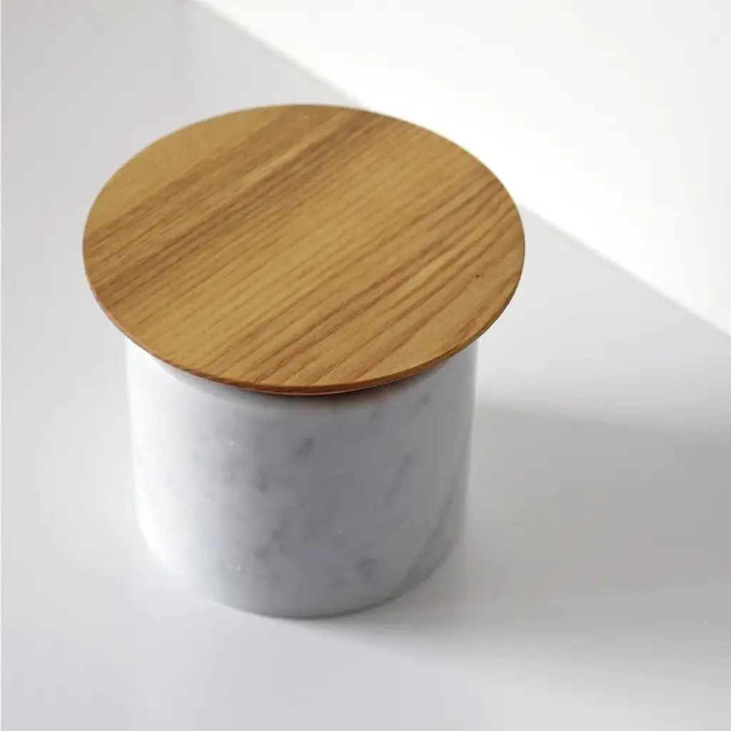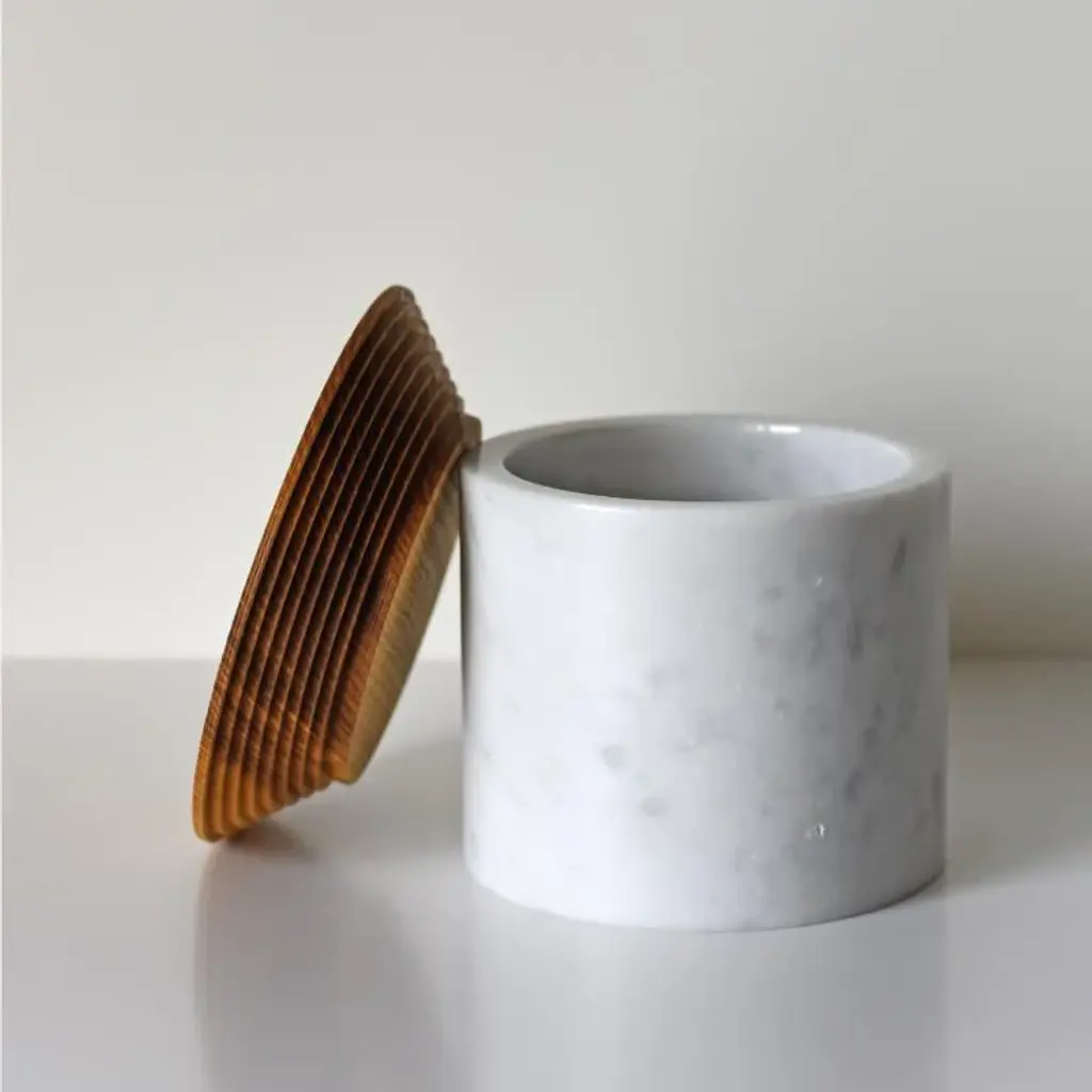 Small container | Isoipsa collection Sculptural piece that can be used as a container or biscuits jar, as well as as a decorative element to enrich a contemporary interior. It has a cylindrical base in Carrara white marble, surmounted by a characteristic overturned pyramid cover, made of ash wood. Signed by Maker