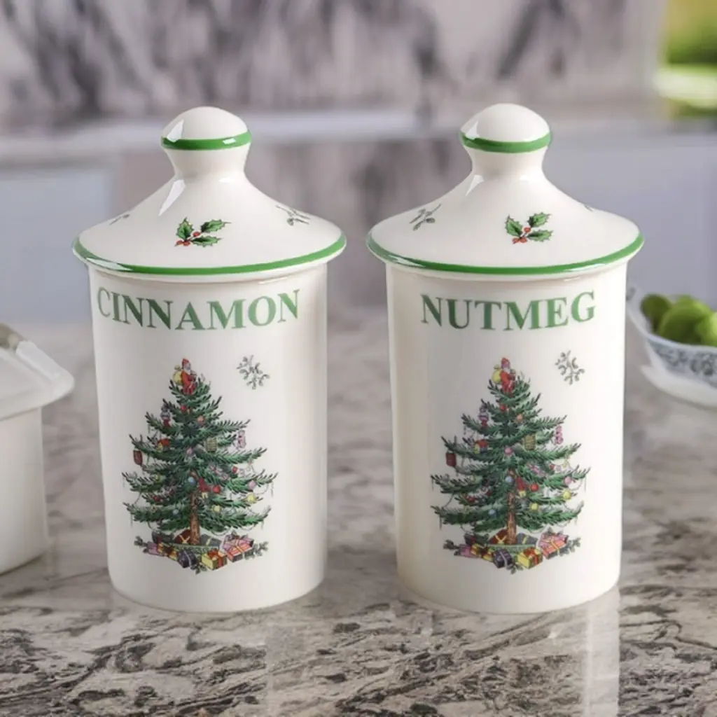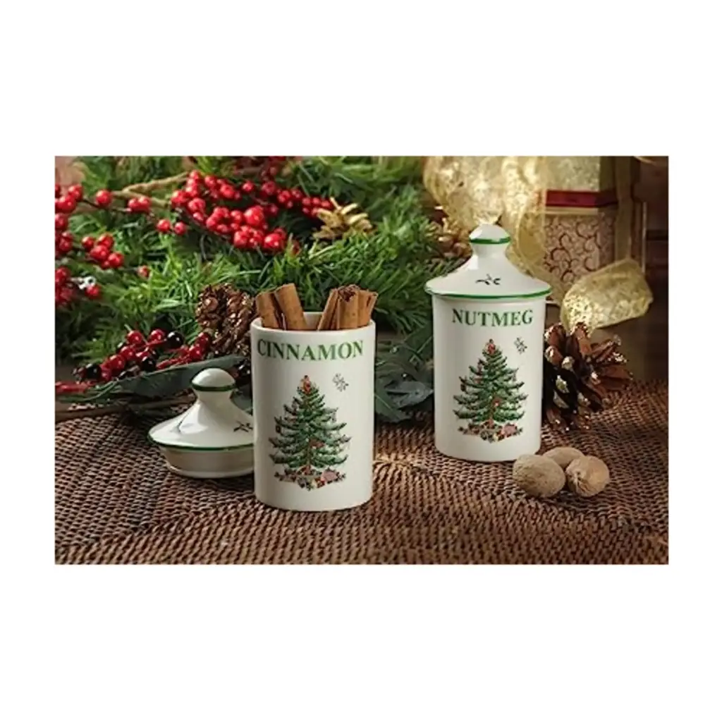 Spode Christmas Tree Spice Jars - Set of 2 Porcelain Jars for Cinnamon & Nutmeg, 4.5 Inch Seasoning Storage Jars, Beautiful Festive Kitchen Decor, Ideal for Holiday Recipes and Organization - NewCelebrate the holiday season with the Spode Christmas Tree Spice Jars, a set of two beautiful porcelain spice jars designed for storing essential holiday spices like cinnamon and nutmeg. These 4.5-inch jars are both functional and decorative, adding a festive touch to your kitchen while keeping your spices fresh and within easy reach. Crafted from fine porcelain, they are designed to last through many holiday seasons, making them a reliable and charming addition to your holiday cooking routine. Each jar in this set features the iconic Spode Christmas Tree design, evoking a nostalgic holiday ambiance that brings warmth to any kitchen. Whether you're preparing festive recipes or simply adding a decorative flair to your countertop, these spice jars will elevate your holiday experience. The compact size makes them easy to store, while the airtight lids ensure your spices retain their flavor, ready to be used in your favorite dishes. The set includes two jars, specifically labeled for cinnamon and nutmeg, making them the perfect companions for holiday baking and cooking. Whether you're using them for yourself or giving them as a thoughtful gift, these spice jars are a must-have for anyone who loves to cook and decorate for the holidays. Designed to keep your kitchen organized and your spices fresh, these spice jars with labels offer the perfect blend of style and functionality. Add a touch of holiday cheer to your home with the timeless charm of Spode's Christmas Tree collection, and make your holiday cooking experience even more delightful with this elegant and practical set.FEATURES:COLOR:MATERIAL:WHAT'S IN THE BOX:PACKAGING:Retail Packaging