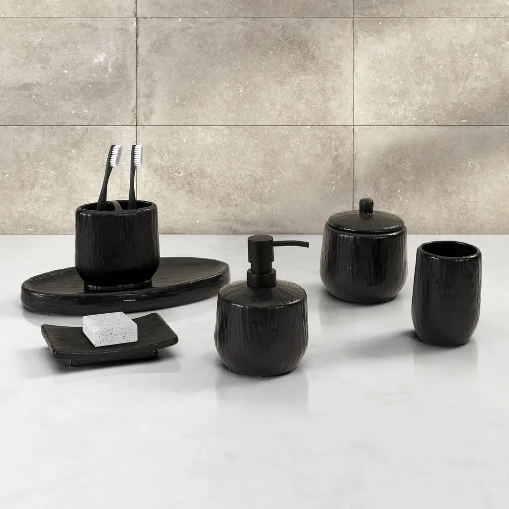 The Stefano bathroom accessories keep your bathroom clean, organized, and coordinate effortlessly with any decor. Made of durable stoneware, the body has a natural texture, and the semi-glaze gives a light sheen. This collection consists of a lotion/soap dispenser, tray, tumbler, toothbrush holder, cotton jar, and soap dish all of which coordinate perfectly with the J. Queen New York bedding and home decor styles. These accessories are available in black, mocha, and cream color options and are easy to wipe clean for long lasting everyday use.