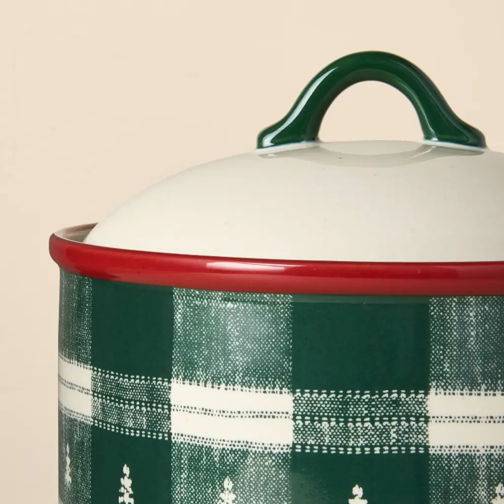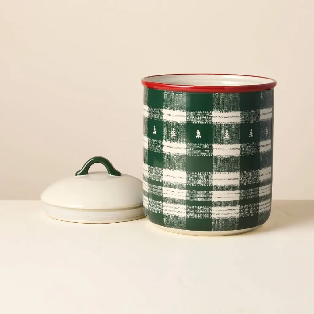 Let your decor show your excitement for Christmas by adding the Stoneware Reactive Glaze Cookie Jar from Hearth & Hand™ with Magnolia. This cookie jar features a red rim as well as a green plaid pattern allover and includes a natural-shade lid with a green handle for a classic holiday appeal. Made of stoneware in a reactive glaze and glossy finish, the rust-resistant jar has a wide mouth for easy removal of cookies. Simply hand wash it for easy cleanup after use.Hearth & Hand™ with Magnolia: Gather • Create • Enjoy