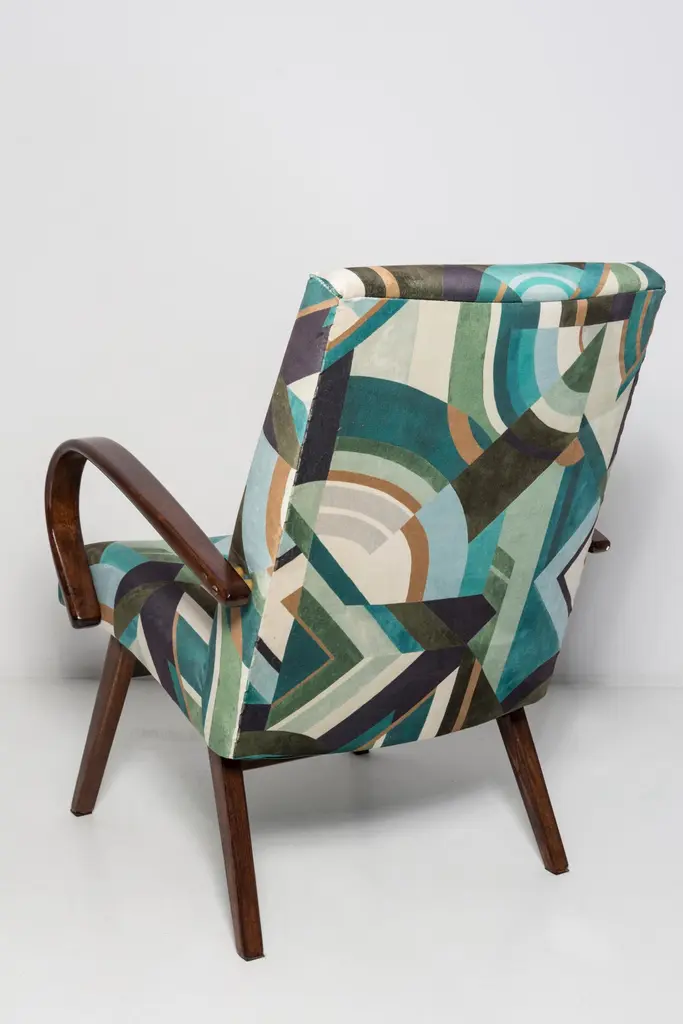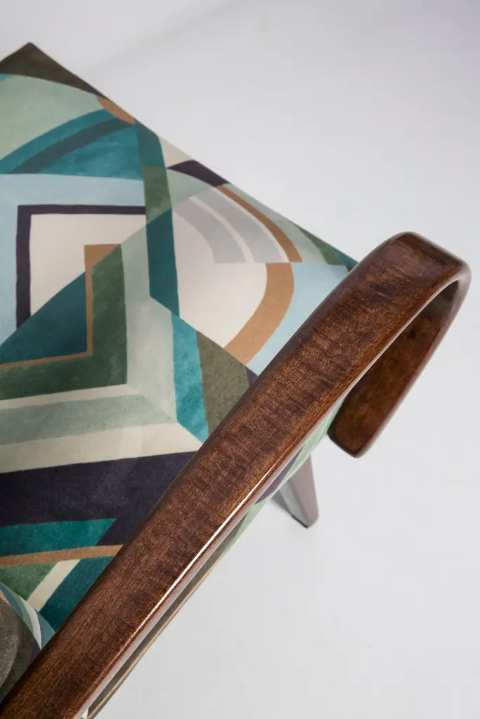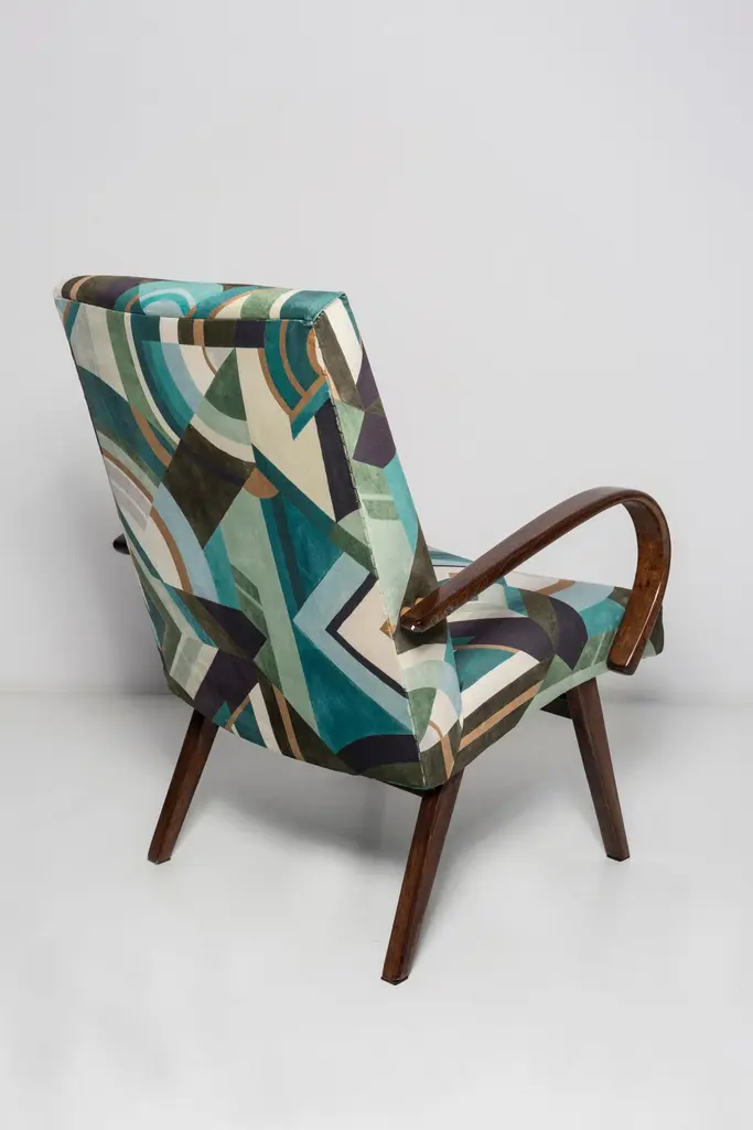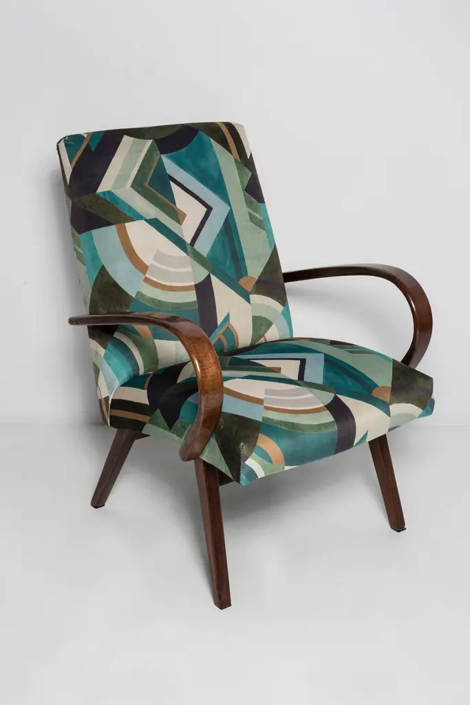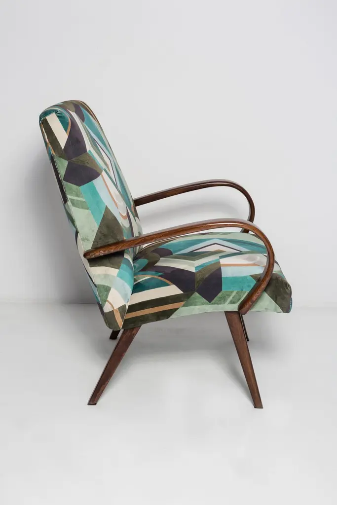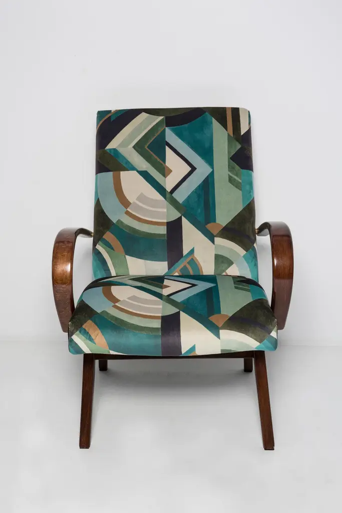A pair of armchairs designed by Jaroslav Šmídek, model 53, produced by TON in Czechoslovakia during the 1960s. These striking examples of mid-century Czech design feature sculptural bentwood armrests and a bold, graphic upholstery that pays homage to the era’s artistic energy.The frames are crafted from solid beechwood, fully restored, and finished with a hand-applied satin matte varnish that highlights the natural grain and character of the wood. The new upholstery is “Convexe” velvet by Casamance – a premium fabric with a geometric, Arty-inspired pattern that combines angular and curved forms in rich, layered colors. The fabric is exceptionally soft to the touch, while also durable and suitable for everyday use.These chairs have been professionally restored and upholstered, ready for immediate use. Their dynamic lines and vivid textile make them statement pieces for any modern or vintage-inspired interior.Custom orders are available upon request. Clients may choose from a wide selection of alternative fabrics and wood finishes. Fabric swatches and wood stain samples can be found at the end of the image gallery.Please note: all custom orders are final and non-returnable.Made in Czechoslovakia. Fully restored.