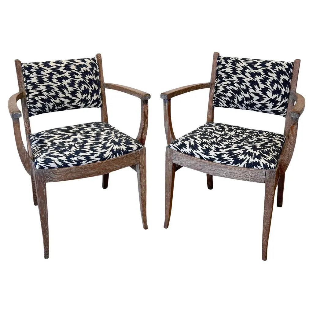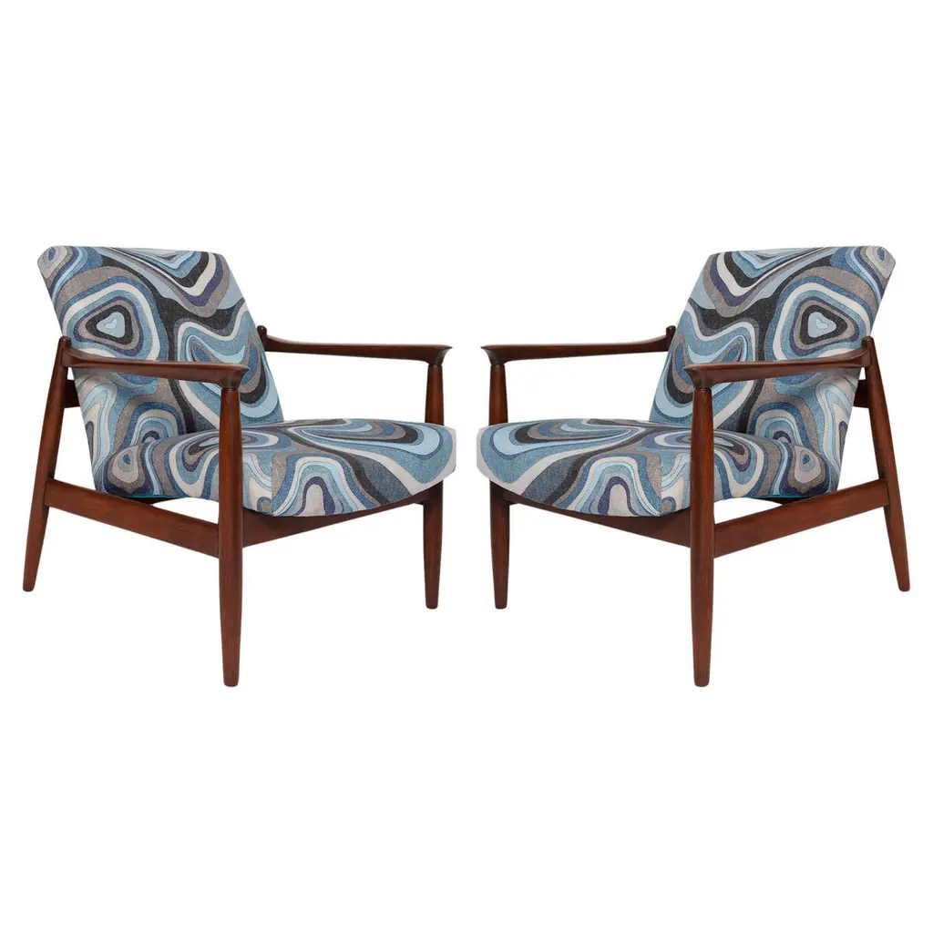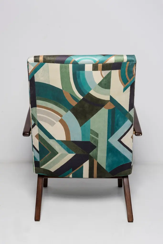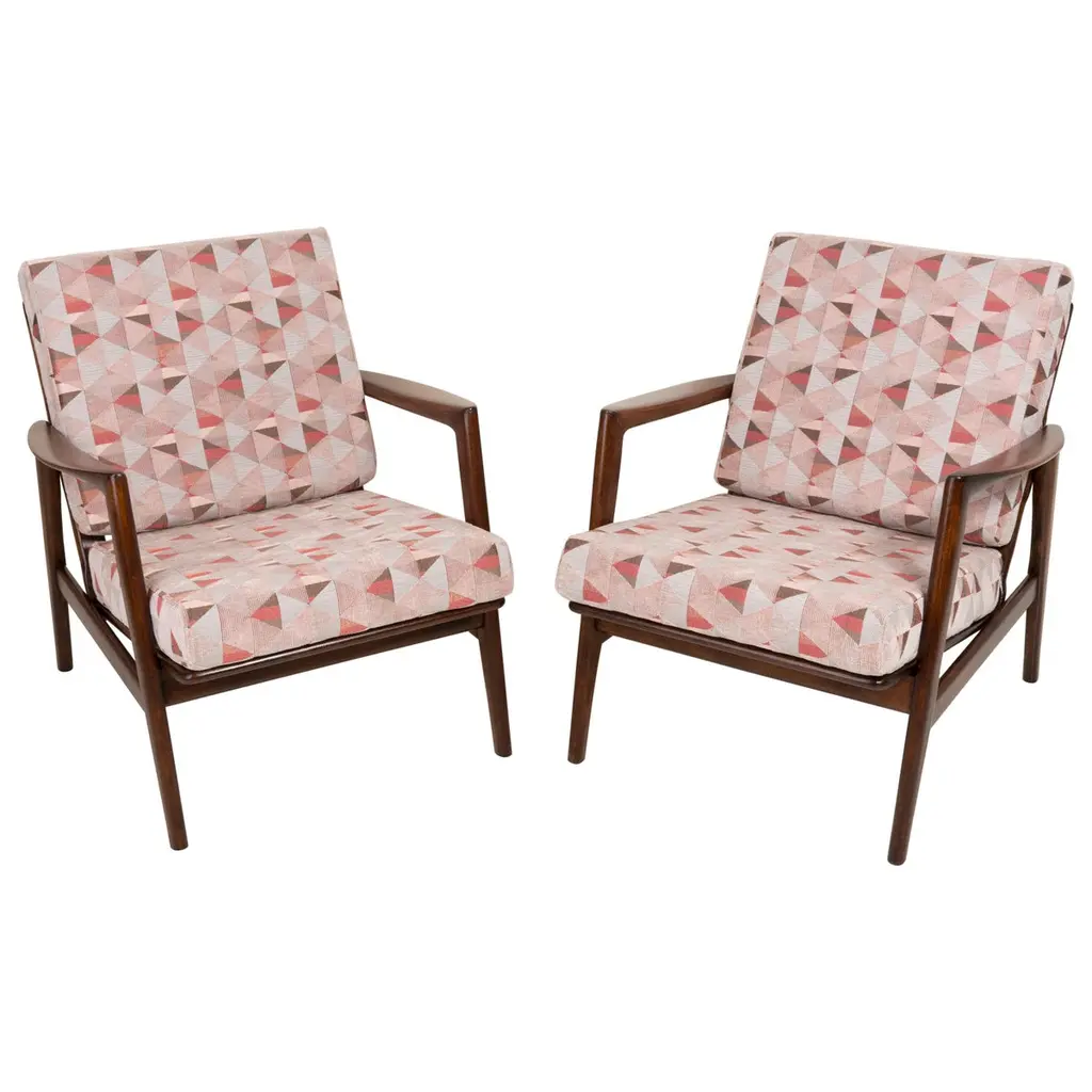 A pair of armchairs designed by Jaroslav Šmídek, model 53, produced by TON in Czechoslovakia during the 1960s. These striking examples of mid-century Czech design feature sculptural bentwood armrests and a bold, graphic upholstery that pays homage to the era’s artistic energy.The frames are crafted from solid beechwood, fully restored, and finished with a hand-applied satin matte varnish that highlights the natural grain and character of the wood. The new upholstery is “Convexe” velvet by Casamance – a premium fabric with a geometric, Arty-inspired pattern that combines angular and curved forms in rich, layered colors. The fabric is exceptionally soft to the touch, while also durable and suitable for everyday use.These chairs have been professionally restored and upholstered, ready for immediate use. Their dynamic lines and vivid textile make them statement pieces for any modern or vintage-inspired interior.Custom orders are available upon request. Clients may choose from a wide selection of alternative fabrics and wood finishes. Fabric swatches and wood stain samples can be found at the end of the image gallery.Please note: all custom orders are final and non-returnable.Made in Czechoslovakia. Fully restored.