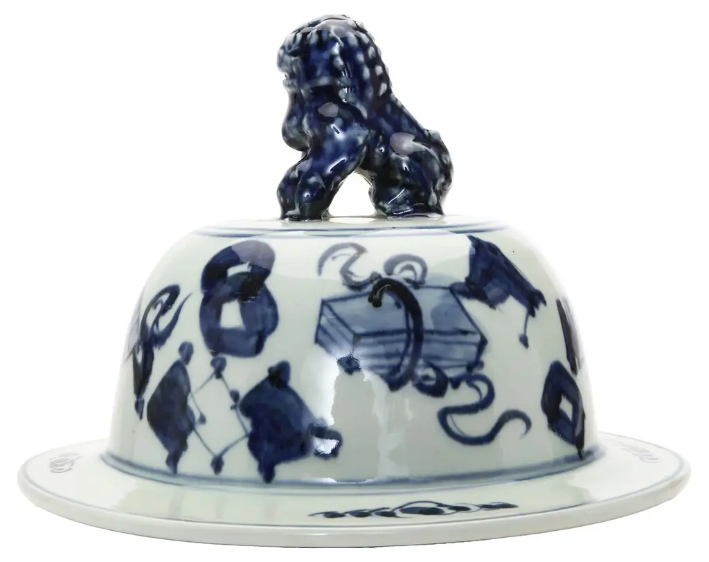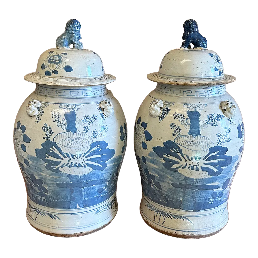The foo dog standing guard on the lid adds to the allure of this porcelain temple jar. More than two feet tall, it's ideal beside a fireplace or an entryway or as part of a larger display.